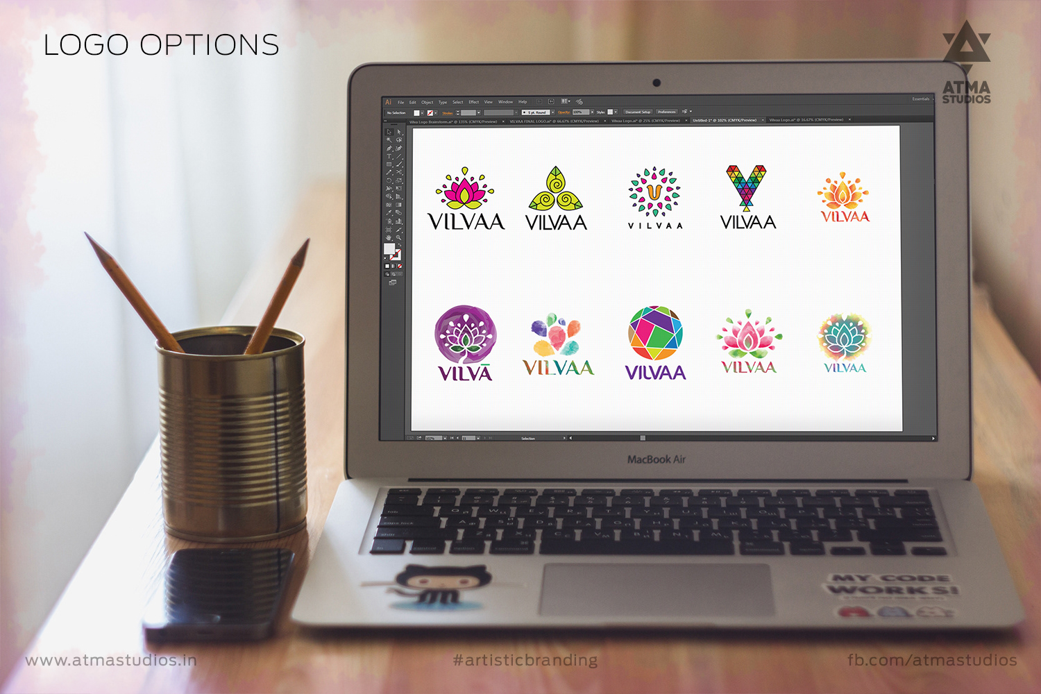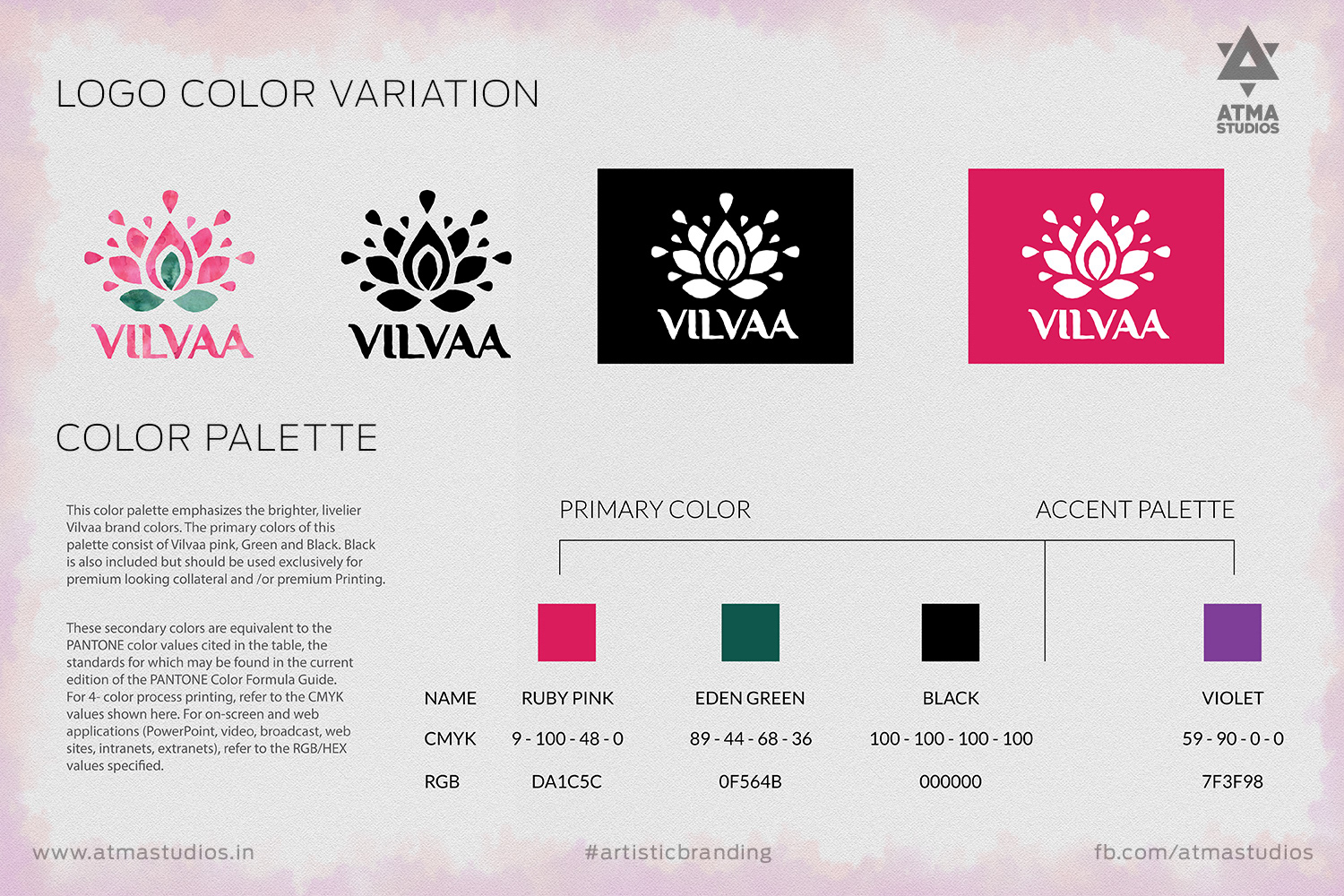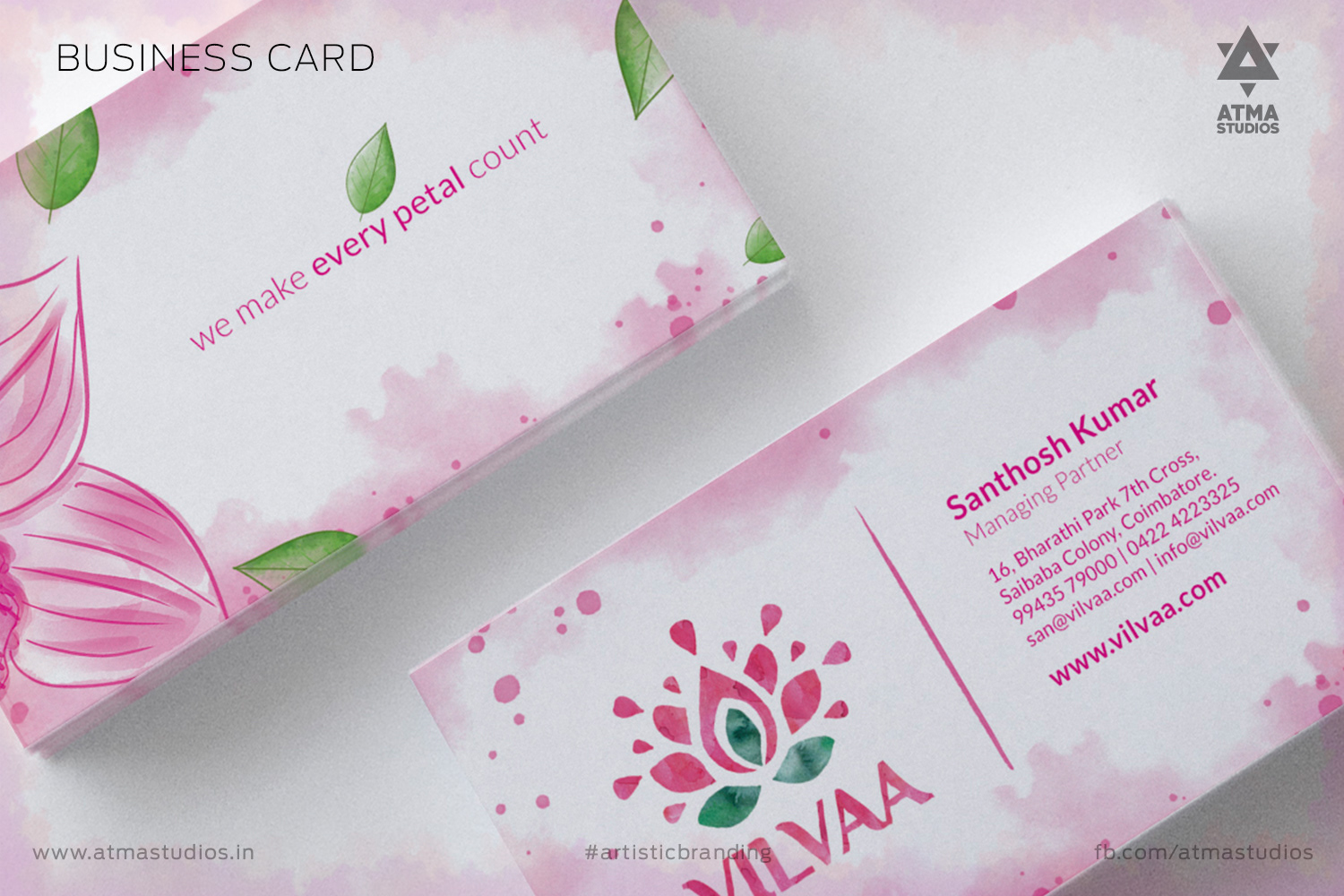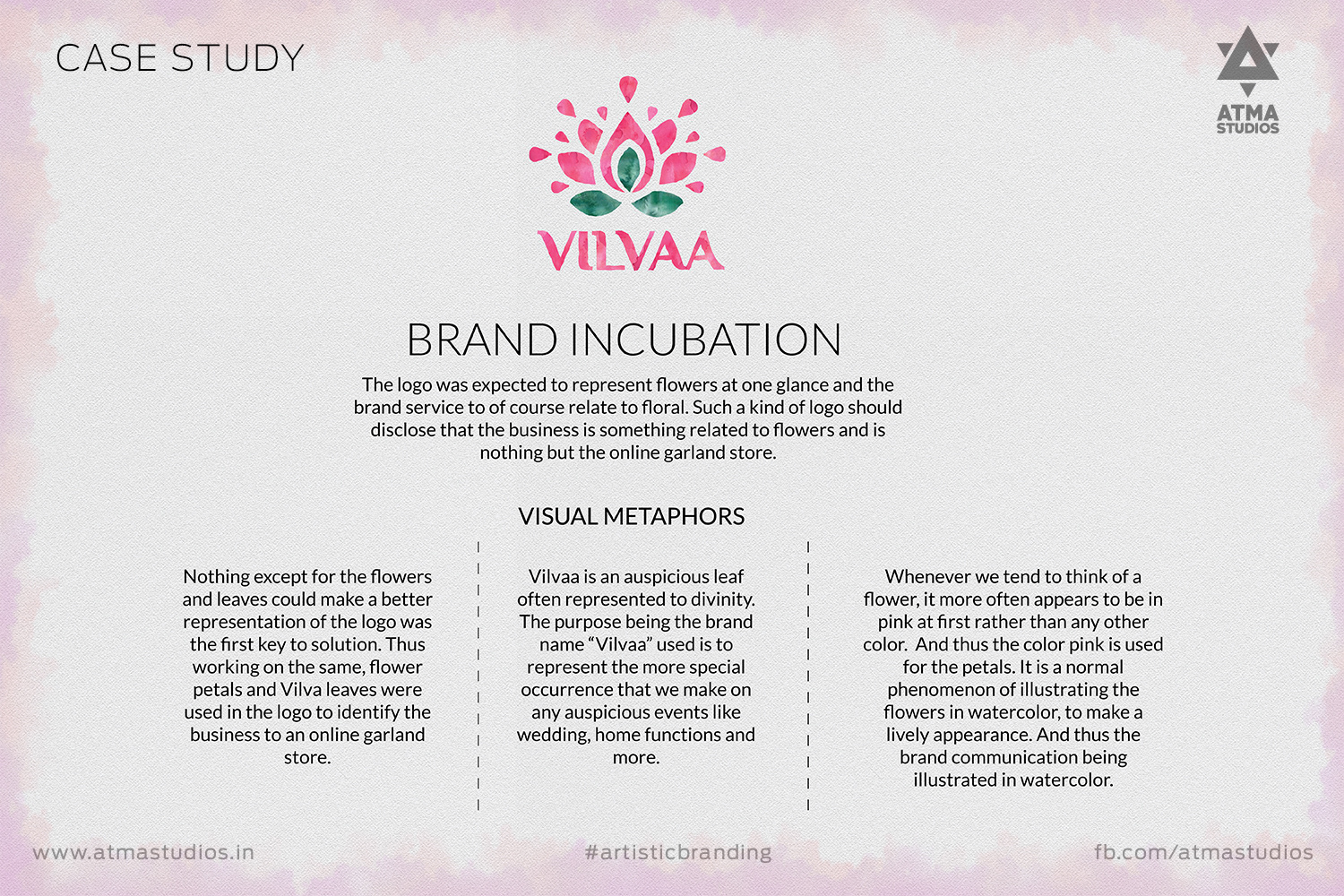 Expectations of the logo The logo was expected to represent flowers at one glance and the brand name to of course relate to floral. Such a kind of logo should disclose that the business is something related to flowers and is nothing but the online garland store. Solution Nothing except for the flowers and leaves could make a better representation of the logo was the first key to solution. Thus working on the same, flower petals and leaves were used in the logo to identify the business to an online garland store. Brand Identity Vilvaa – Vilvaa is an auspicious leaf often represented to divinity. The purpose being the brand name “Vilvaa” used is to represent the more special occurrence that we make on any auspicious events like wedding, home functions and more. Flowers – Whenever we tend to think of a flower, it more often appears to be in pink at first rather than any other color. And thus the color pink is used for the petals. It is a normal phenomenon of illustrating the flowers in watercolor, to make a lively appearance. And thus the logo being illustrated in water color. As known that the leaves are the food factory of the plant, it is more essential that the leaves play an important role for the flowers to blossom. Also said that the garlands look more elegant with both the flowers and leaves being the attractive combination of colors. And so is the leaves in the middle of the logo.