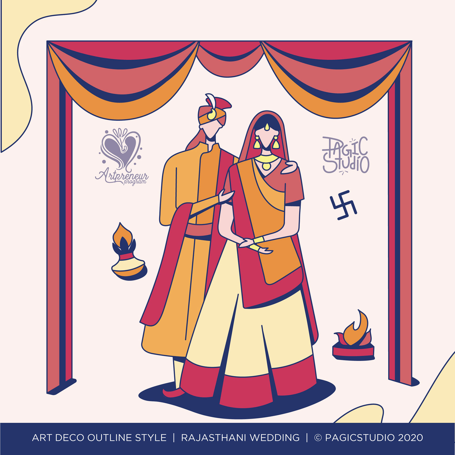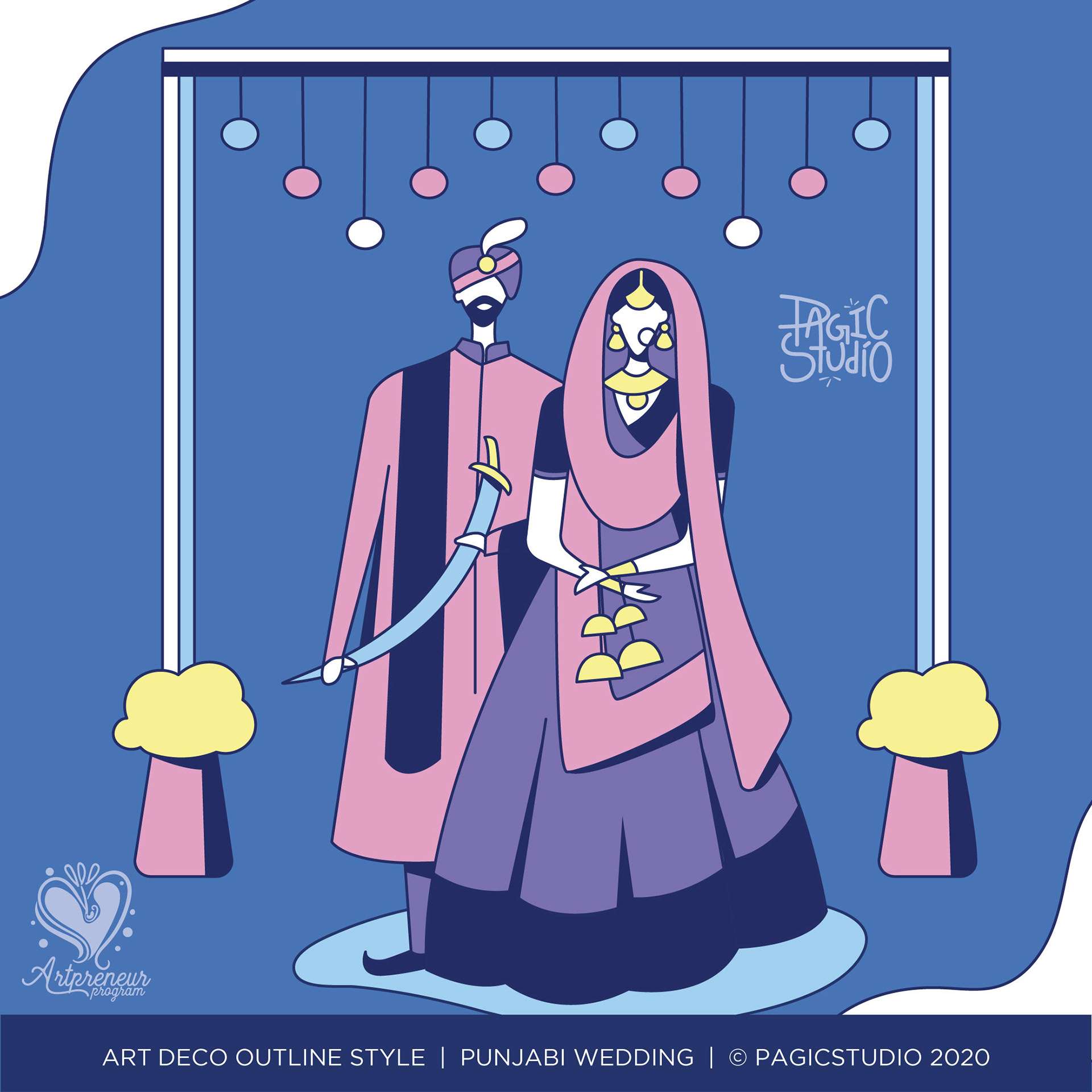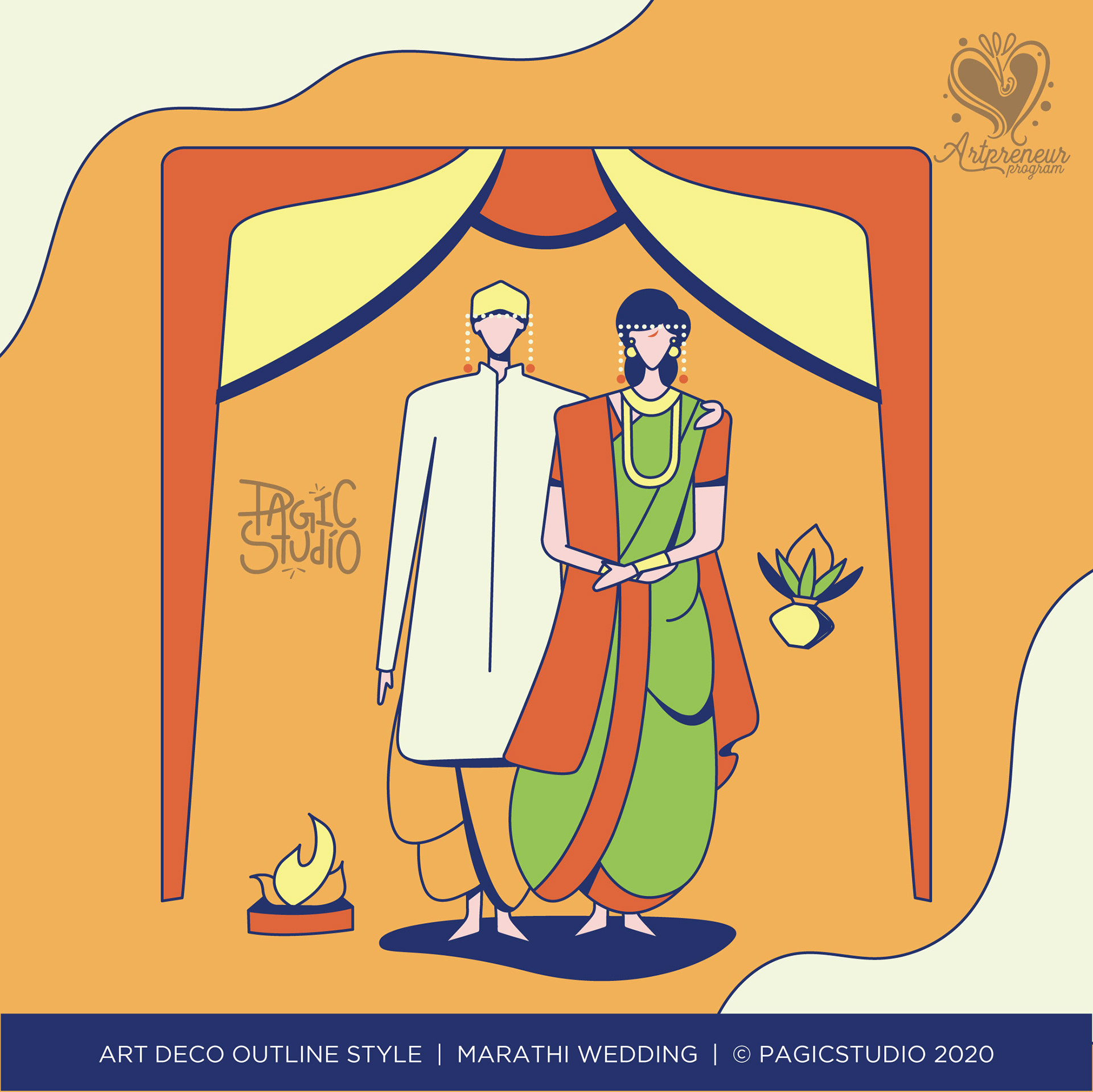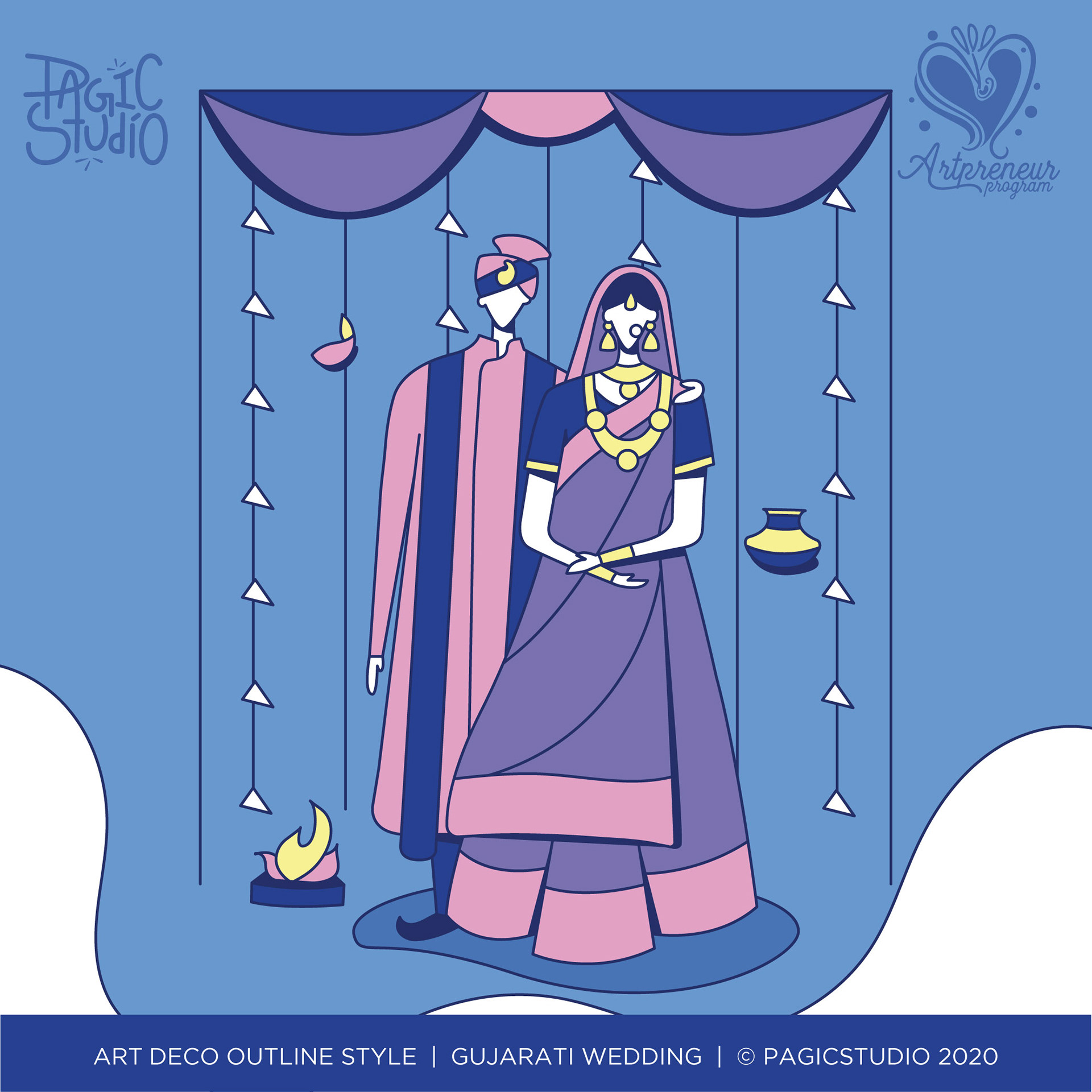 12 Indian Wedding Couple Illustration - Art Deco Outline Style