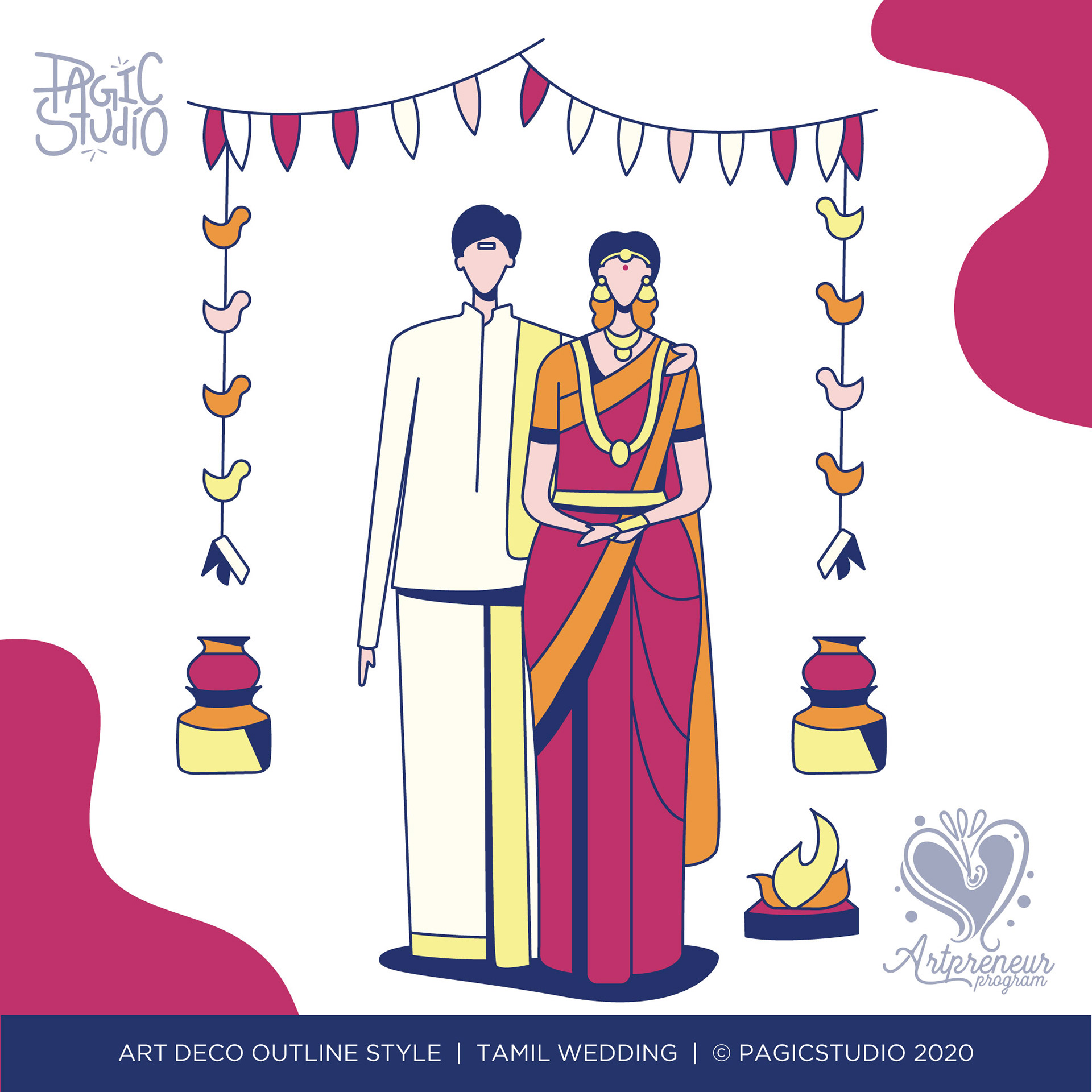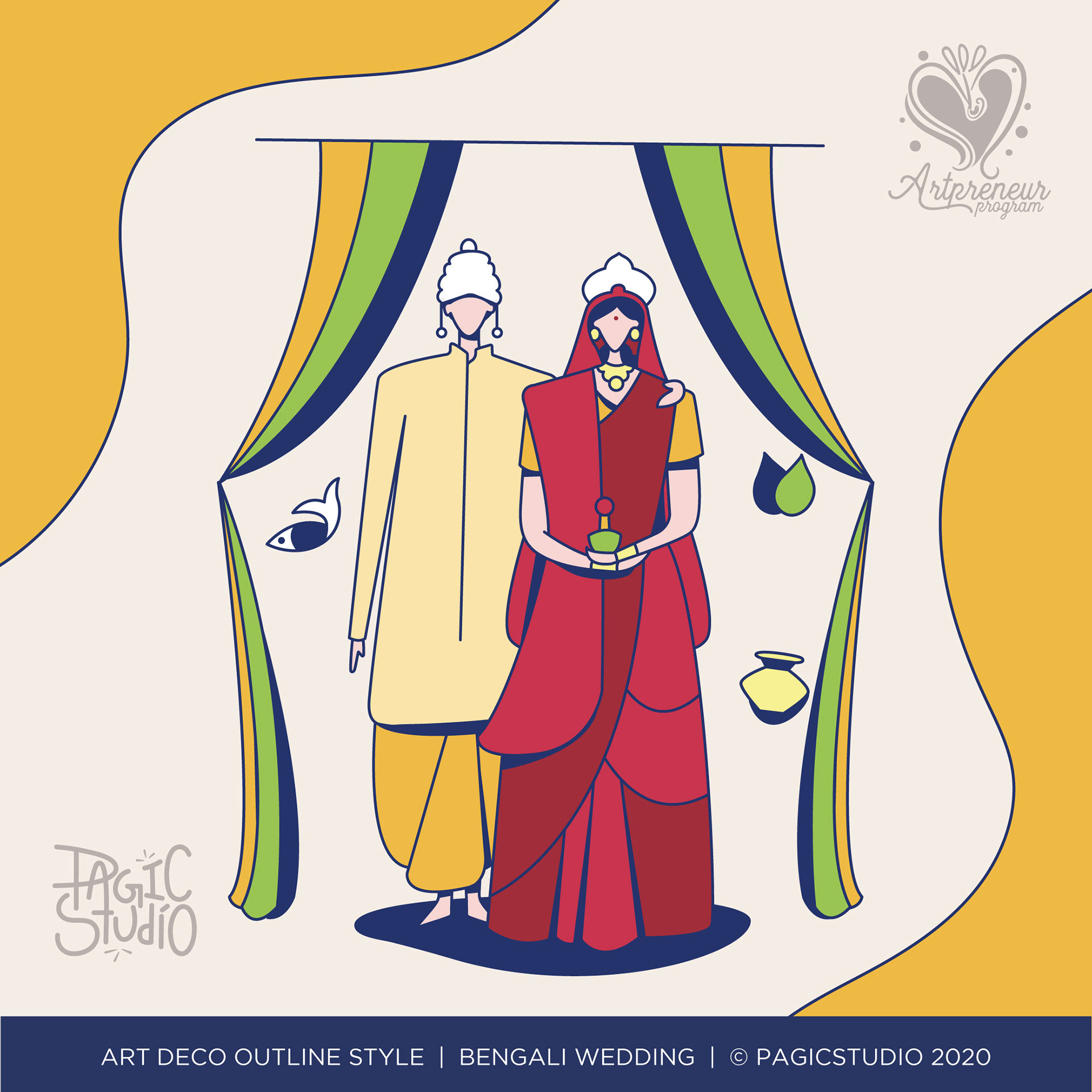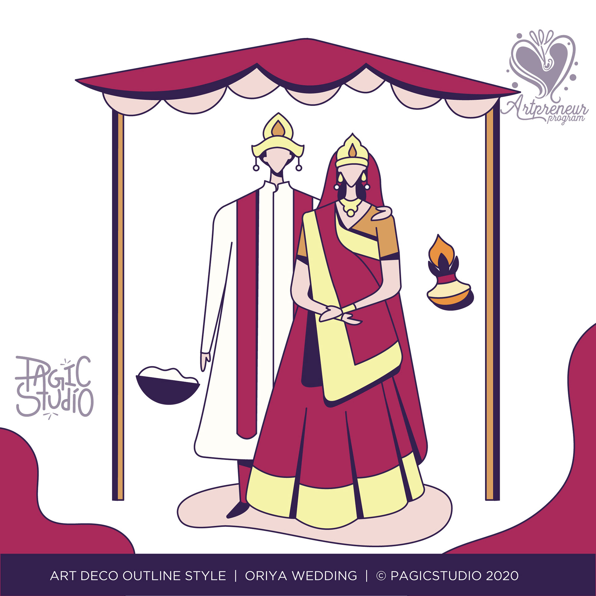 12 Indian Wedding Couple Illustration - Art Deco Outline Style