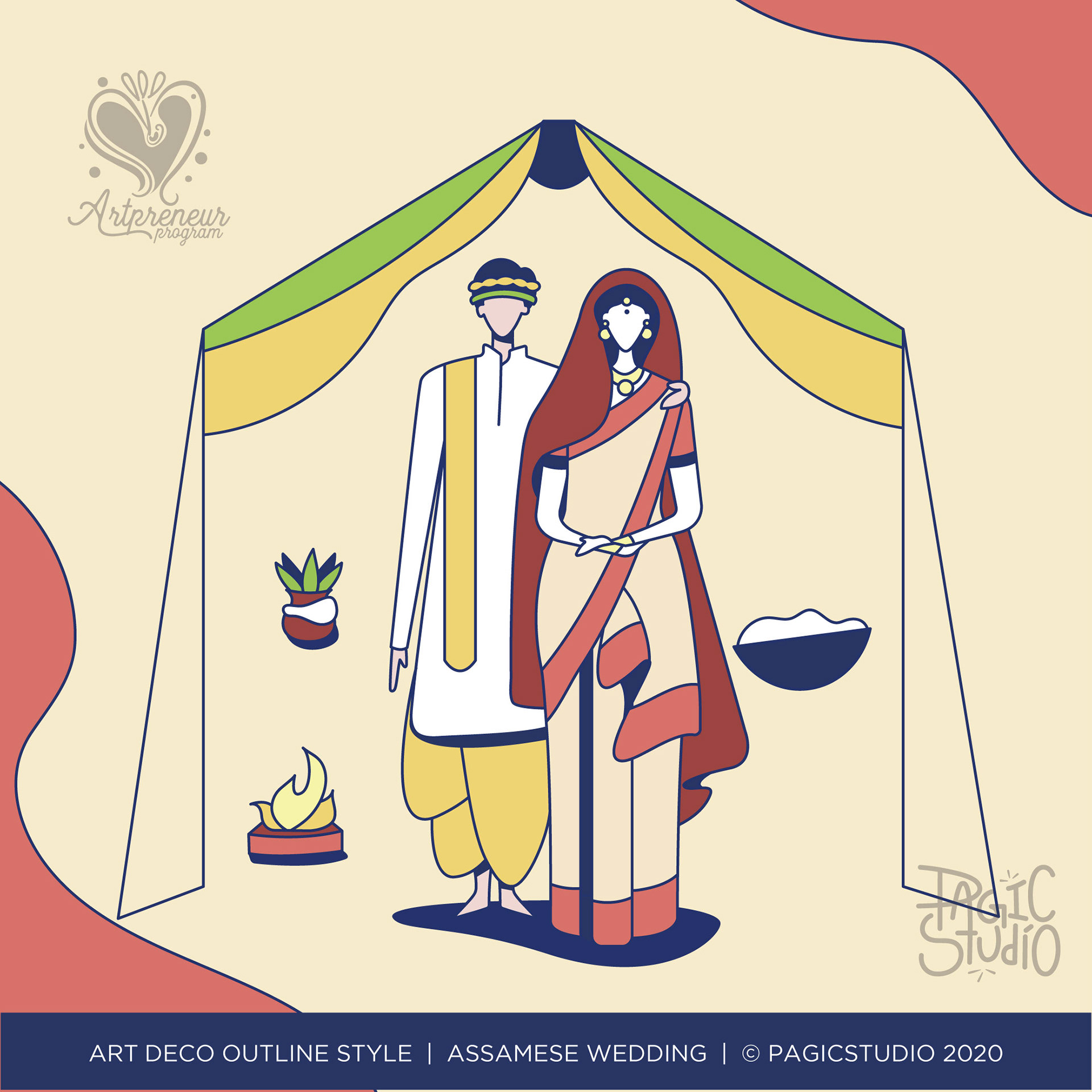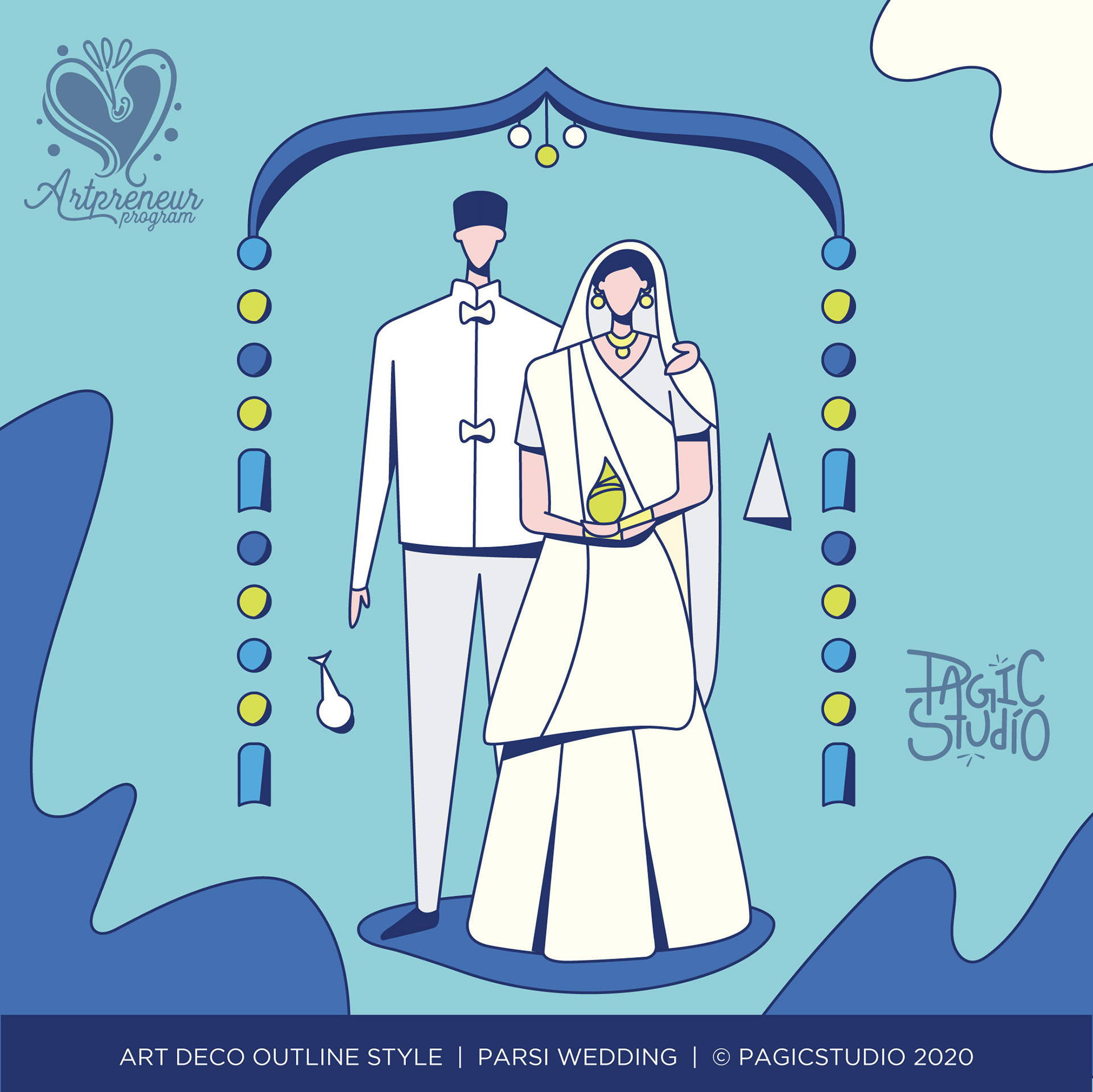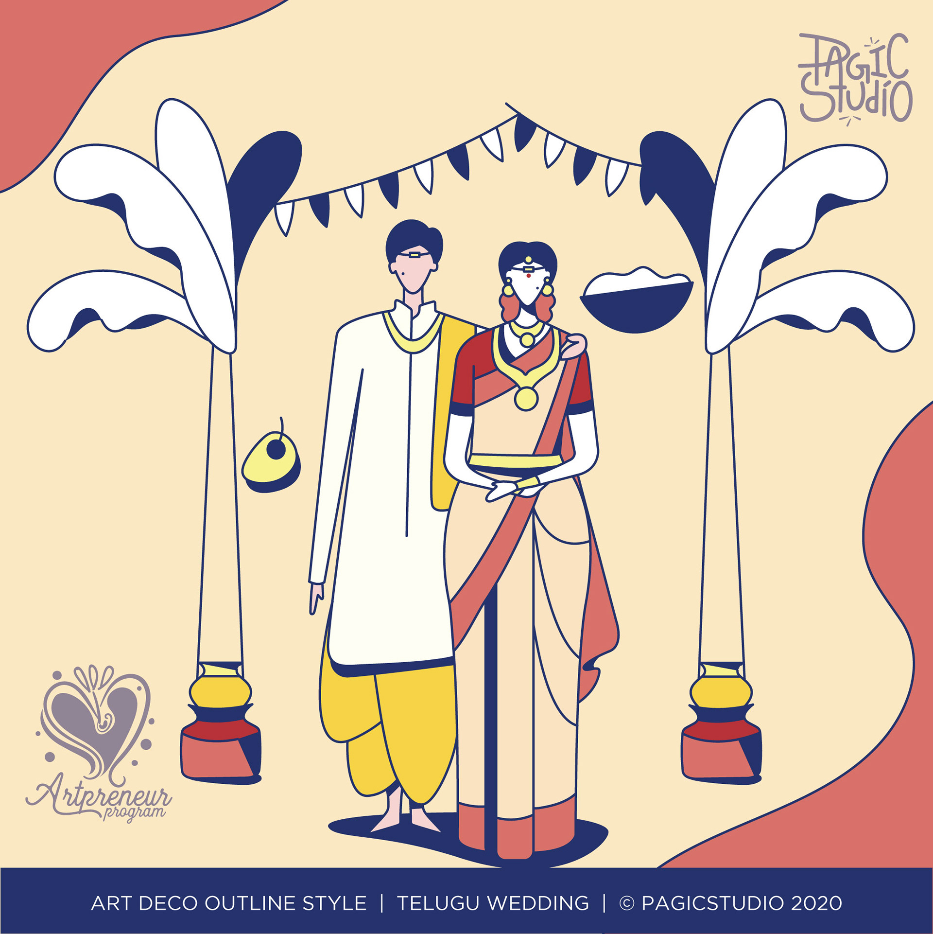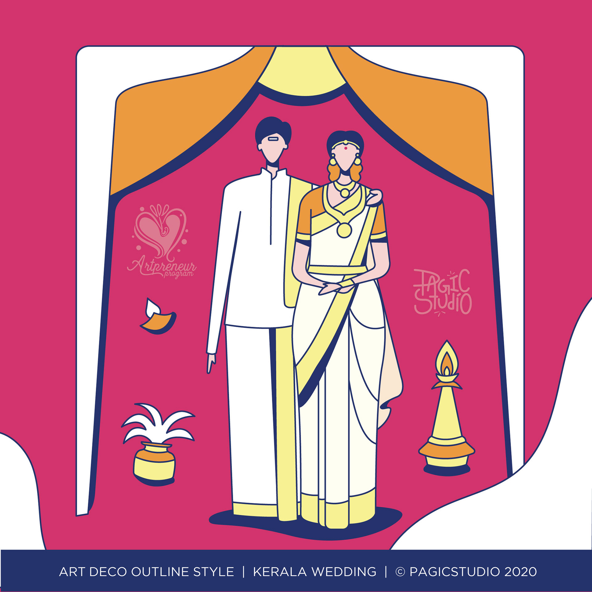12 Indian Wedding Couple Illustration - Art Deco Outline Style