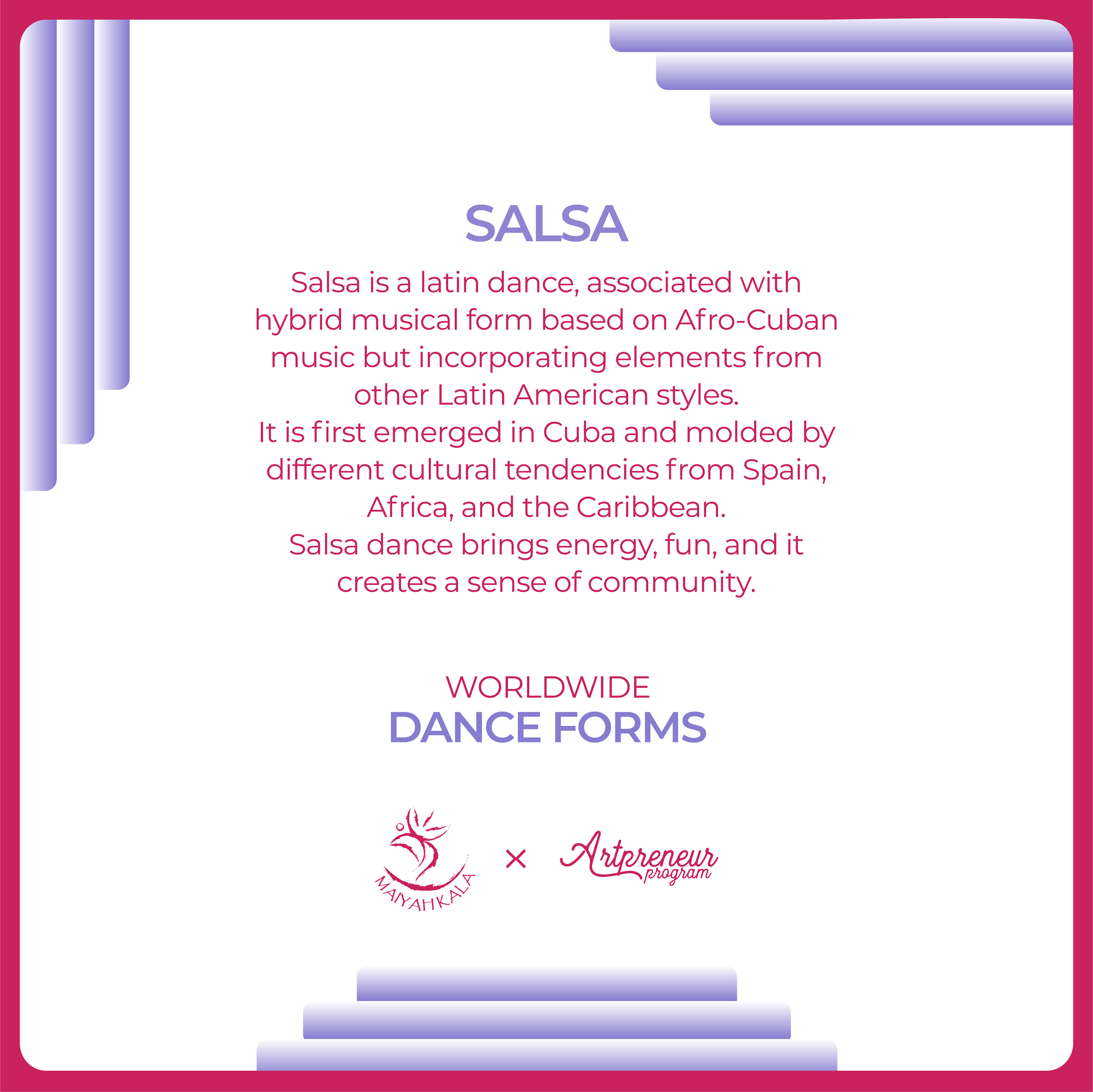 "Salsa" is a latin dance, associated with hybrid musical form based on Afro-Cuban music but incorporating elements from other Latin American styles.