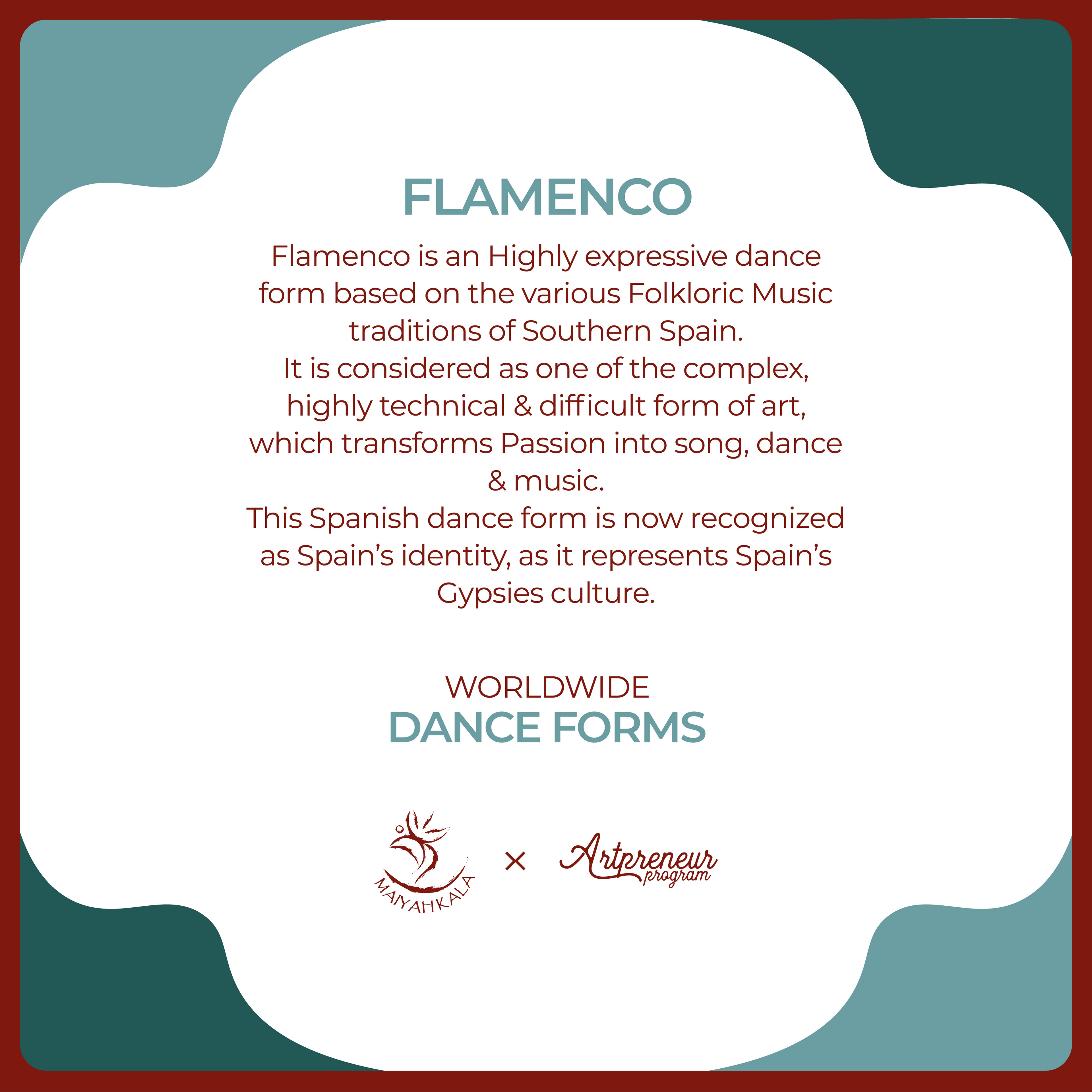 "Flamenco" is an Highly expressive dance form based on the various Folkloric Music traditions of Southern Spain.