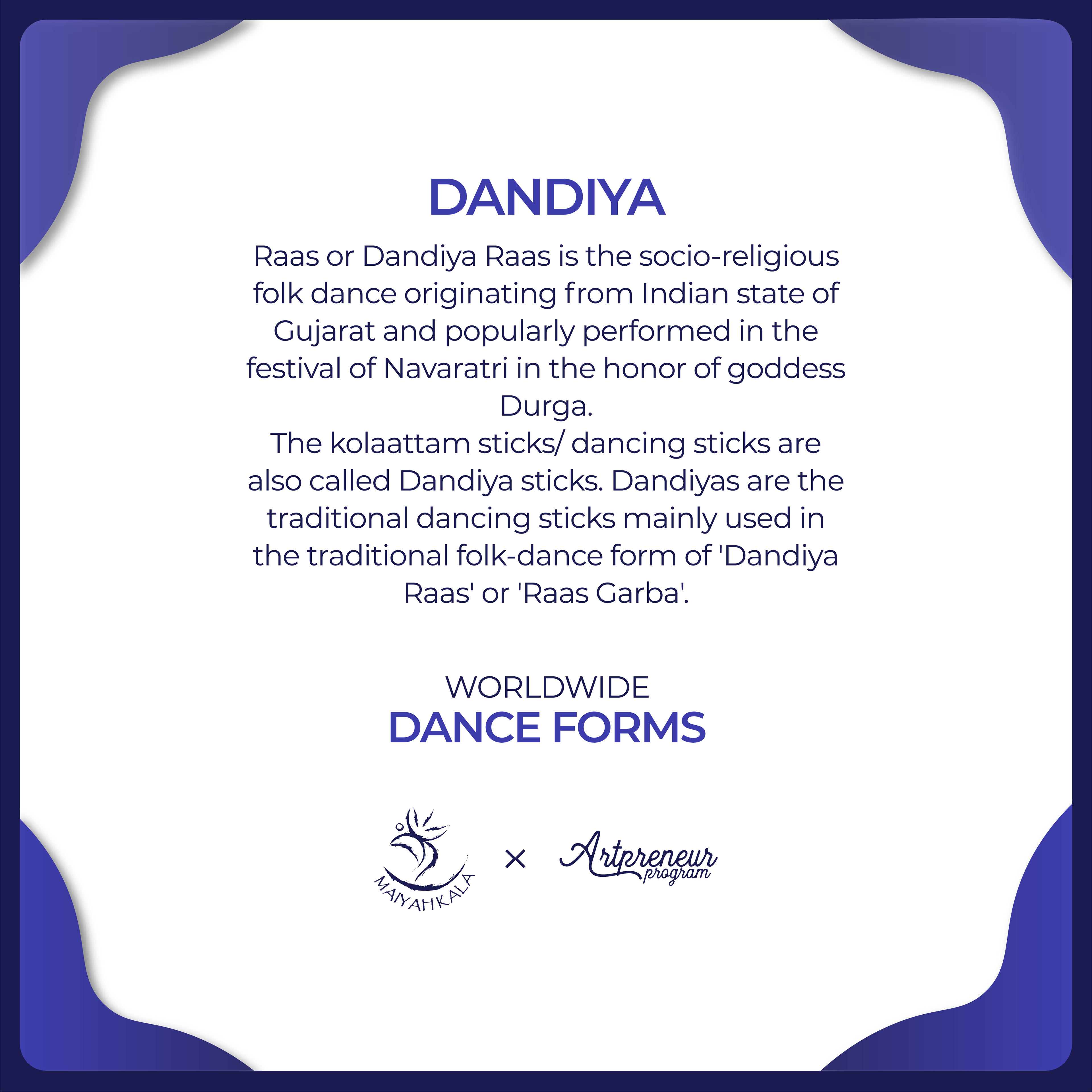 'Dandiya Raas' or 'Raas' is the socio-religious folk dance originating from Indian state of Gujarat and popularly performed in the festival of Navaratri in the honor of goddess Durga.