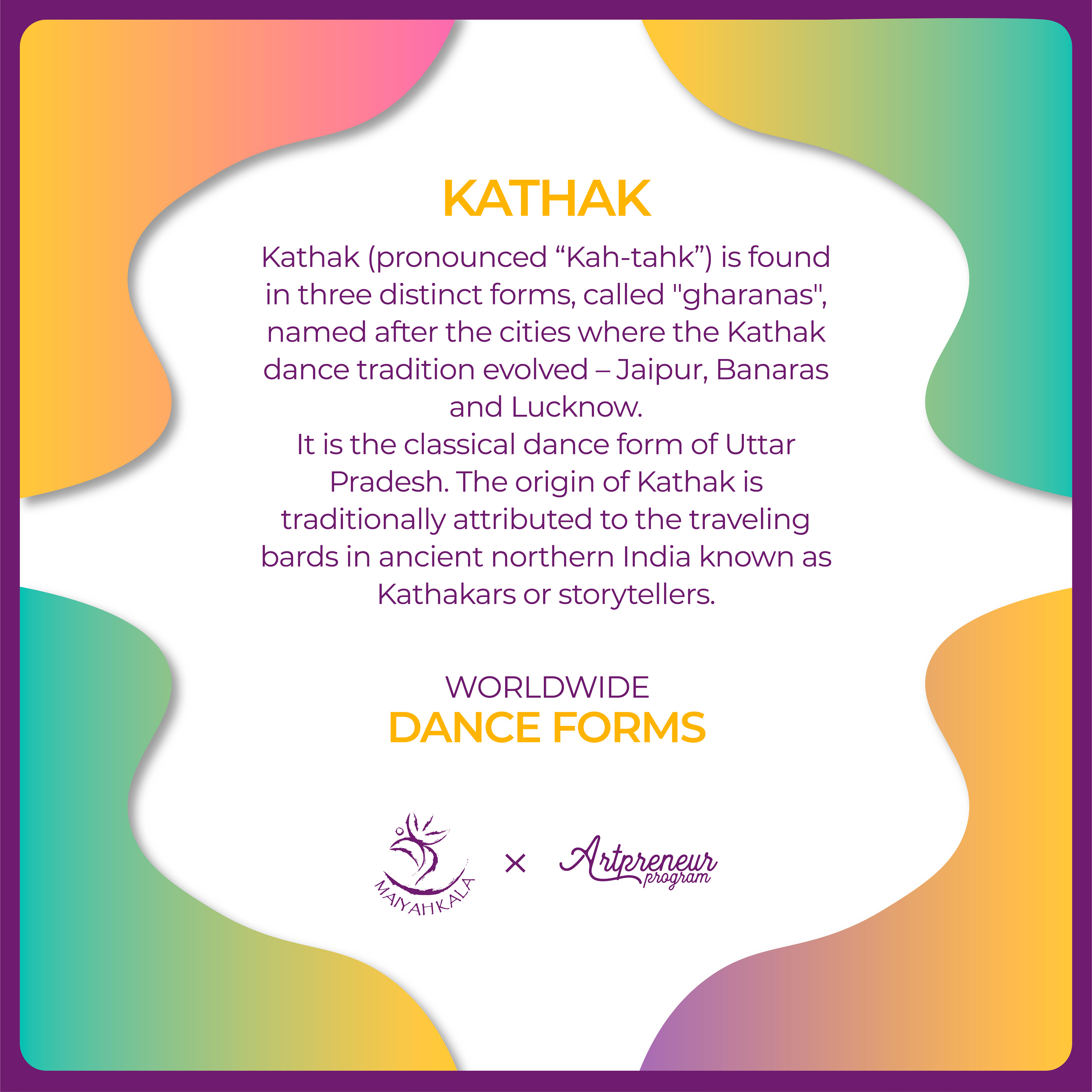 "Kathak" (pronounced “Kah-tahk”) is found in three distinct forms, called "gharanas", named after the cities where the Kathak dance tradition evolved – Jaipur, Banaras and Lucknow.