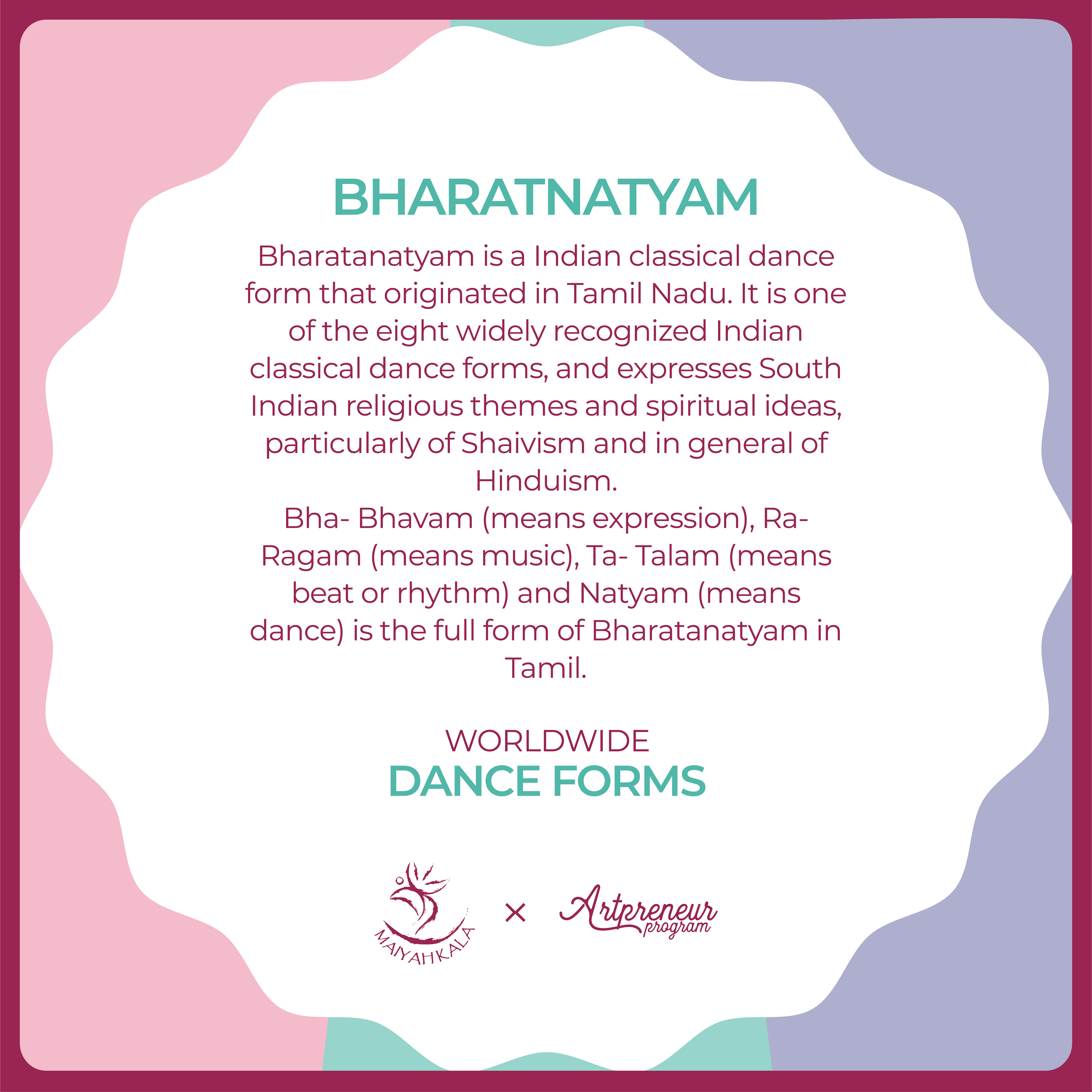 Bha- Bhavam (means expression), Ra- Ragam (means music), Ta- Talam (means beat or rhythm) and Natyam (means dance) is the full form of Bharatanatyam in Tamil.