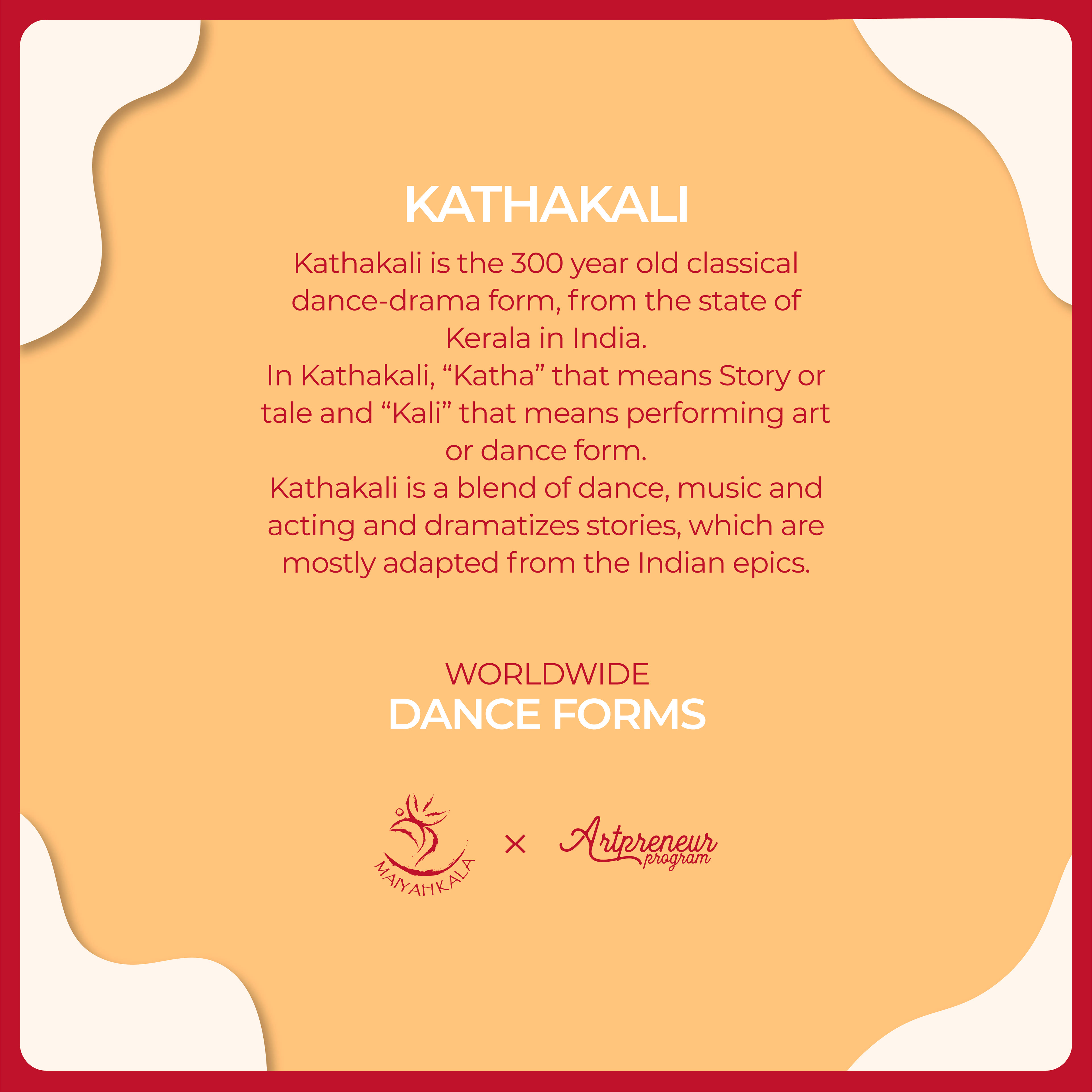 In Kathakali, “Katha” that means Story or tale and “Kali” that means performing art or dance form.