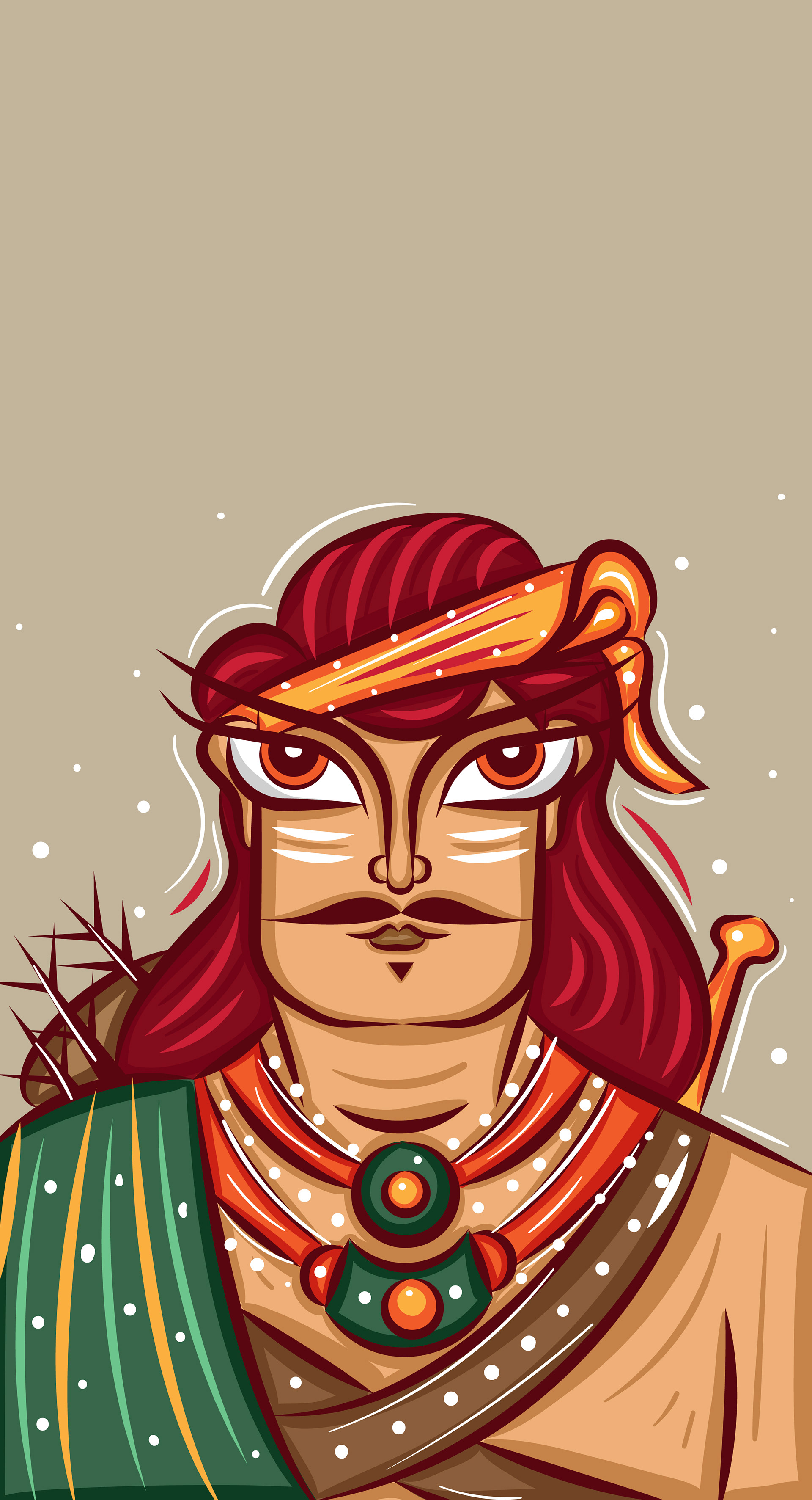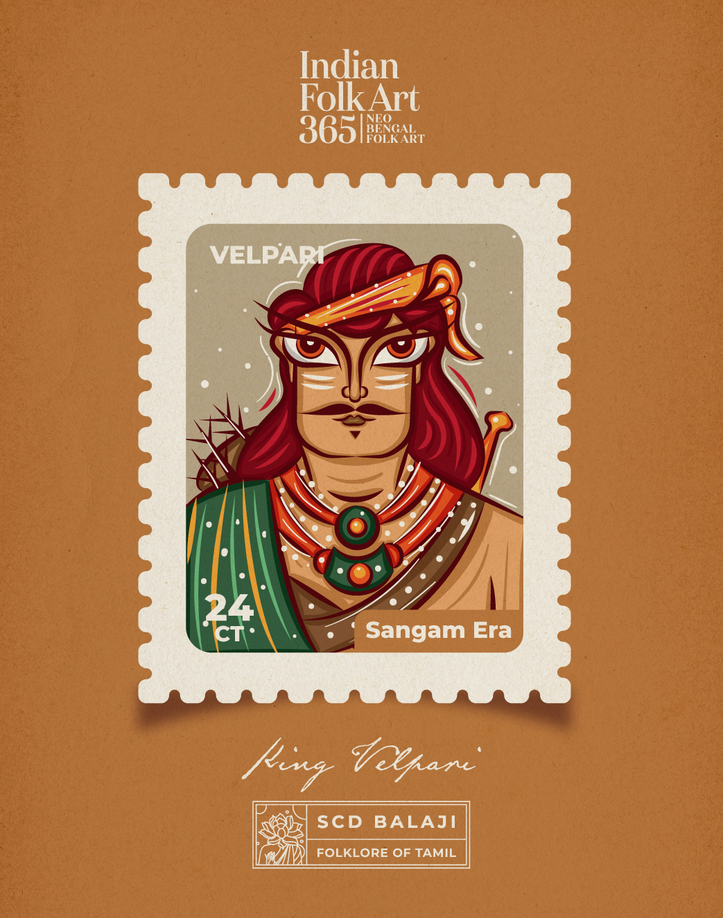 Discover the captivating story of Velpari, the ancient Tamil ruler of Parambu nādu. He was known for his benevolence, patronage of art and literature, and was remembered as one of the Kadai ēzhu vallal (the last seven great patrons) in Tamil literature. Despite the expansion of the Cheras, Cholas and Pandyas, Velpari refused to give in to their siege and his bravery in the face of adversity is a testament to his unwavering spirit. Velpari's generosity and kindness was so great that he even gave away his chariot to support a struggling plant. Despite a long and arduous war, enemies begged for Velpari's life, and he chose to sacrifice himself with a sword. This illustration celebrates the life and legacy of Velpari, a true patron of the arts and a symbol of Tamil heritage.