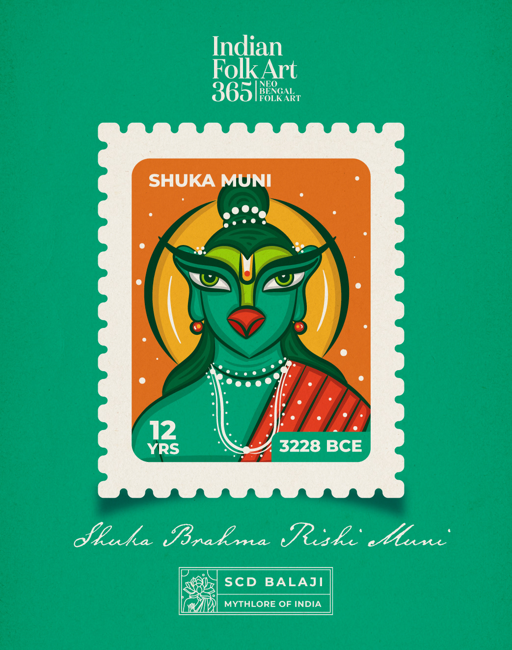 Born as a parrot, Shuka overheard Lord Shiva revealing the secret of immortality. Fearing for his life, he fled into the womb of Vyasa's wife. After 12 years of bearing the burden, Lord Krishna arrived and granted Shuka the freedom from attachment and eligibility for moksha.