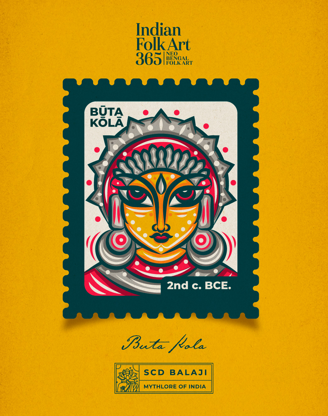 "Introducing my latest creation - a stunning Neo Bengal Folk Art Portrait of a Buta Kola Dancer! 🎨🌟 Buta Kola is a traditional folk art form from the coastal region of Karnataka, India. It's a unique blend of dance, music, and drama, often performed during religious festivals and other cultural celebrations. The performers, known as Buta Kola artists, wear elaborate costumes and masks that represent different characters from Hindu mythology.