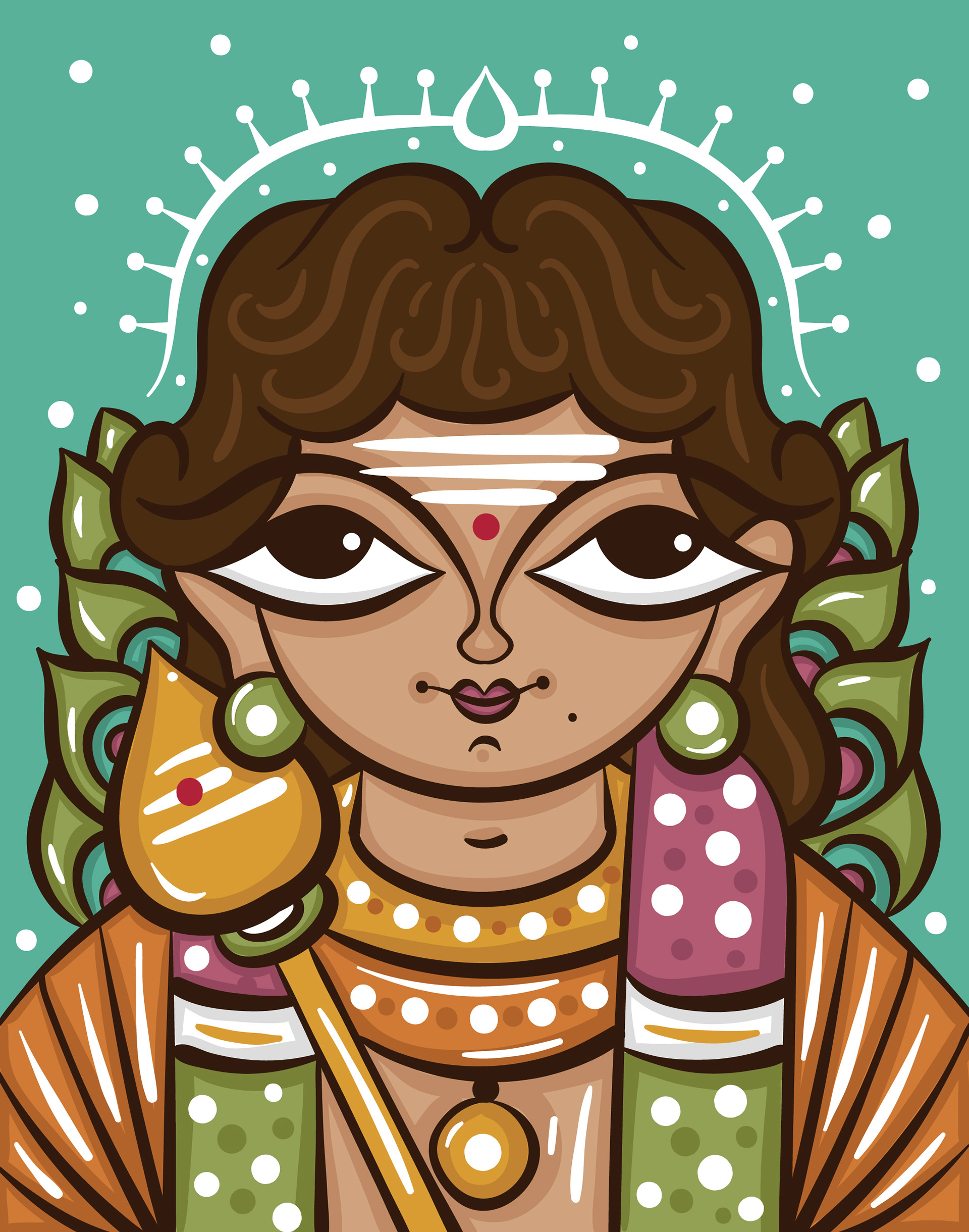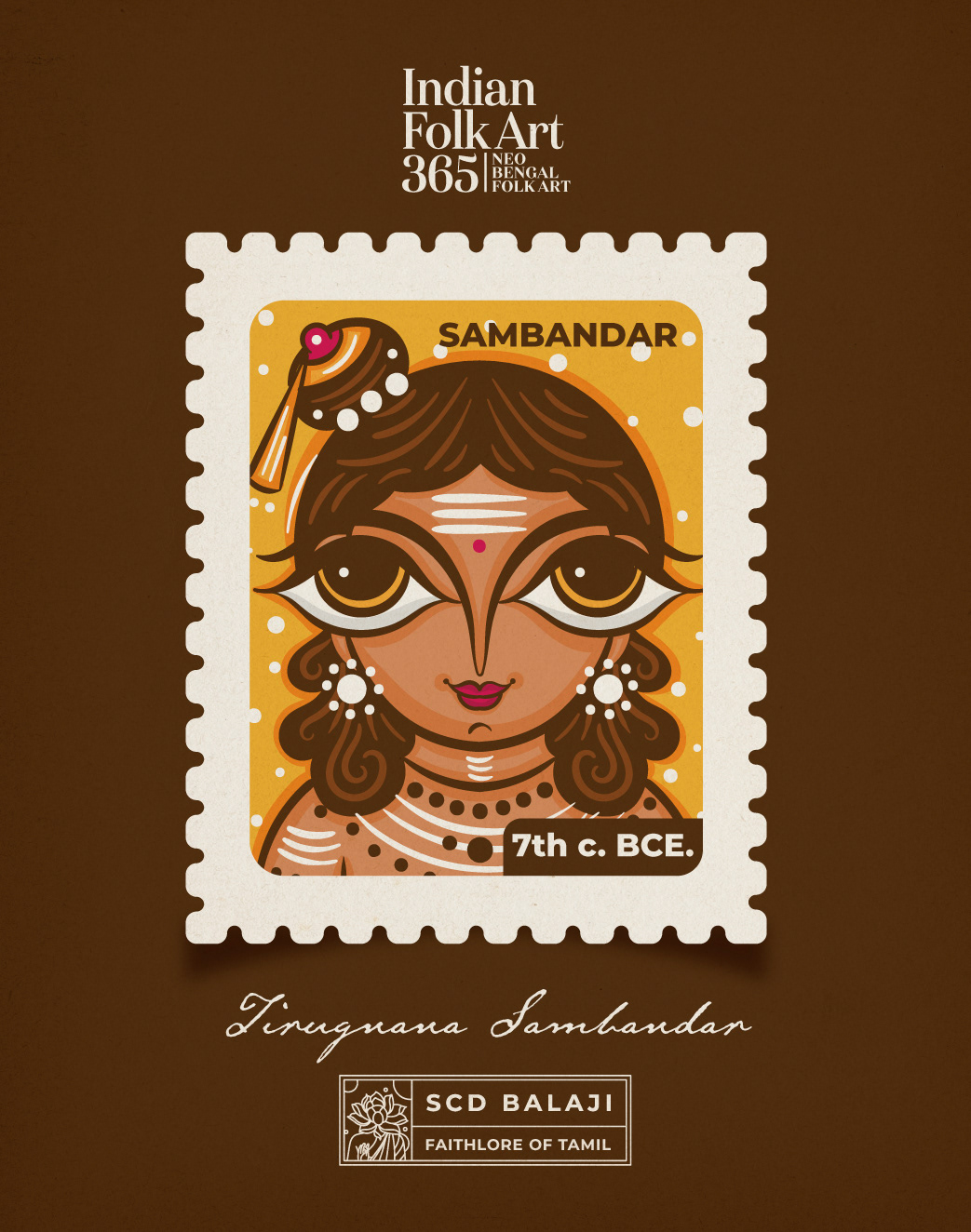 Sambandar was a Shaiva poet-saint from Tamil Nadu who lived in the 7th c. BCE. Despite only living for 16 years, he was considered a child prodigy and is regarded as one of the foremost saints and founder of Tamil Shaivism. According to Tamil folklore, when Sambandar was just 8 years old, he received the milk of wisdom from the goddess Parvathi herself. After seeing his devotion, she appeared before him and offered him a bowl of milk. Upon drinking the milk, Sambandar was instantly blessed with divine knowledge and wisdom. He went on to compose numerous hymns and poems in praise of Lord Shiva and the divine, including the legendary Tamil Thevaram. Sambandar is also credited with performing several miracles, which helped to establish the Shaivite tradition in Tamil Nad