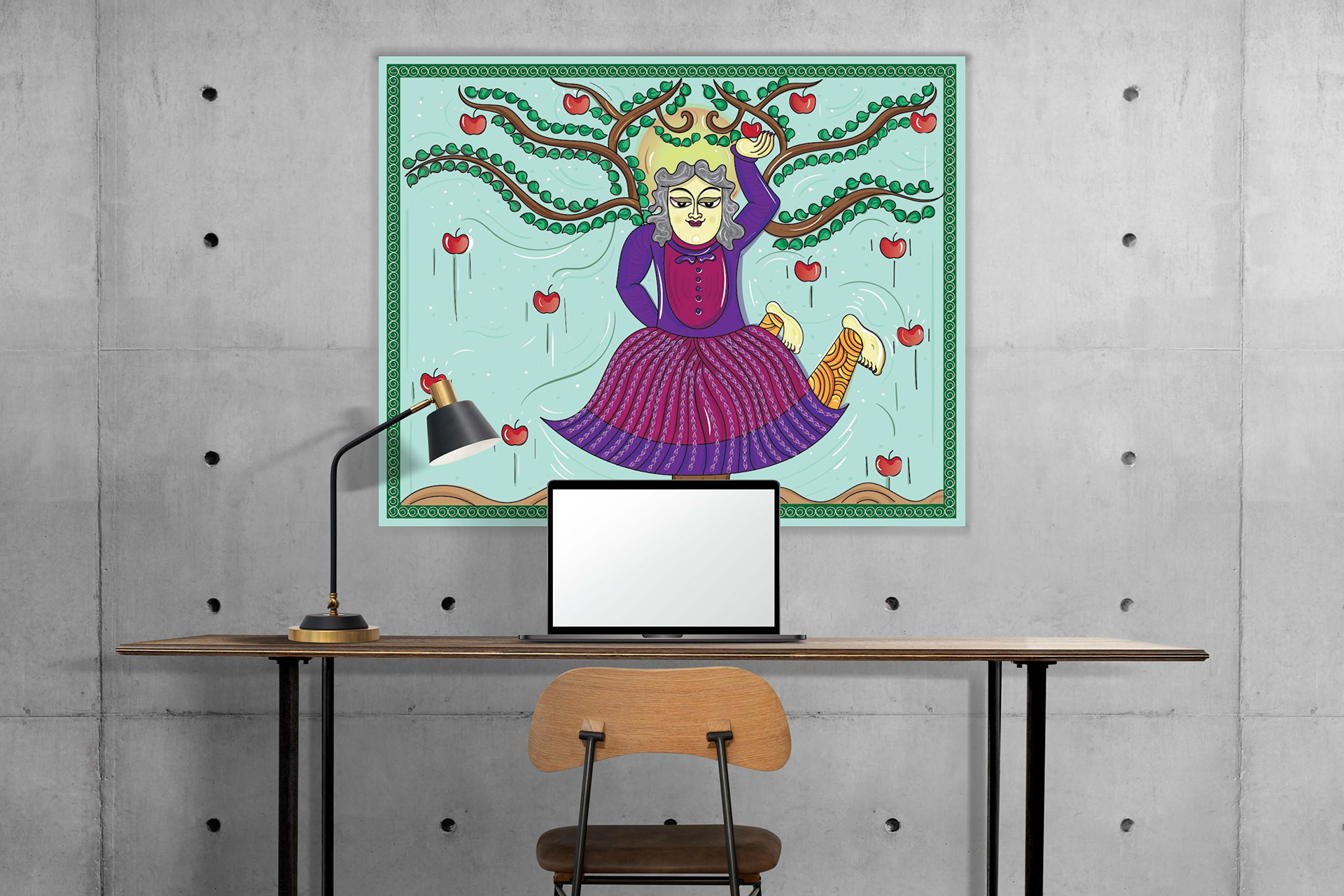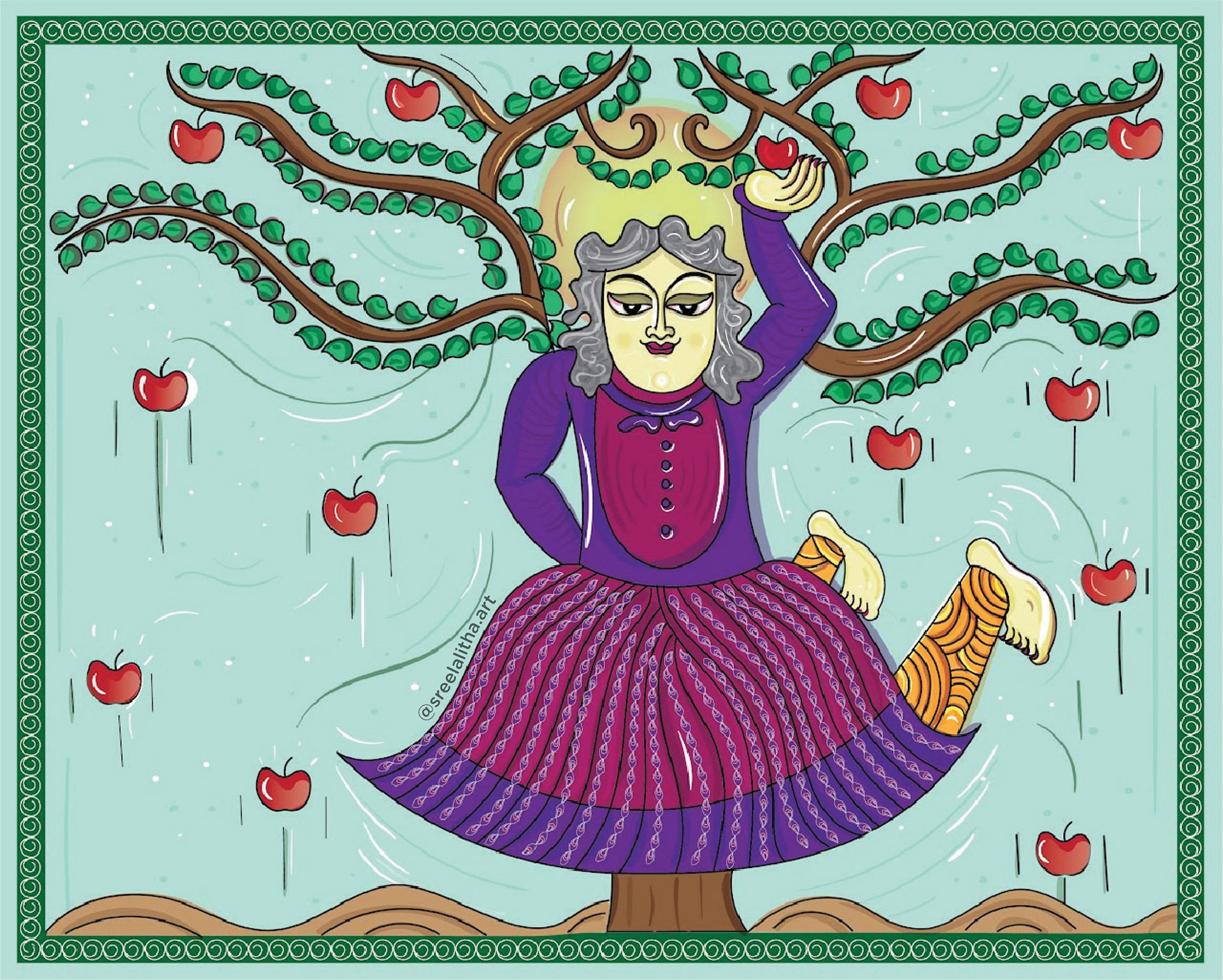 Showcasing the iconic Apple tree that ignited Newton's gravity revelation. This artwork reminds us that embracing childlike curiosity unveils profound truths, captured in the enchanting Pichwai painting style.