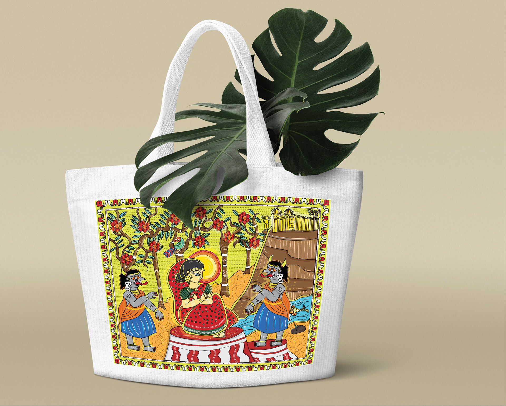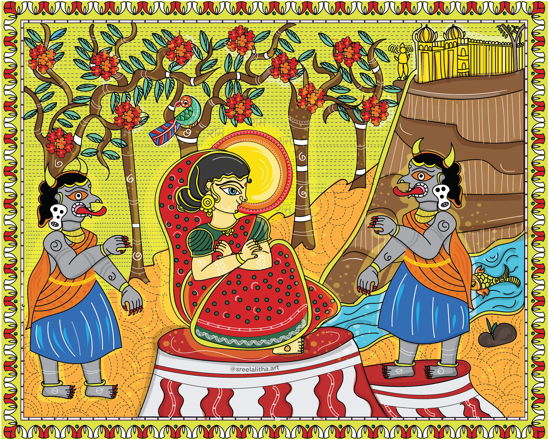 Sita Devi's refuge under the Ashoka tree at Ashoka Vatika symbolizes resilience, hope, and the triumph of good over evil, elegantly presented through the captivating Madhubani art form.