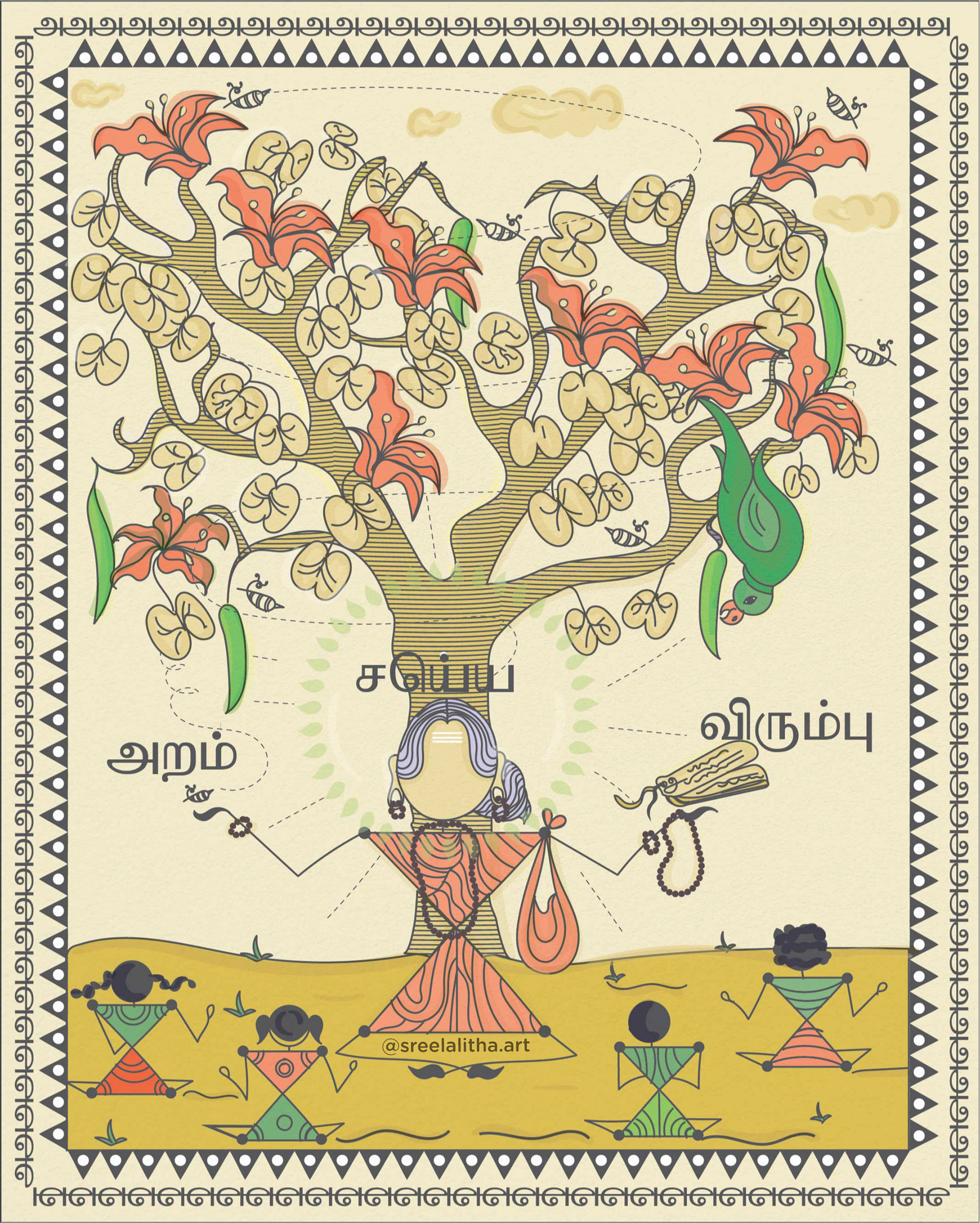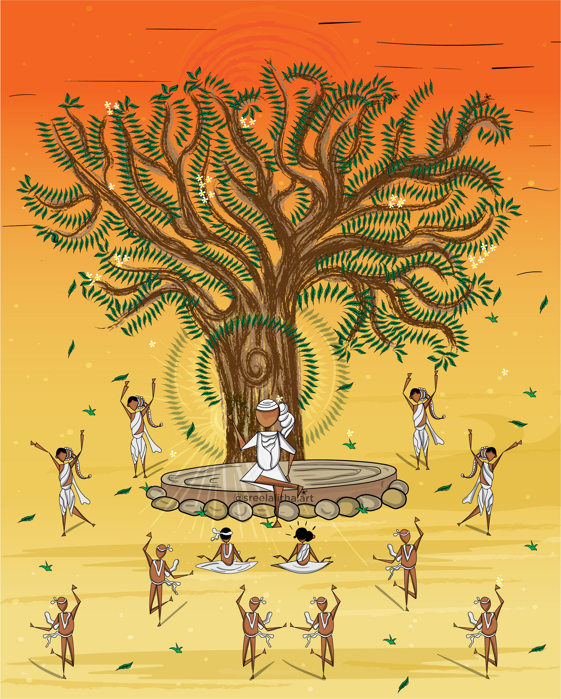 Presenting a warli Illustration of the Mandharai tree, a source of sustenance and healing through seeds, blossoms, and bark. Echoing Avvai's path, it embodies a life of purpose and wisdom shared through a spiritual journey.