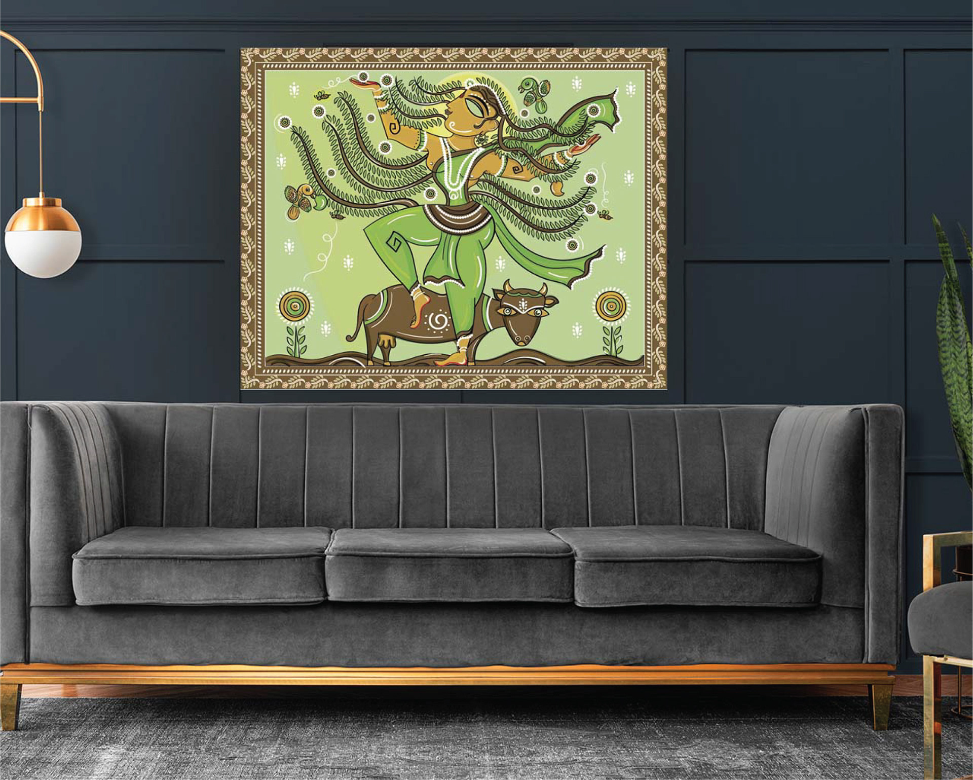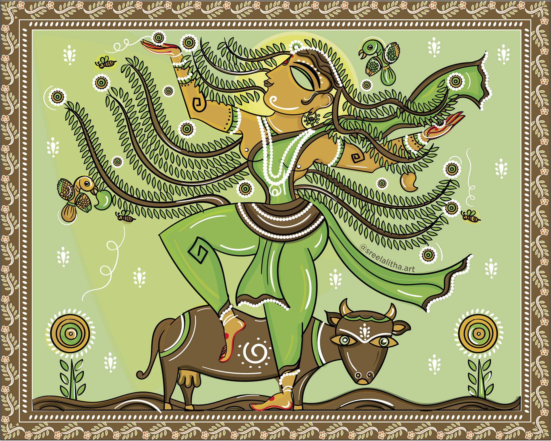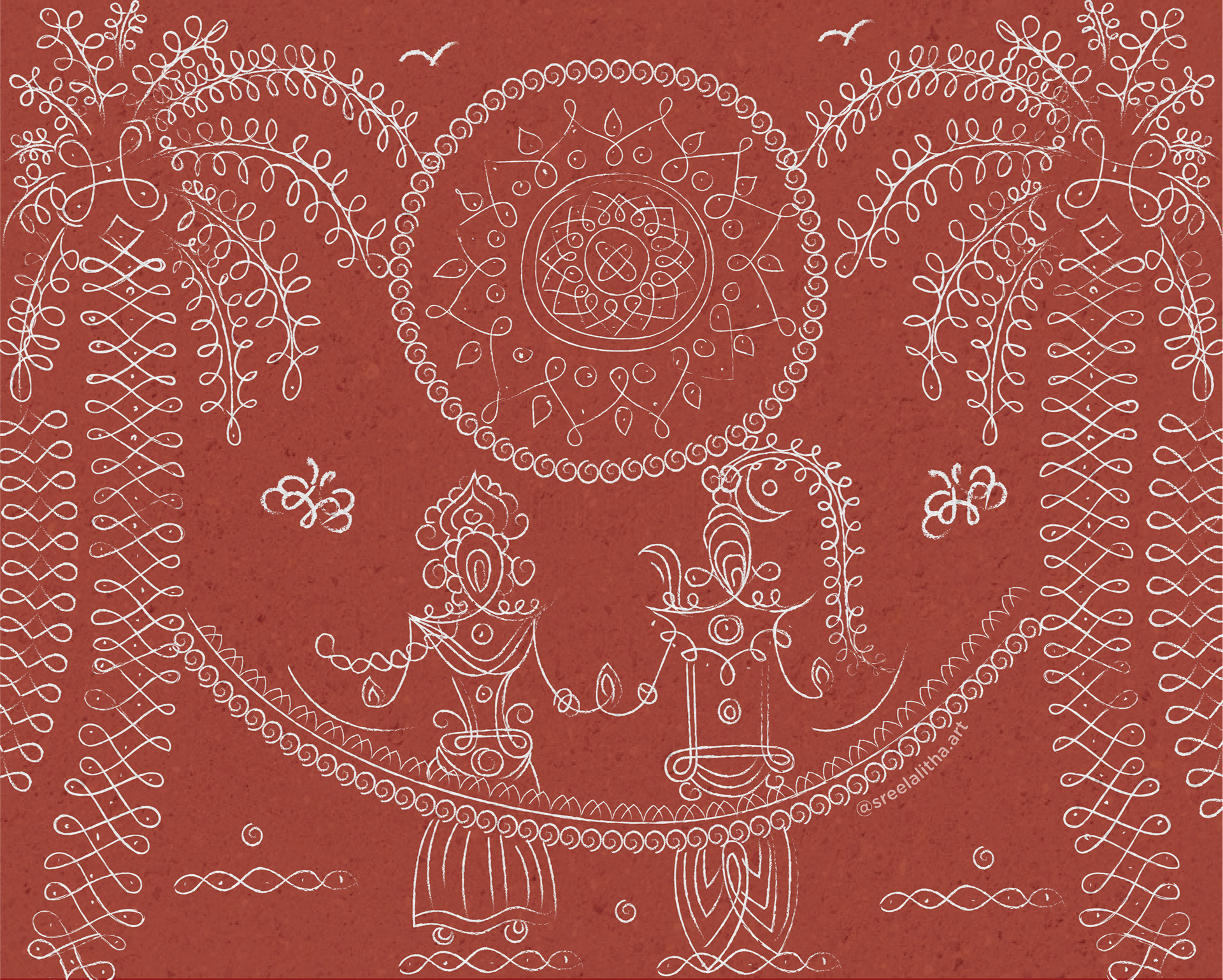 Kolam is a mesmerizing art form that combines geometric designs, straight lines, curves, and loops to create enchanting patterns. This piece depicts Shiva and Parvathi in a serene setting—a coconut grove—where they blissfully unwind while savoring the beauty of the sunrise.