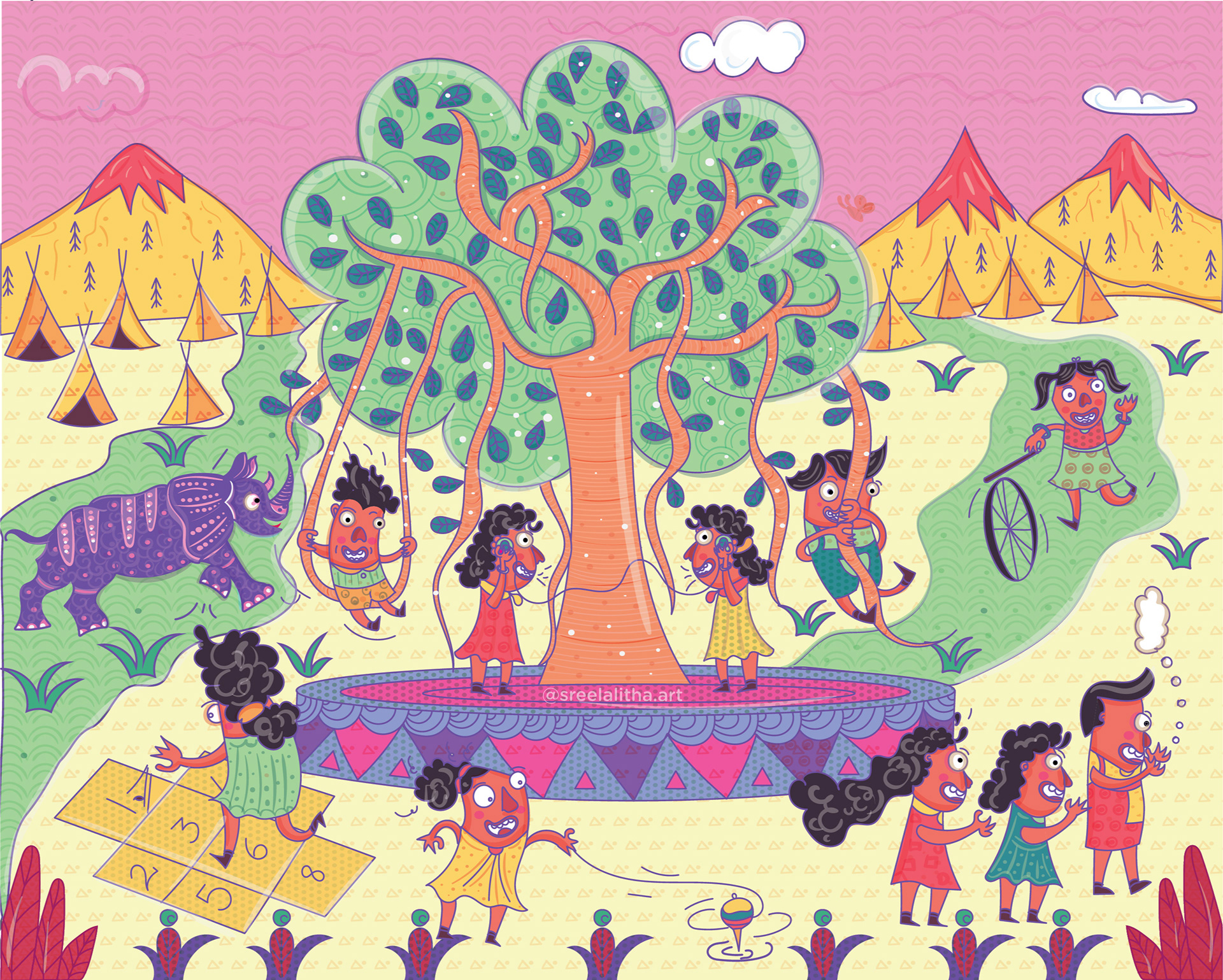 In this Mexican art form based painting, a resilient Banyan tree stands strong across decades. Just as the tree's deep roots provide shelter, playing beneath its branches reminds us of the constant love our parents shower upon us.