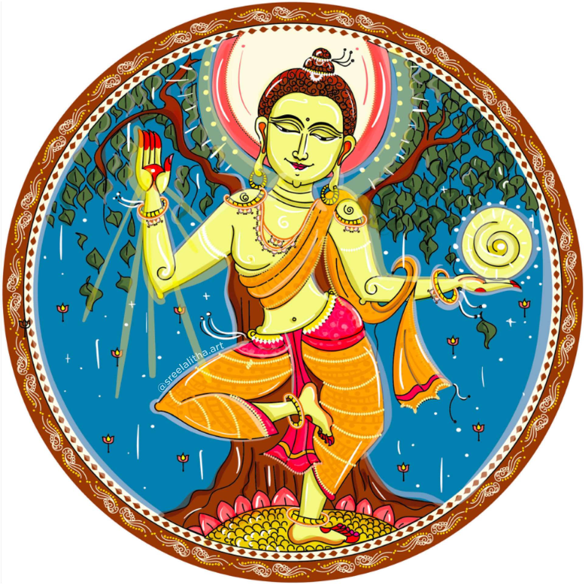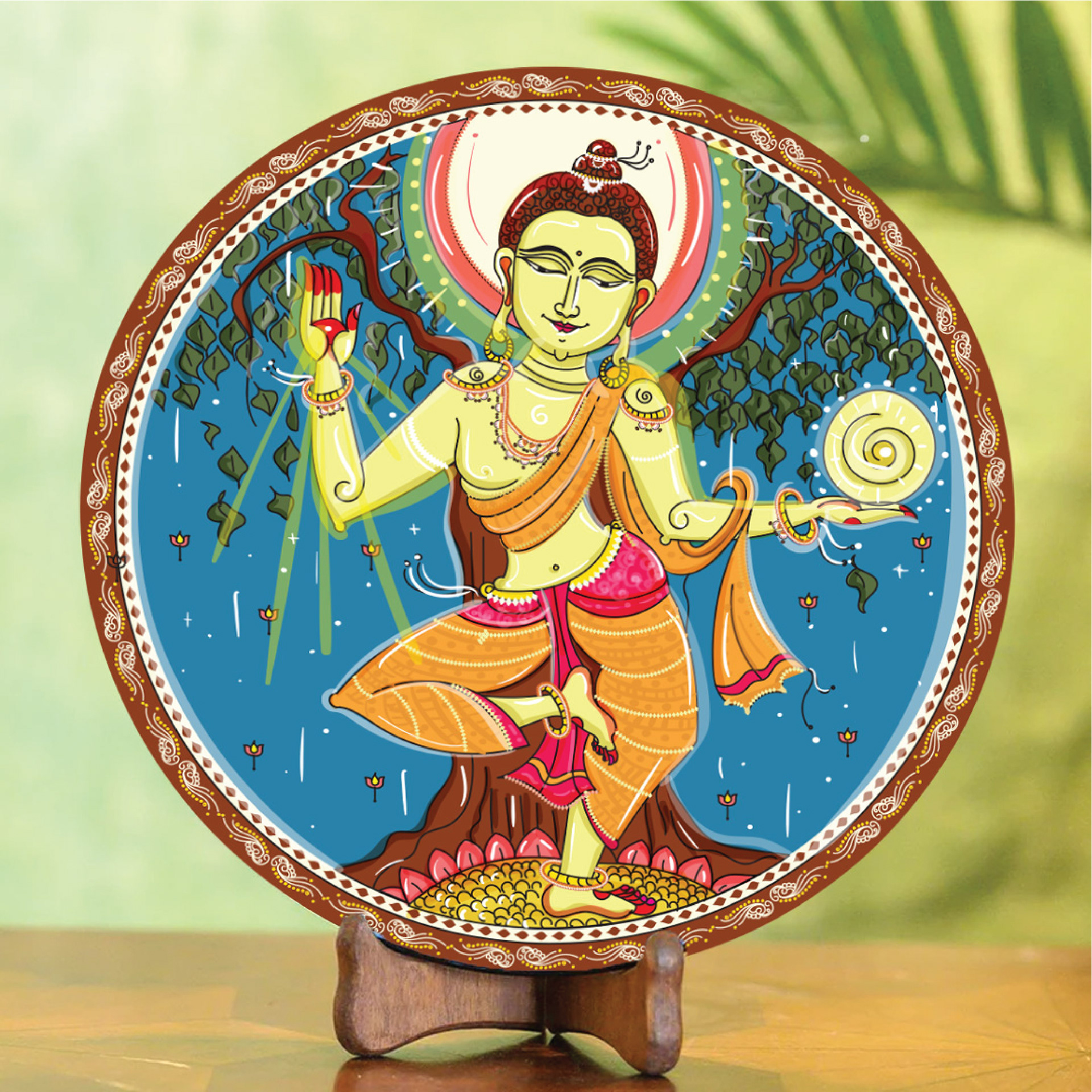Illustrated in the exquisite Orissa Pattachitra style, this artwork portrays Lord Buddha's enlightenment. With a serene smile and a raised leg in the penance pose, it captures him beneath the Bodhi tree. This piece aims to inspire generations in their pursuit of inner peace and wisdom.