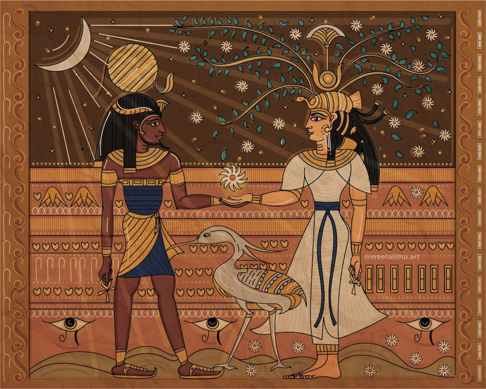 Presenting the captivating Parijat tree, a magnificent symbol of enduring love. This artwork delves into the profound nature of love, illustrating the delicate balance of attachment and detachment in the Egyptian art style.