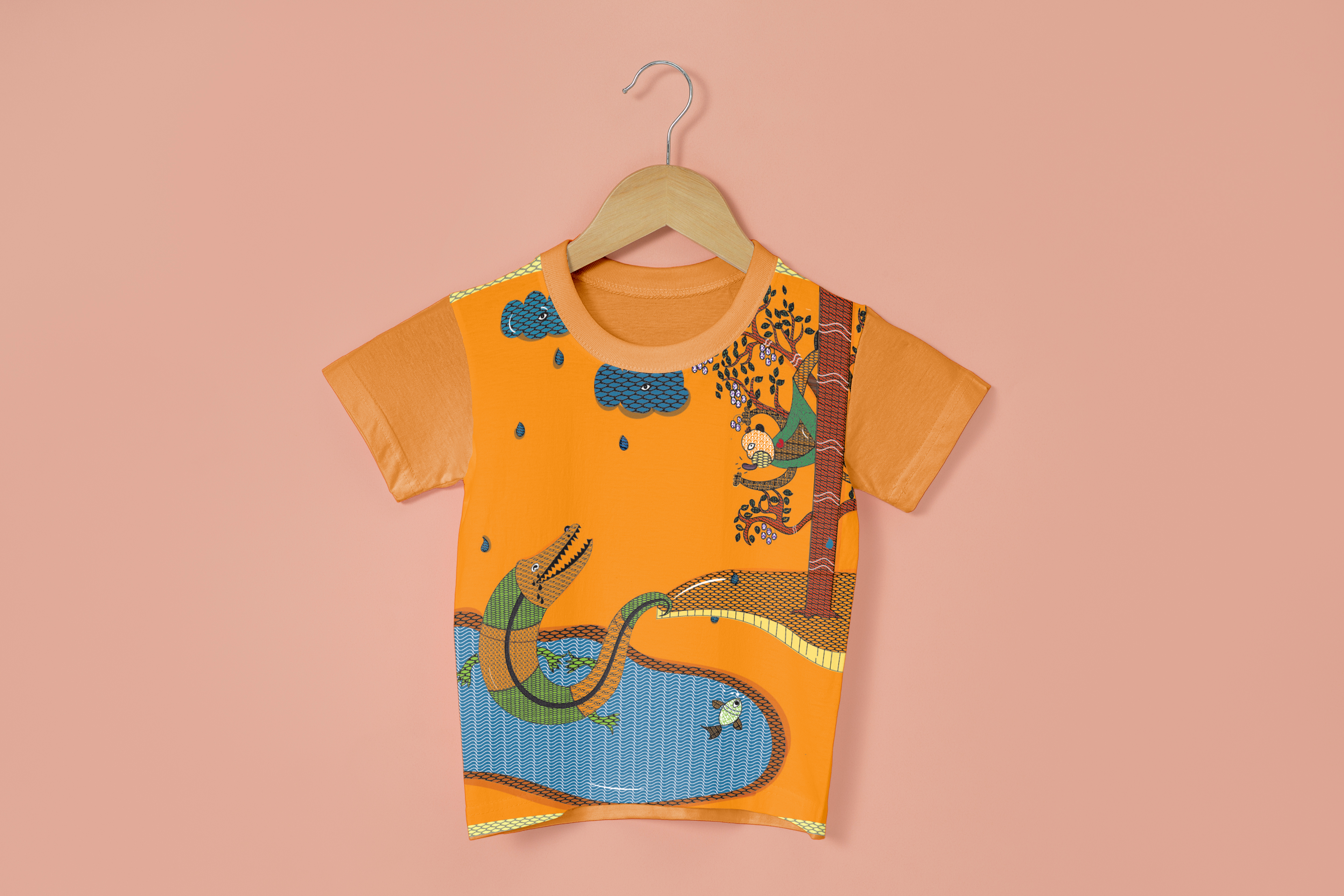 Illustrated in the enchanting Gond art form, this painting portrays the timeless tale of the monkey and the crocodile from the Panchatantra tales. It showcases the ingenuity of the clever monkey, skillfully evading the clutches of the cunning crocodile.