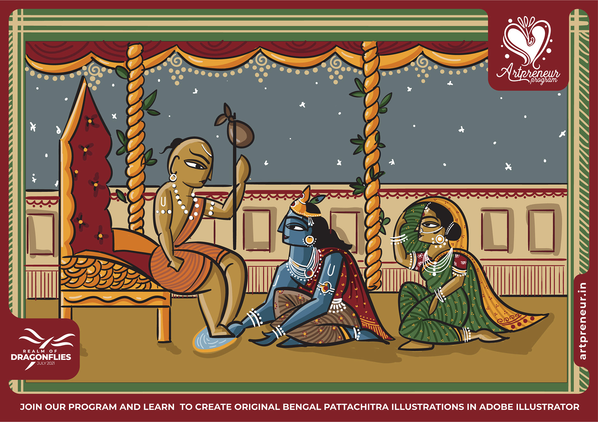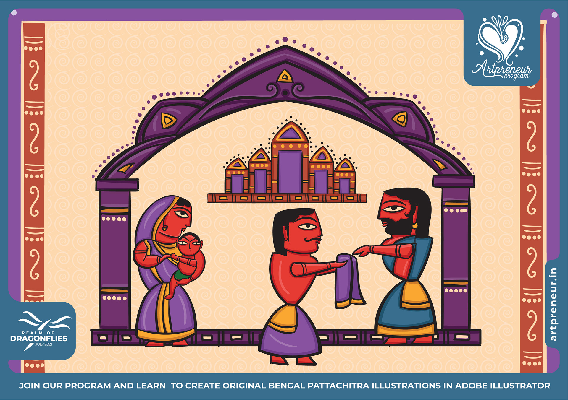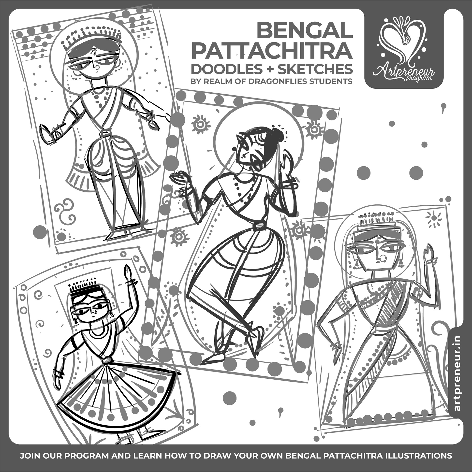 The Bengal Pattachitra Illustrations, Doodles and Sketches are done by the Realm of Dragonflies Batch students of Artpreneur Online Program. They have not had any prior experience and knowledge in illustrations or folk art forms.