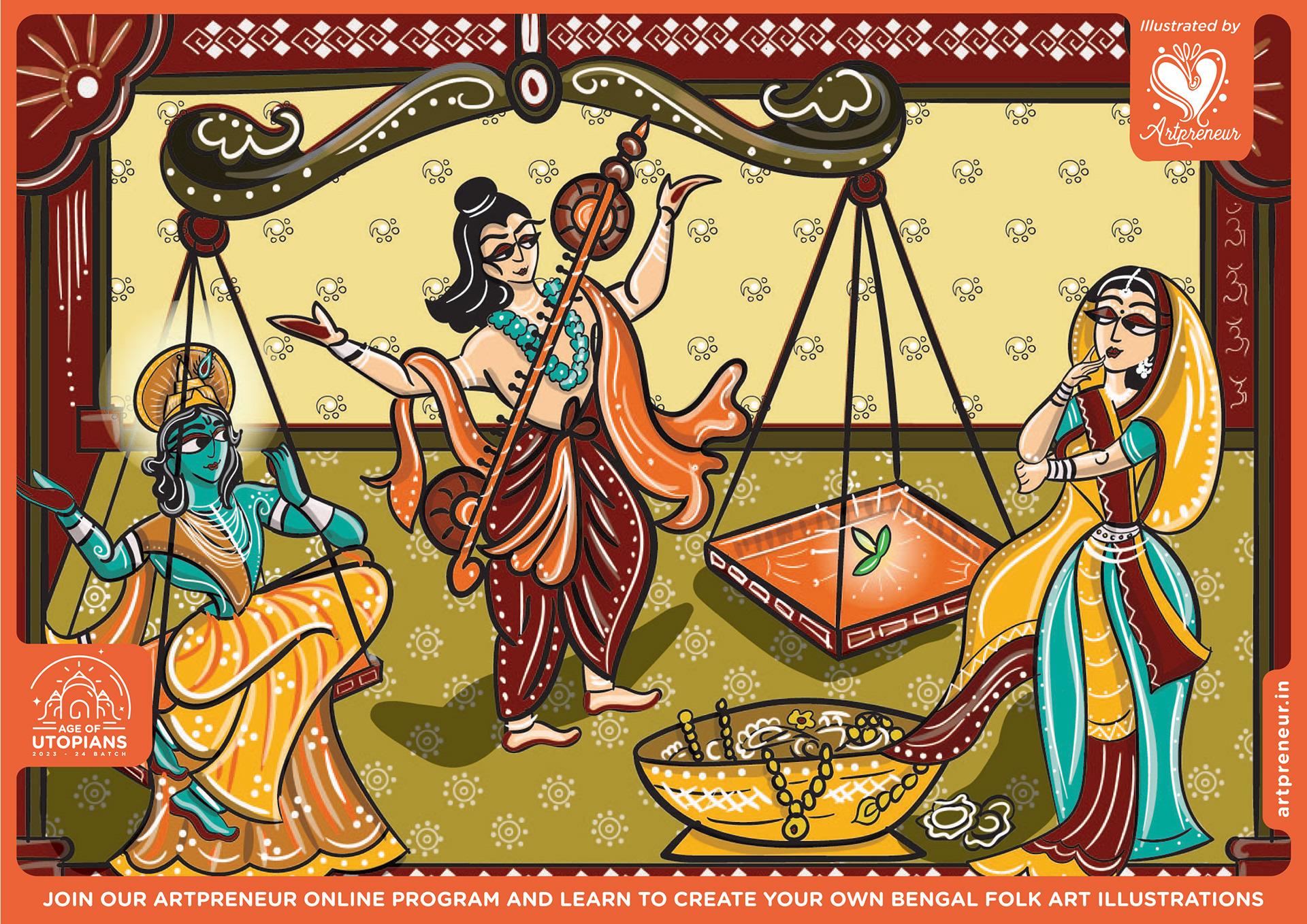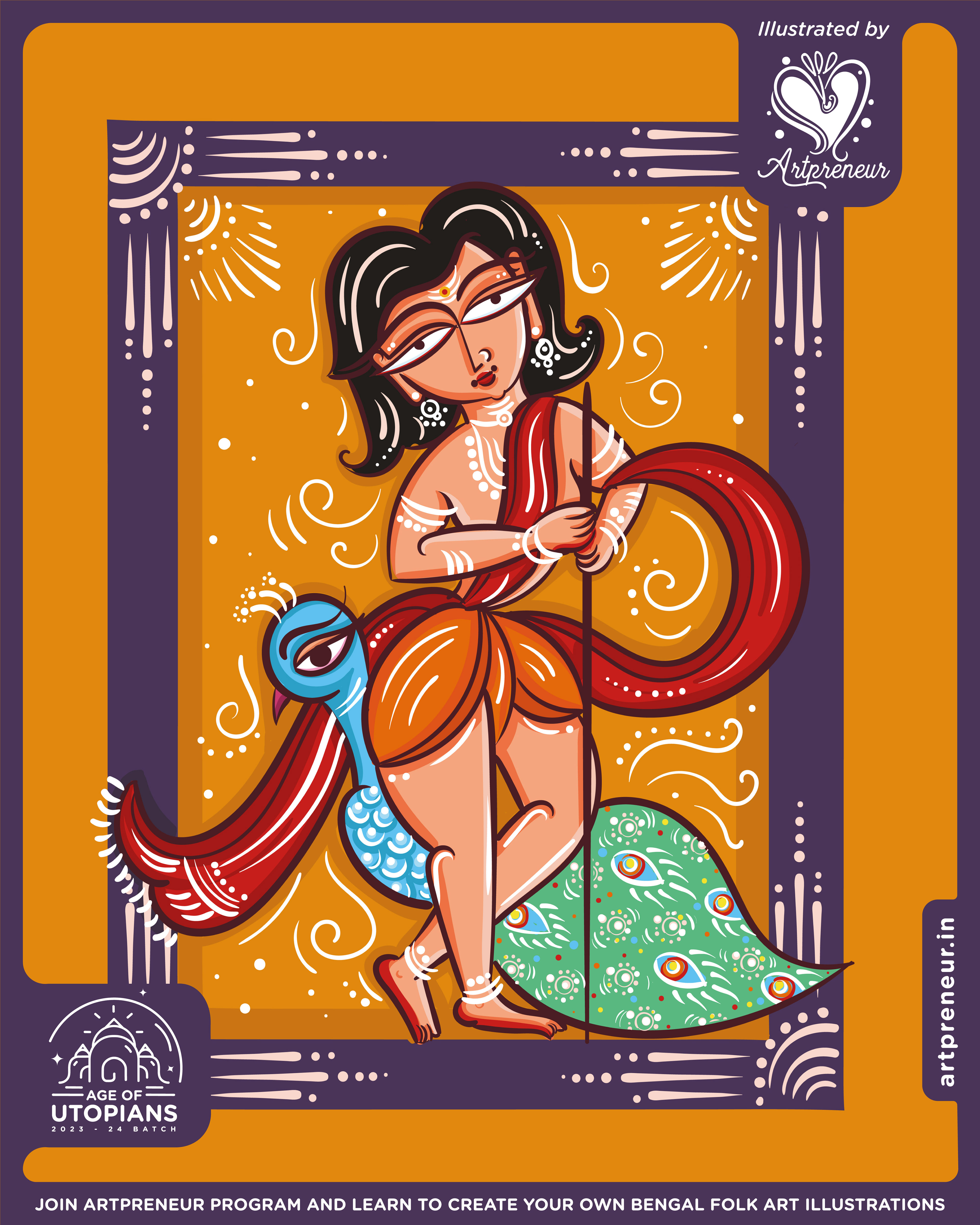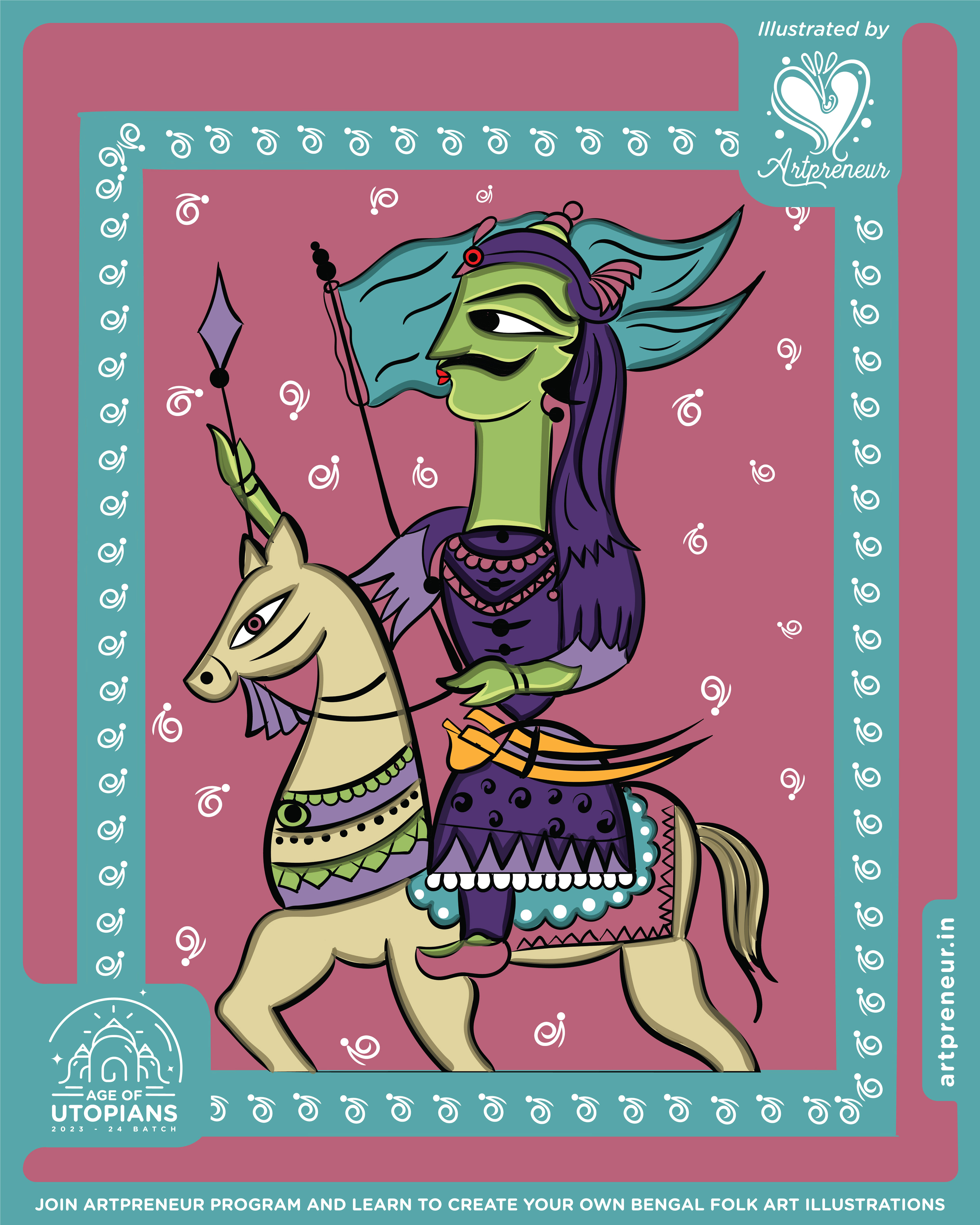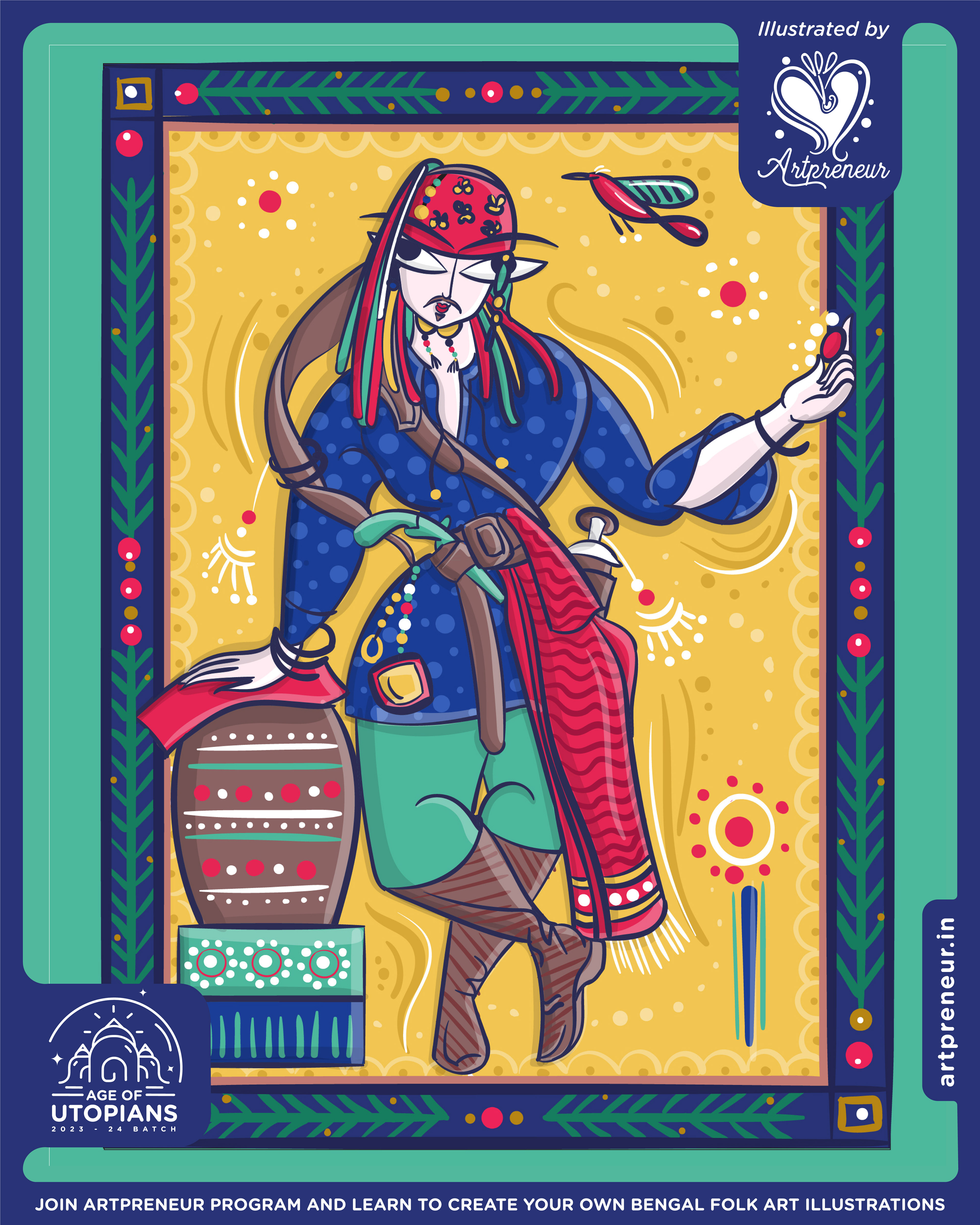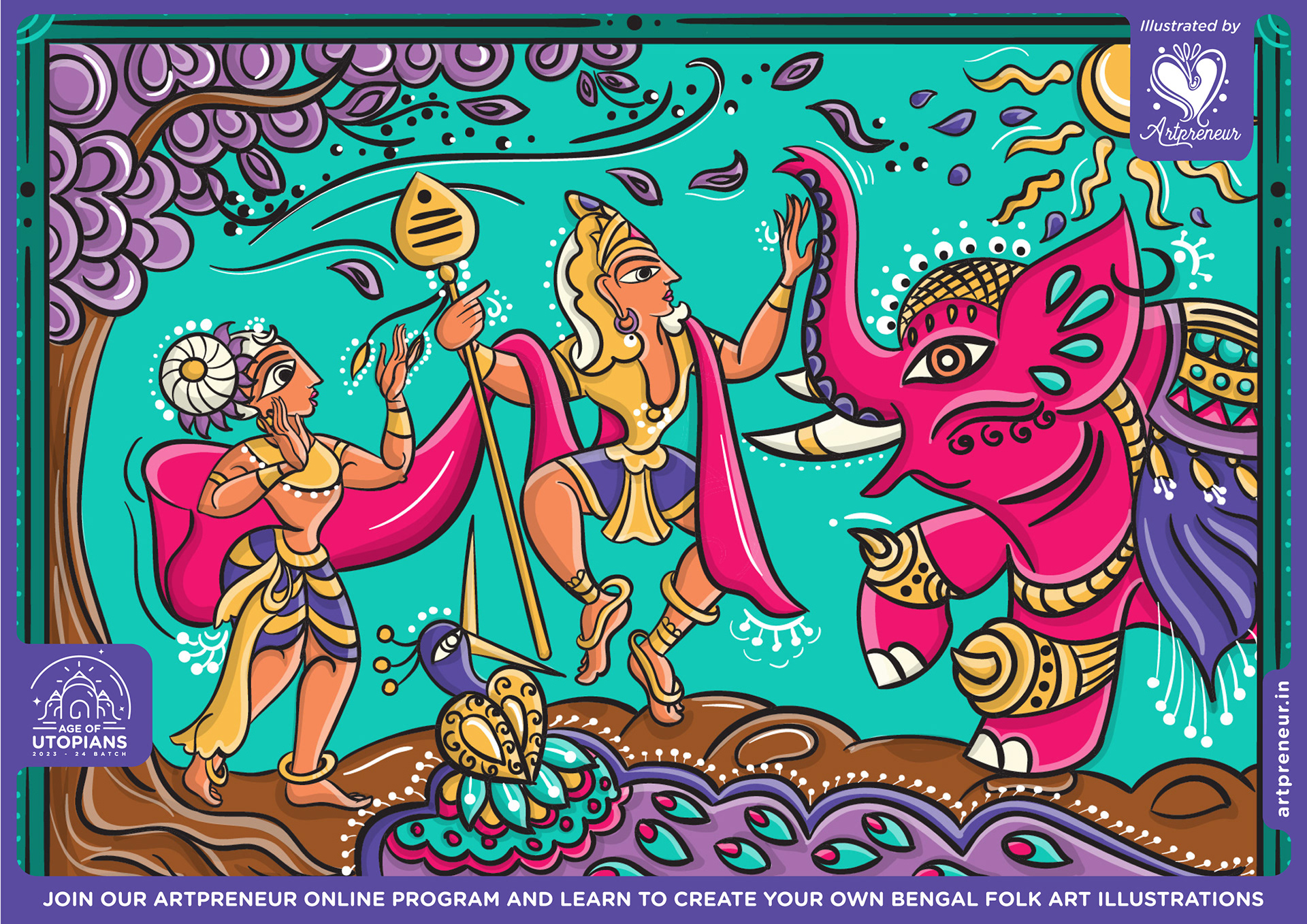 Step into the enchanting realm of Bengal Folk Art with these mesmerizing illustrations, a modern interpretation of the Bengal Pattachitra Art form from West Bengal. These stunning pieces have been created by the Age of Utopians Batch Students for the year 2023-24, who had no prior experience or knowledge in creating their own illustrations in Indian folk art forms.