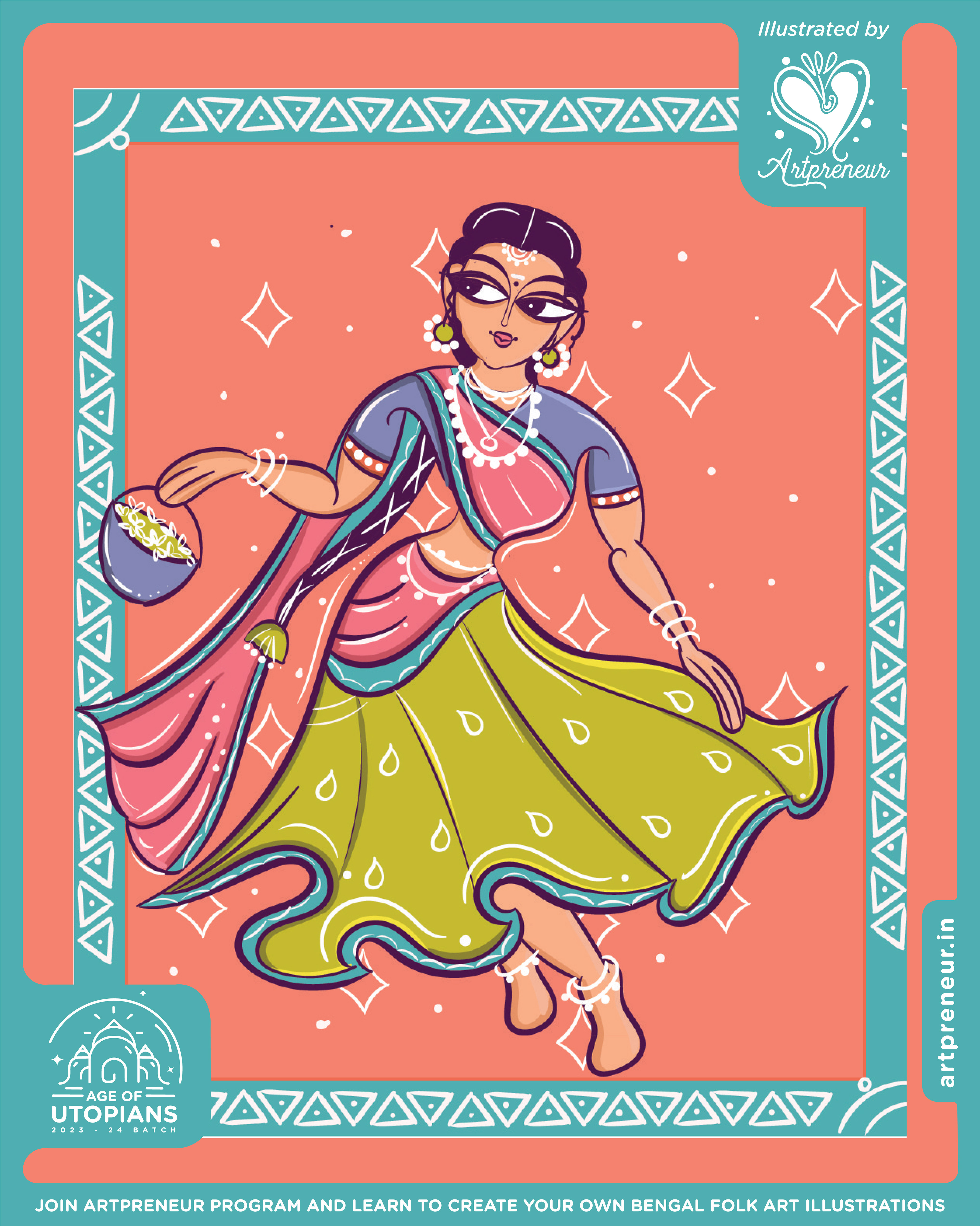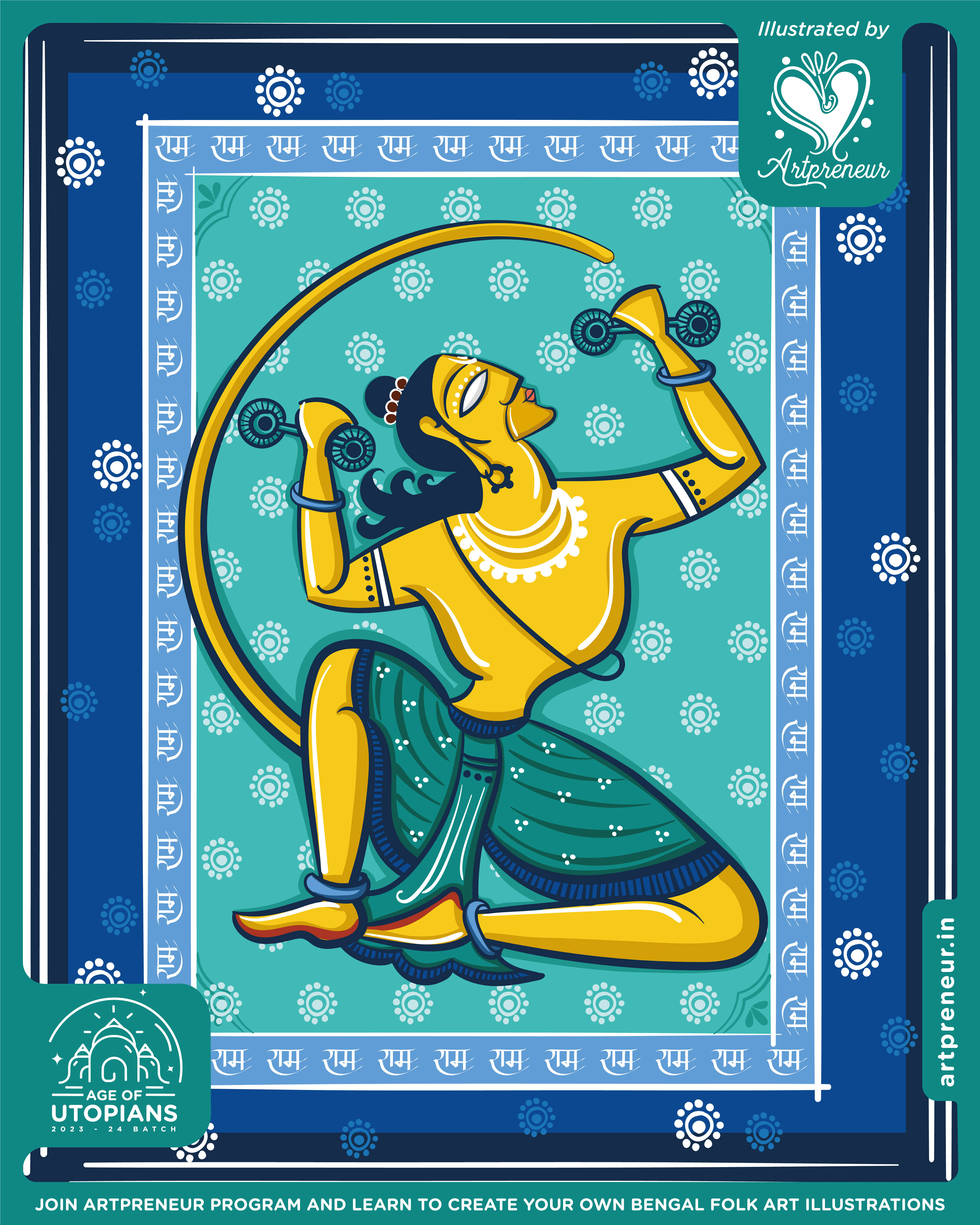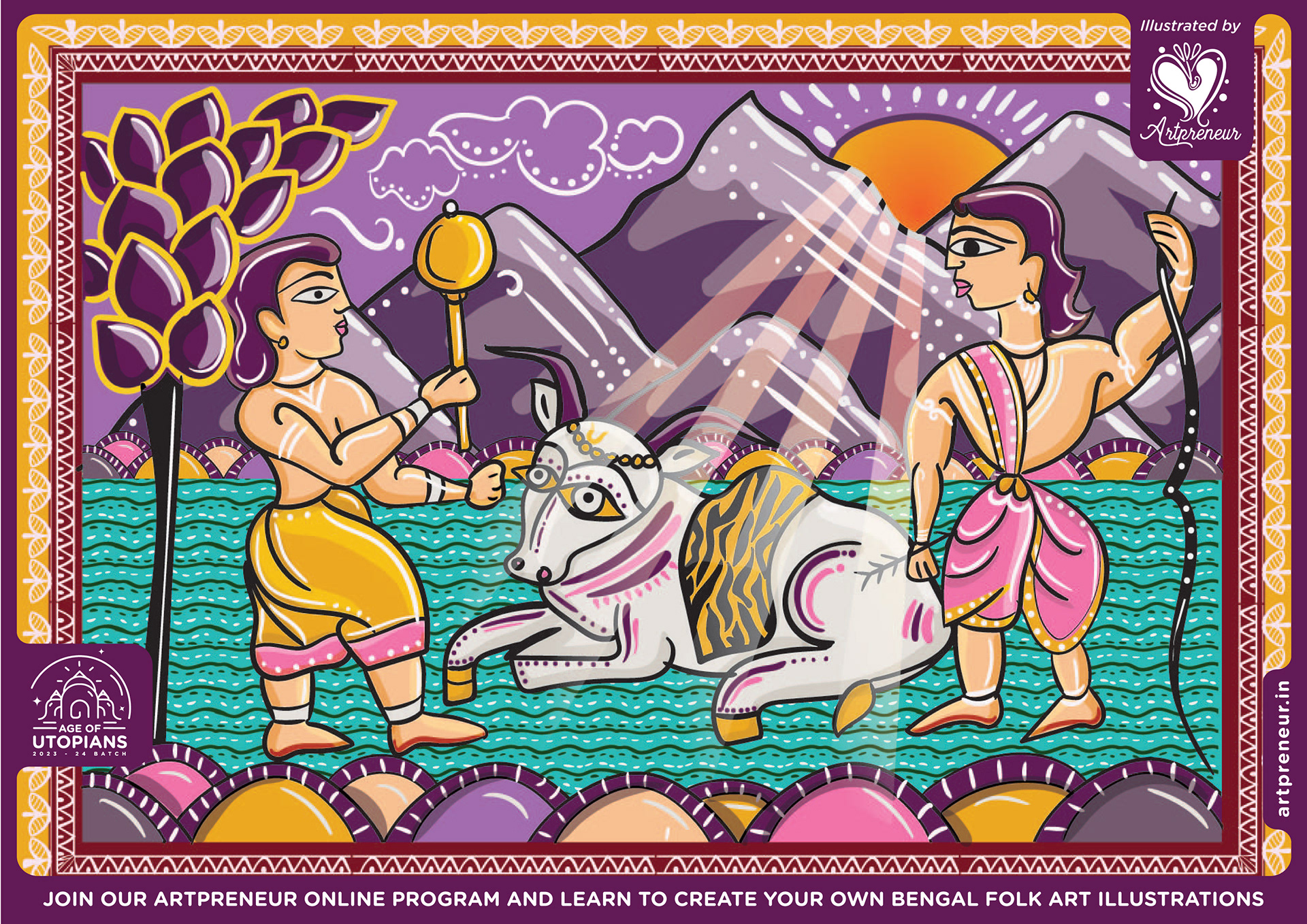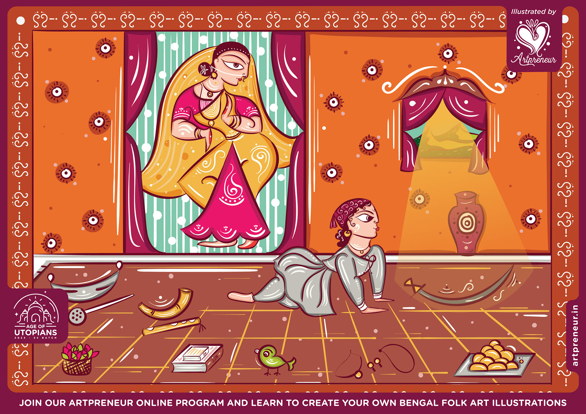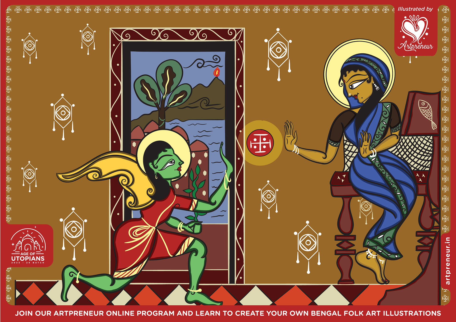 Step into the enchanting realm of Bengal Folk Art with these mesmerizing illustrations, a modern interpretation of the Bengal Pattachitra Art form from West Bengal. These stunning pieces have been created by the Age of Utopians Batch Students for the year 2023-24, who had no prior experience or knowledge in creating their own illustrations in Indian folk art forms.