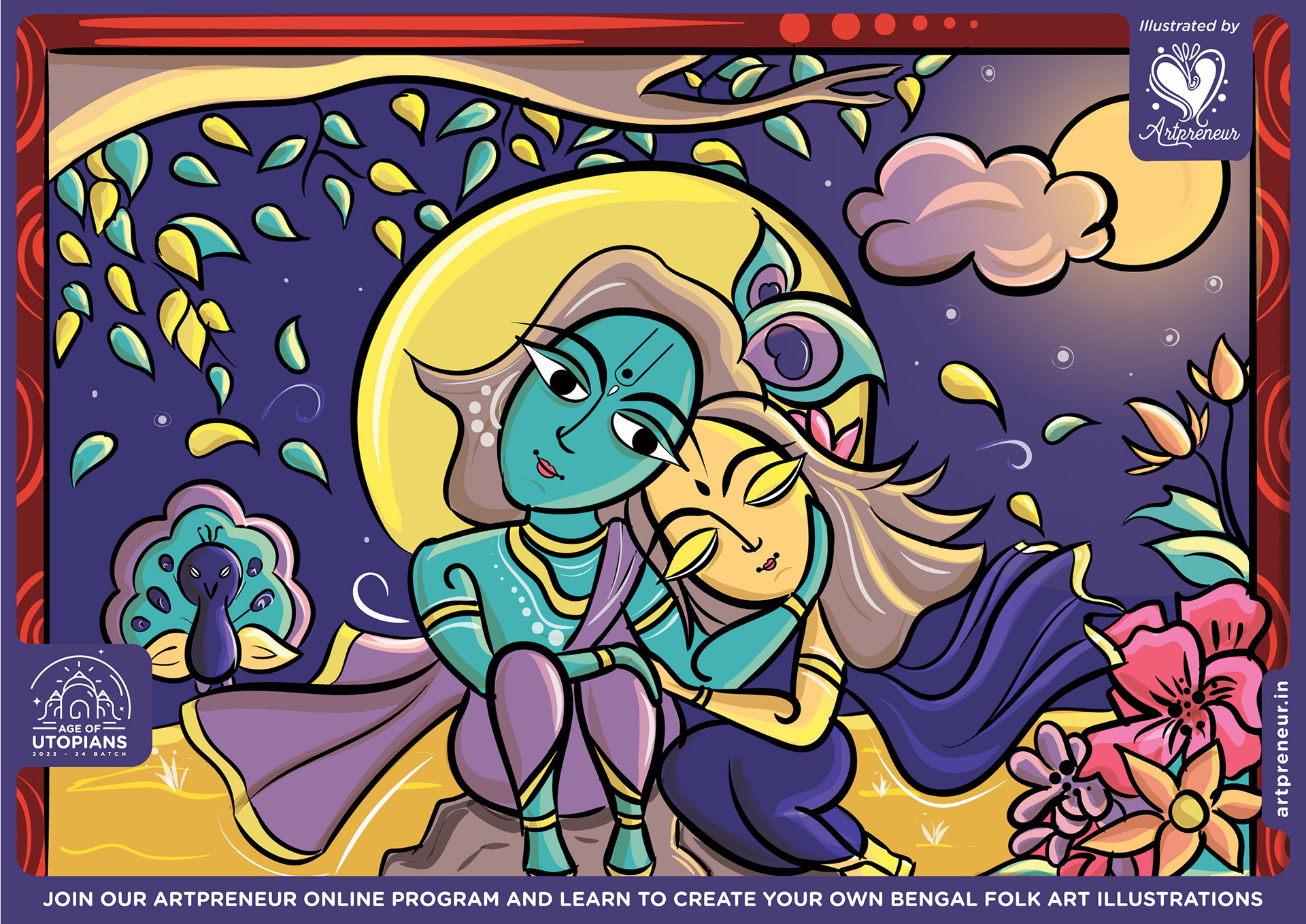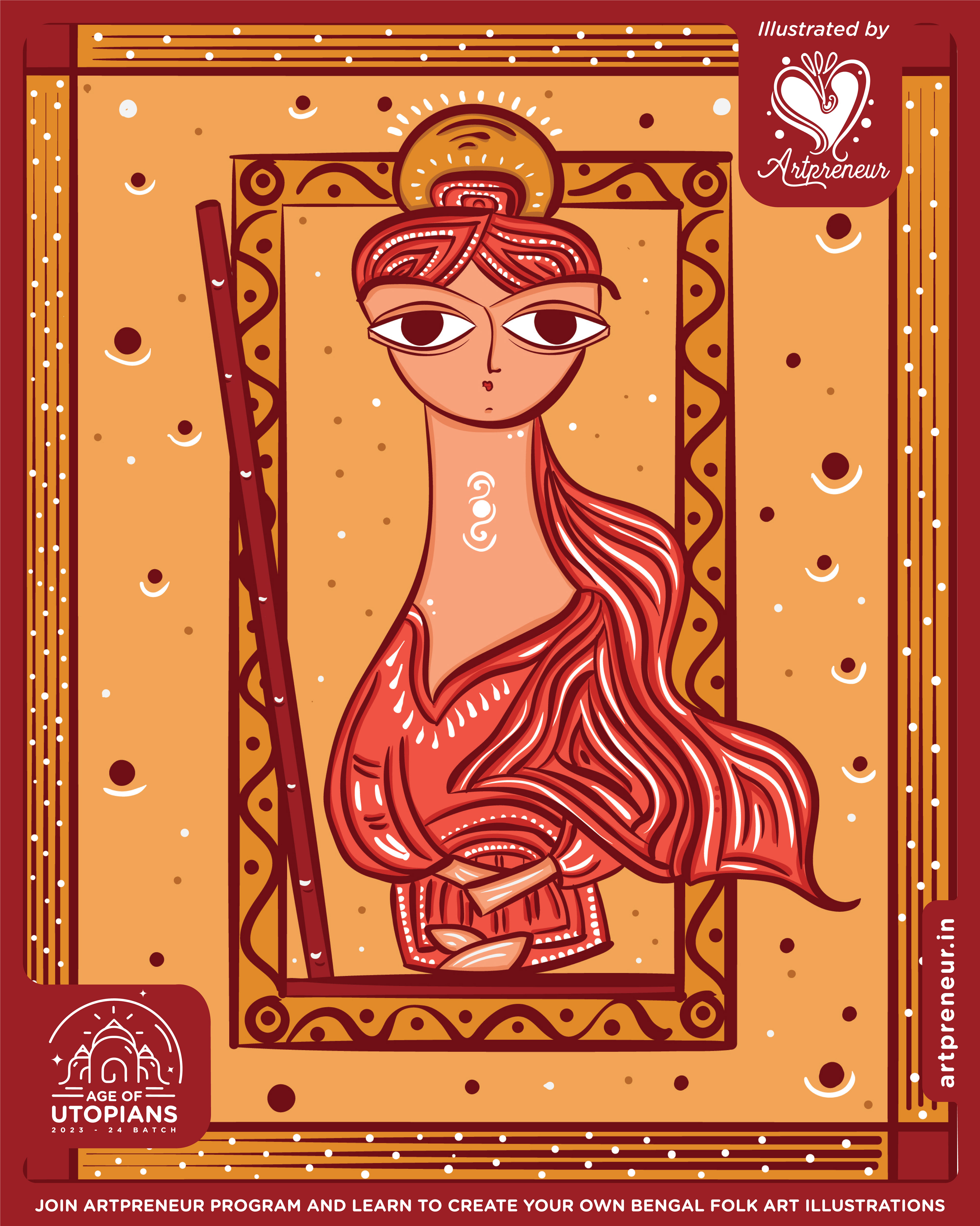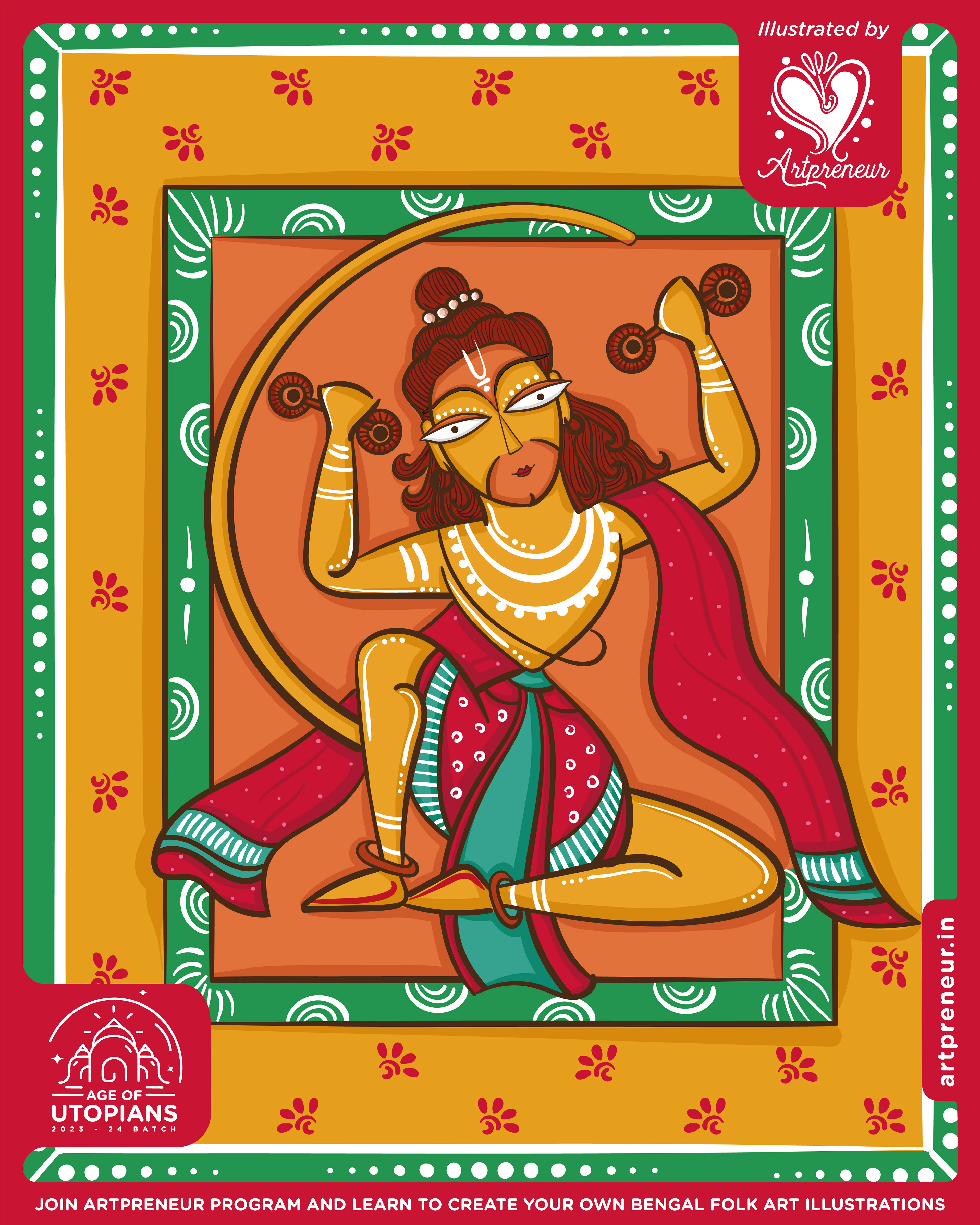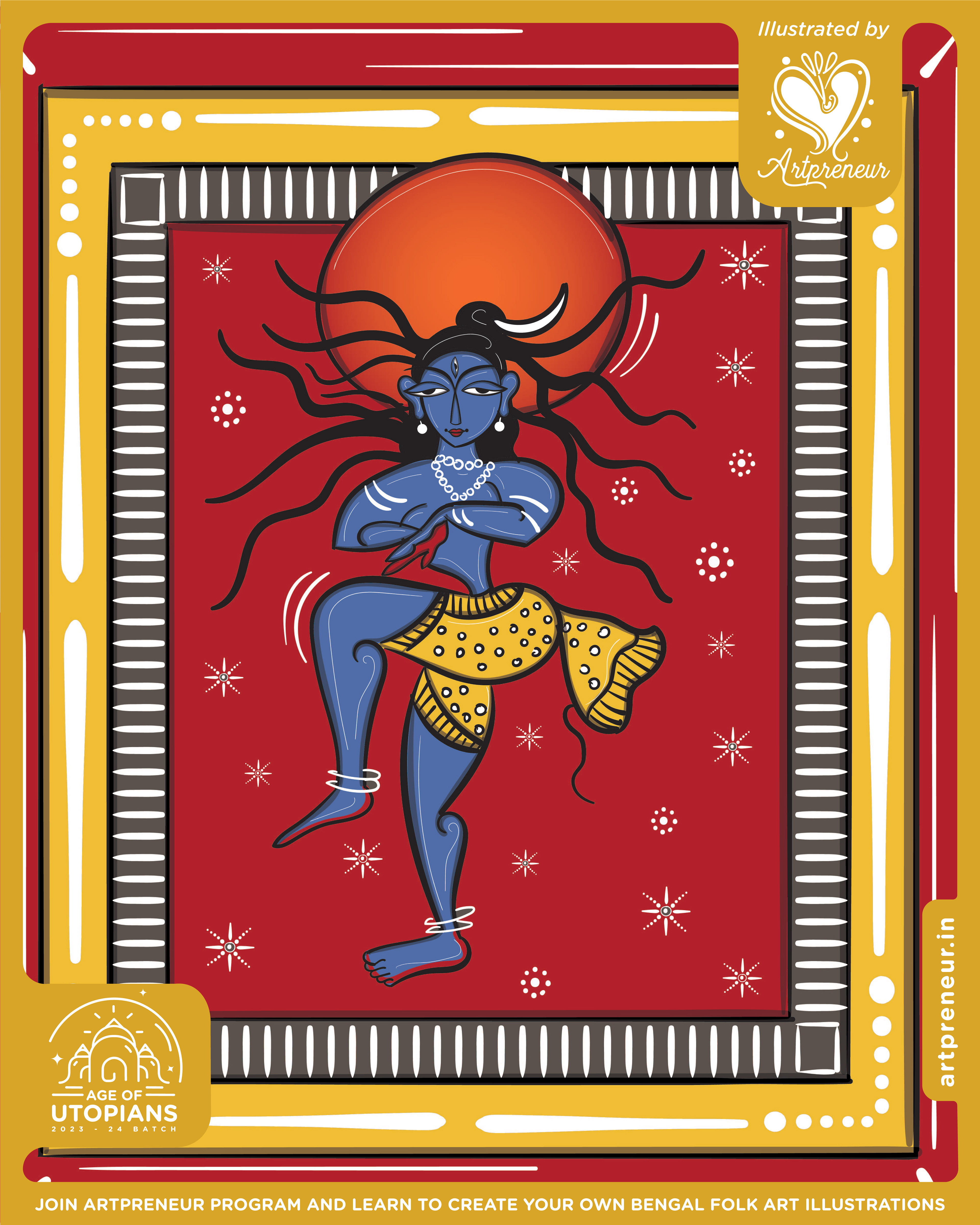 Step into the enchanting realm of Bengal Folk Art with these mesmerizing illustrations, a modern interpretation of the Bengal Pattachitra Art form from West Bengal. These stunning pieces have been created by the Age of Utopians Batch Students for the year 2023-24, who had no prior experience or knowledge in creating their own illustrations in Indian folk art forms.