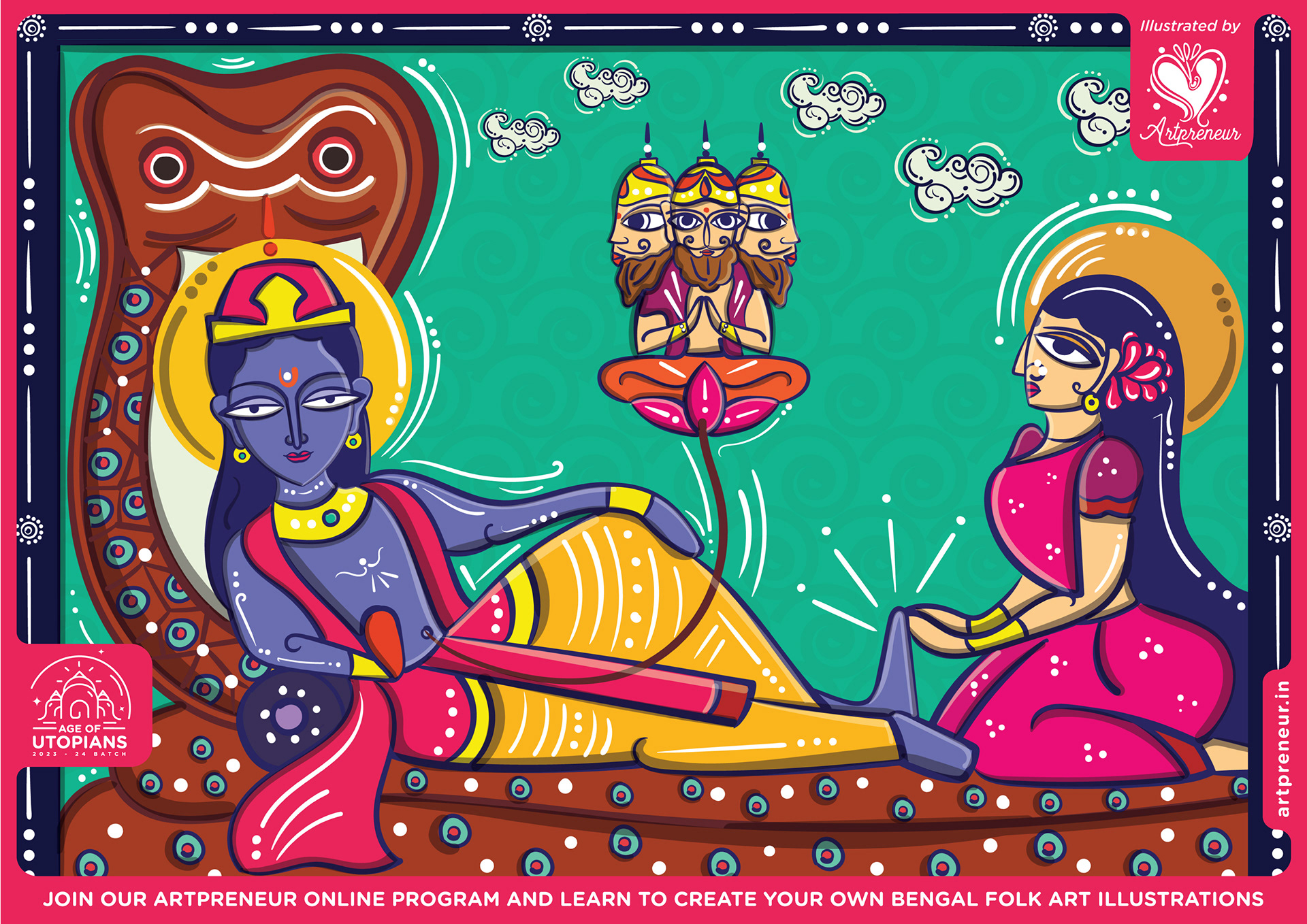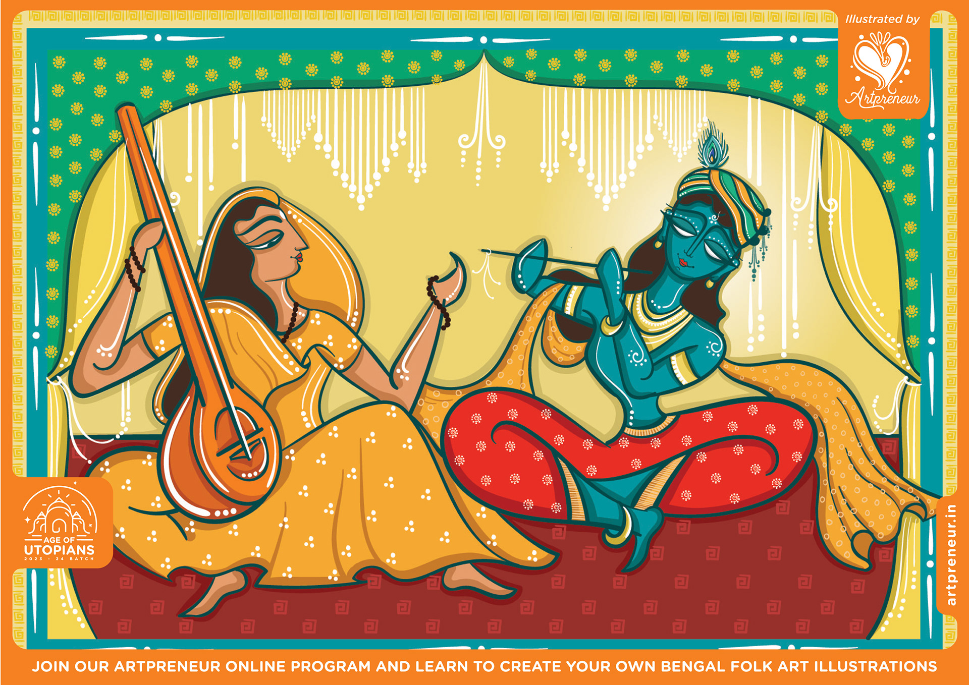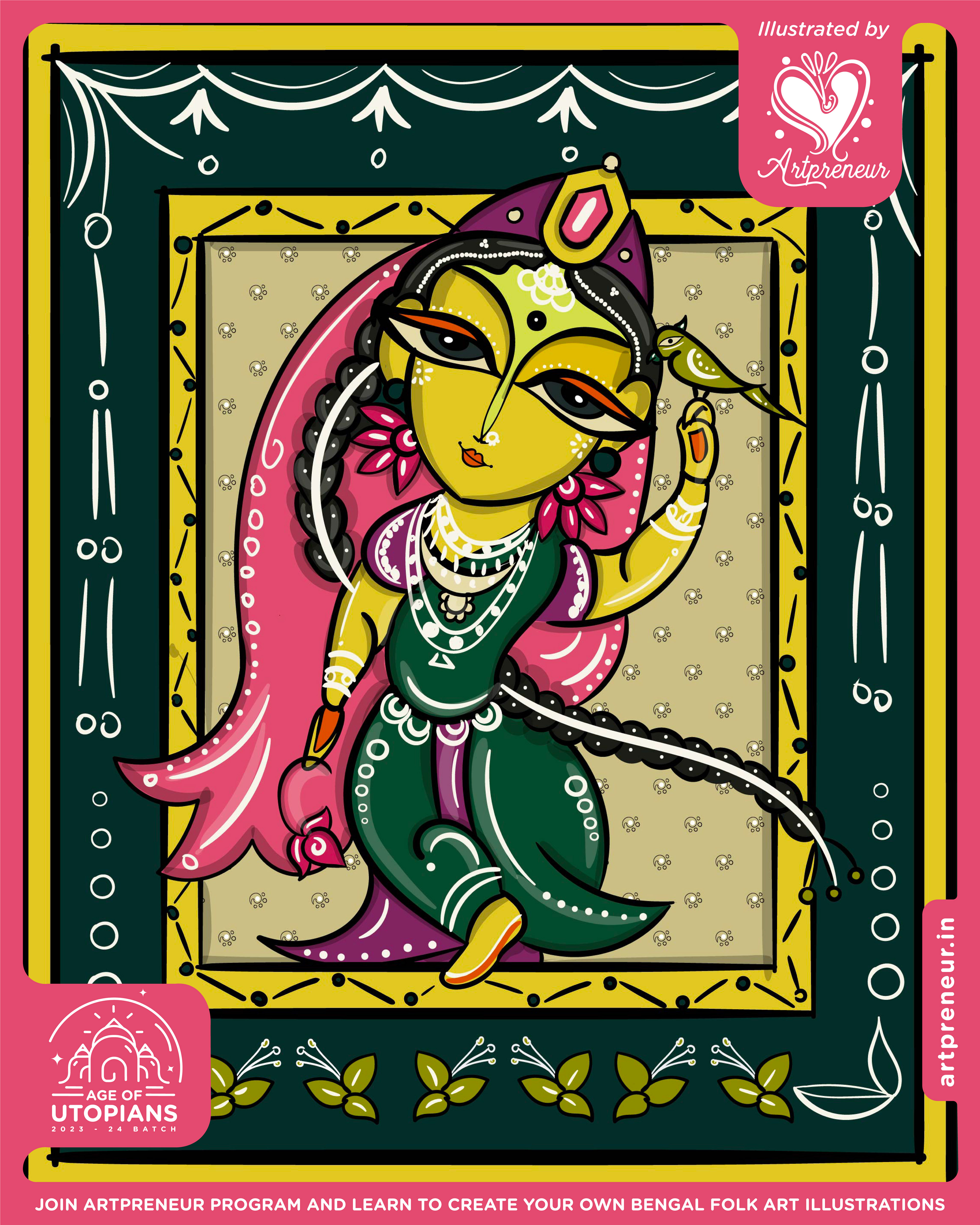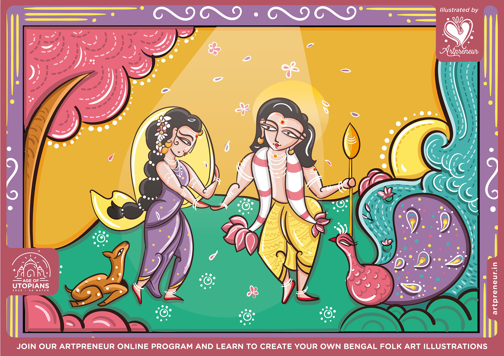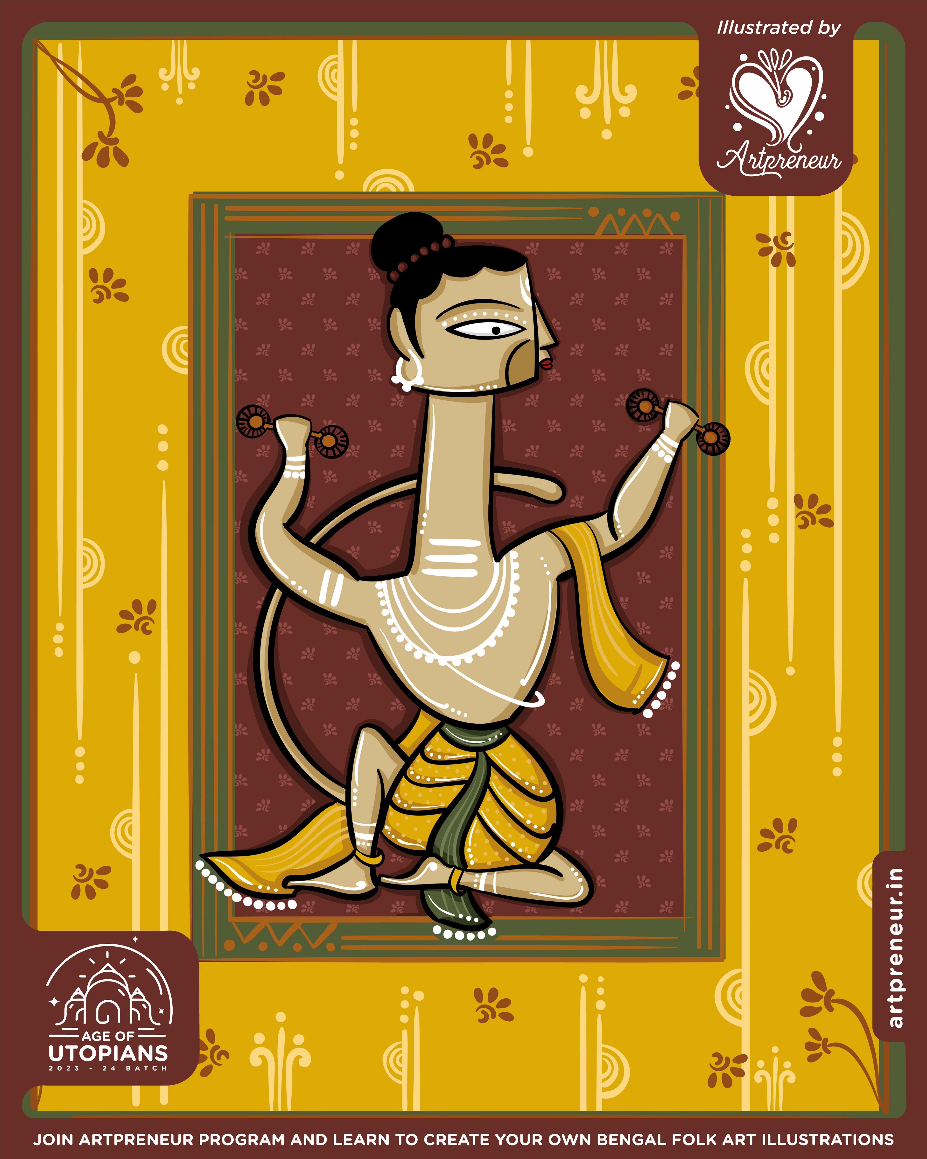 Step into the enchanting realm of Bengal Folk Art with these mesmerizing illustrations, a modern interpretation of the Bengal Pattachitra Art form from West Bengal. These stunning pieces have been created by the Age of Utopians Batch Students for the year 2023-24, who had no prior experience or knowledge in creating their own illustrations in Indian folk art forms.