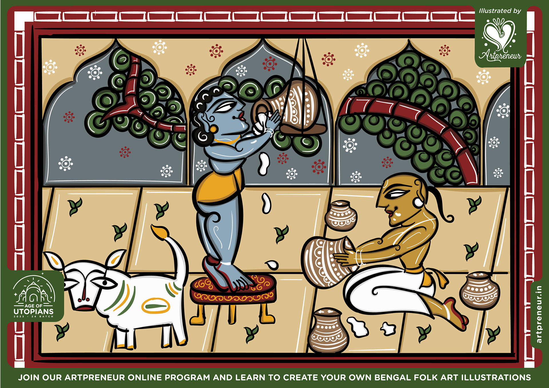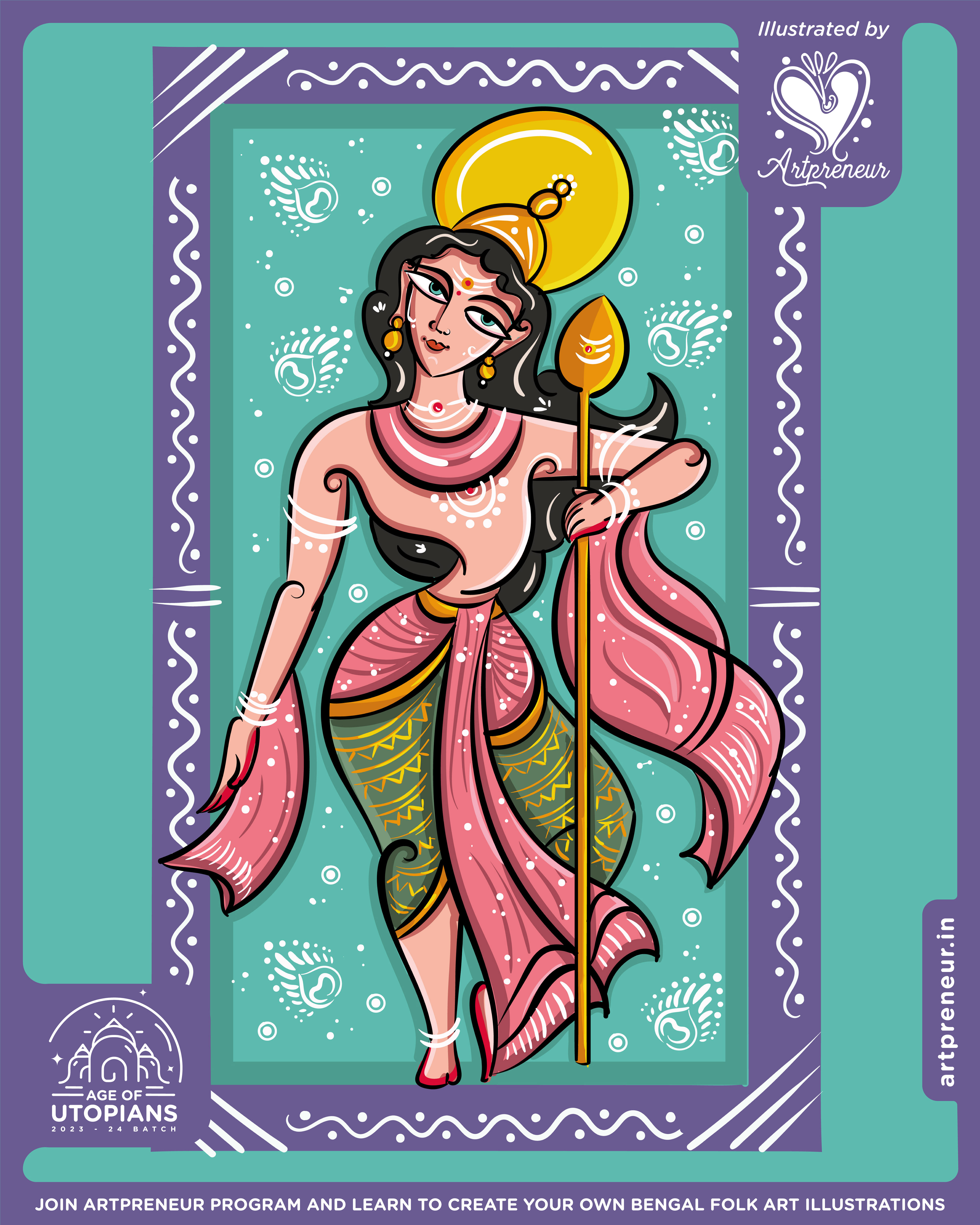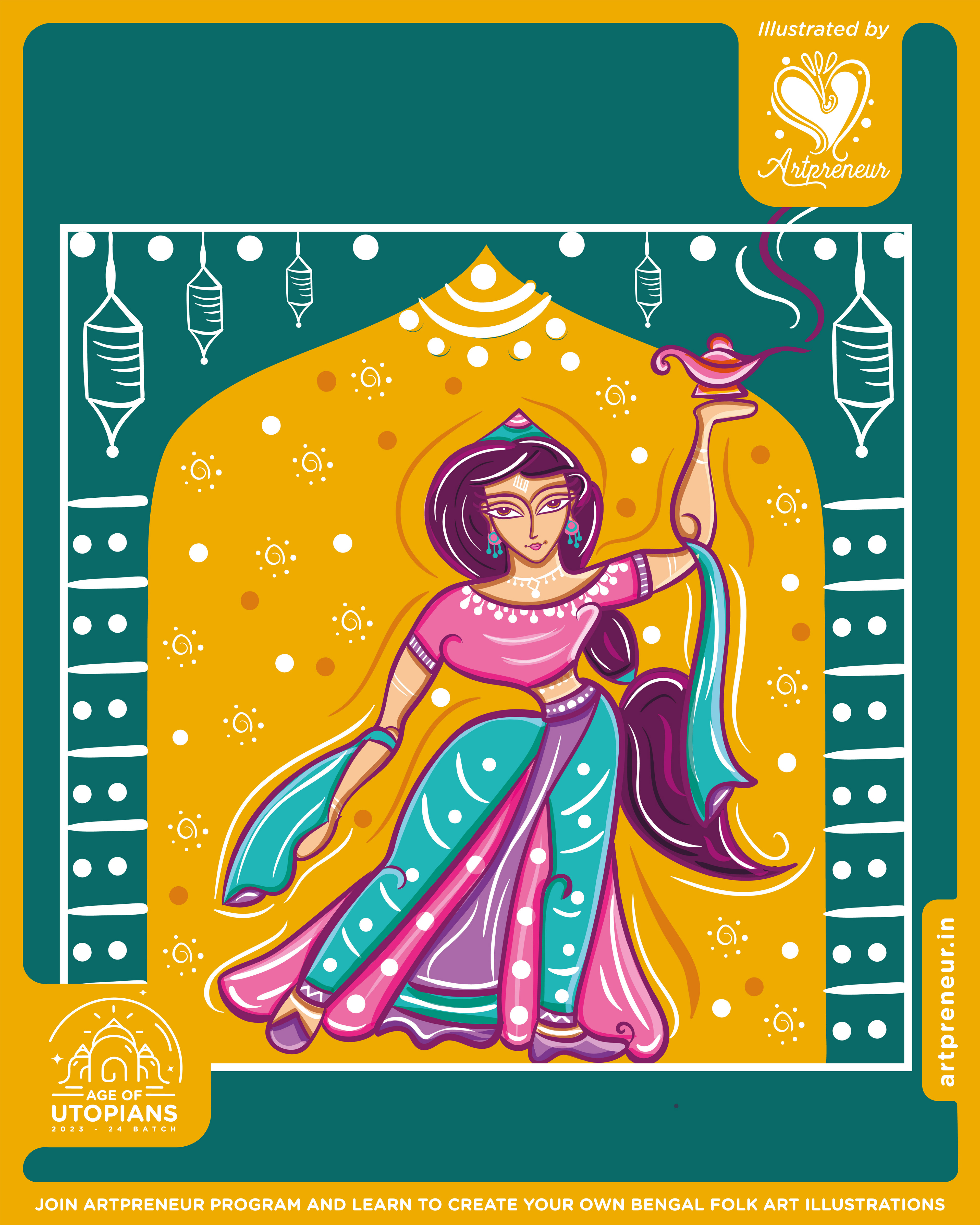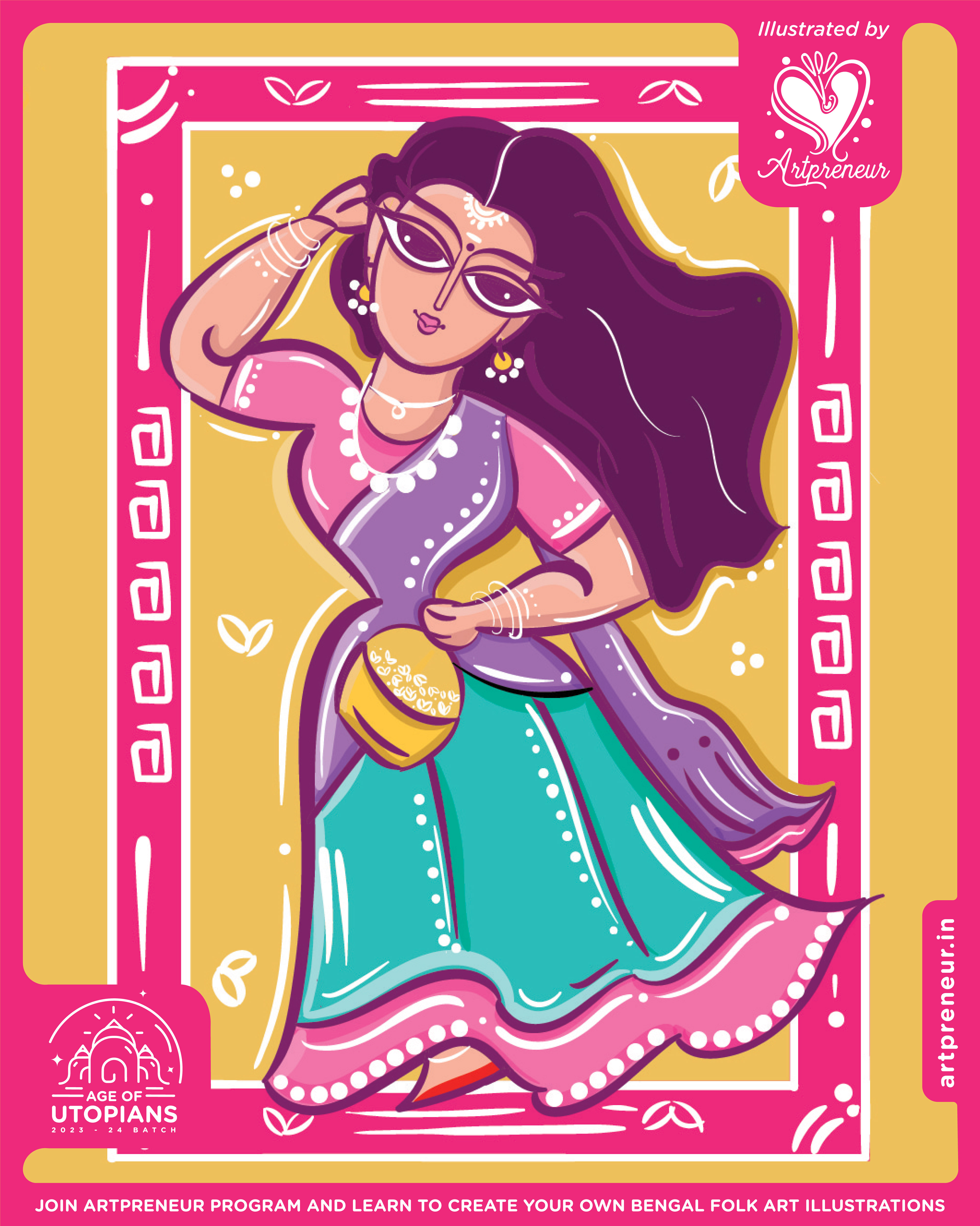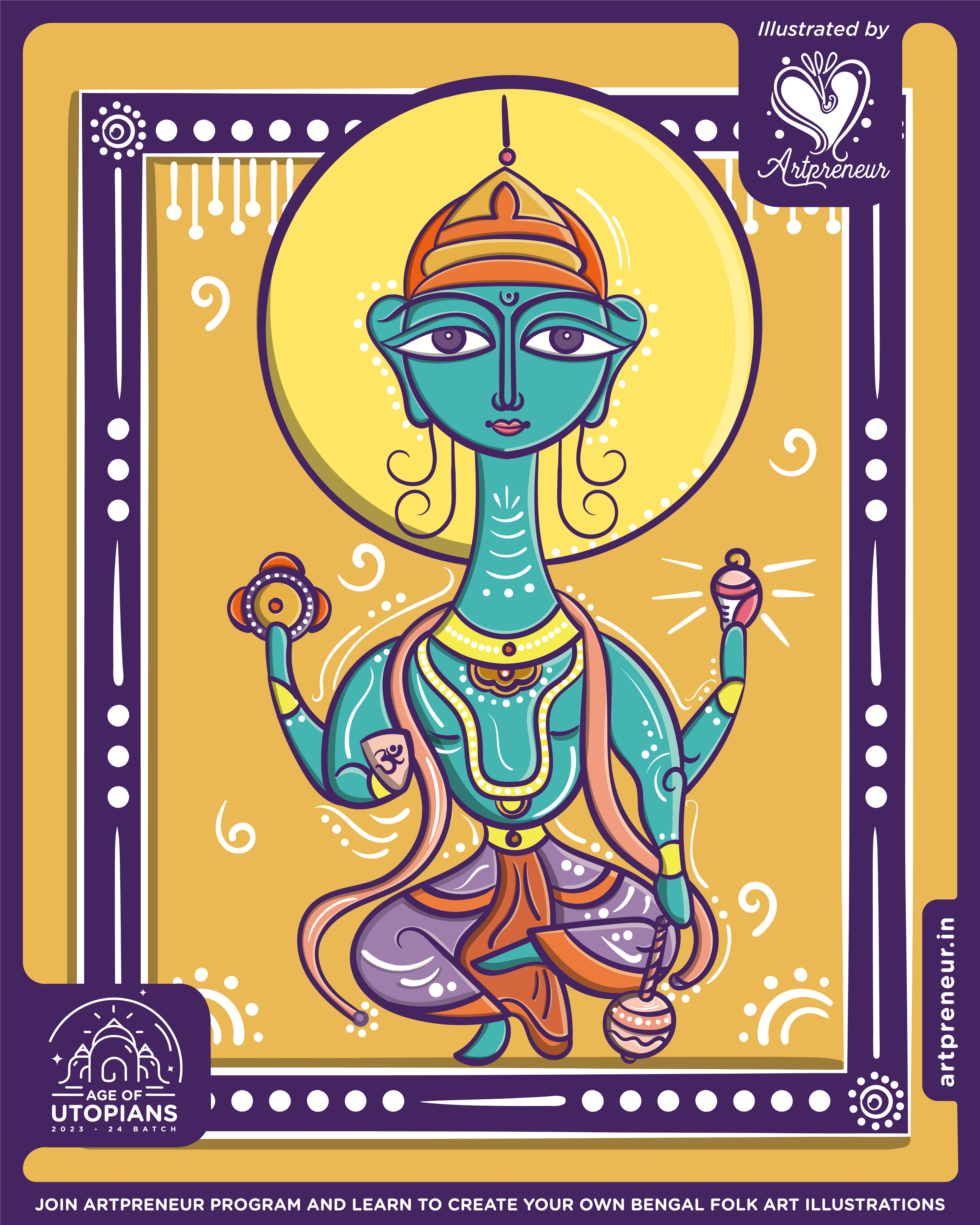 Step into the enchanting realm of Bengal Folk Art with these mesmerizing illustrations, a modern interpretation of the Bengal Pattachitra Art form from West Bengal. These stunning pieces have been created by the Age of Utopians Batch Students for the year 2023-24, who had no prior experience or knowledge in creating their own illustrations in Indian folk art forms.