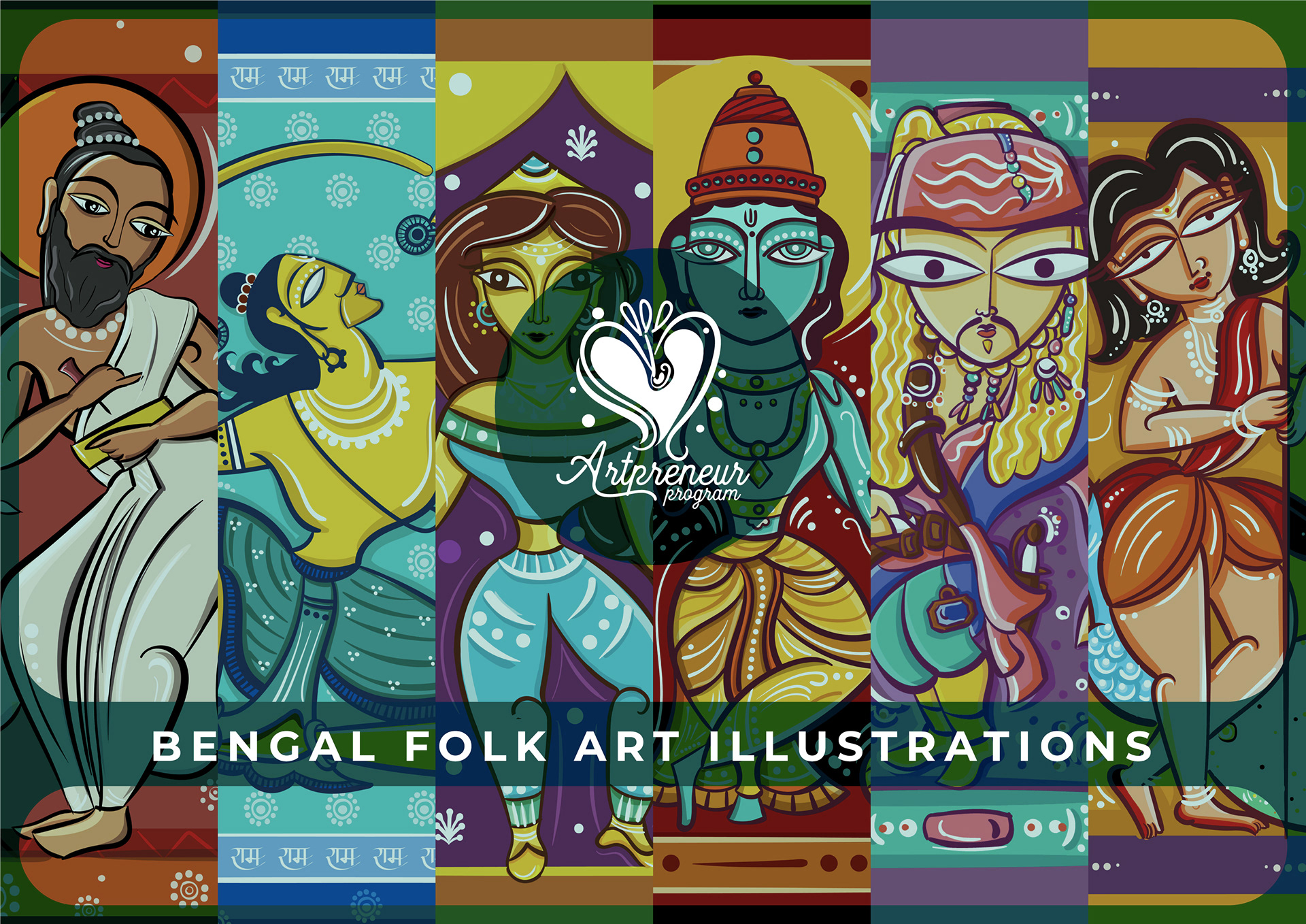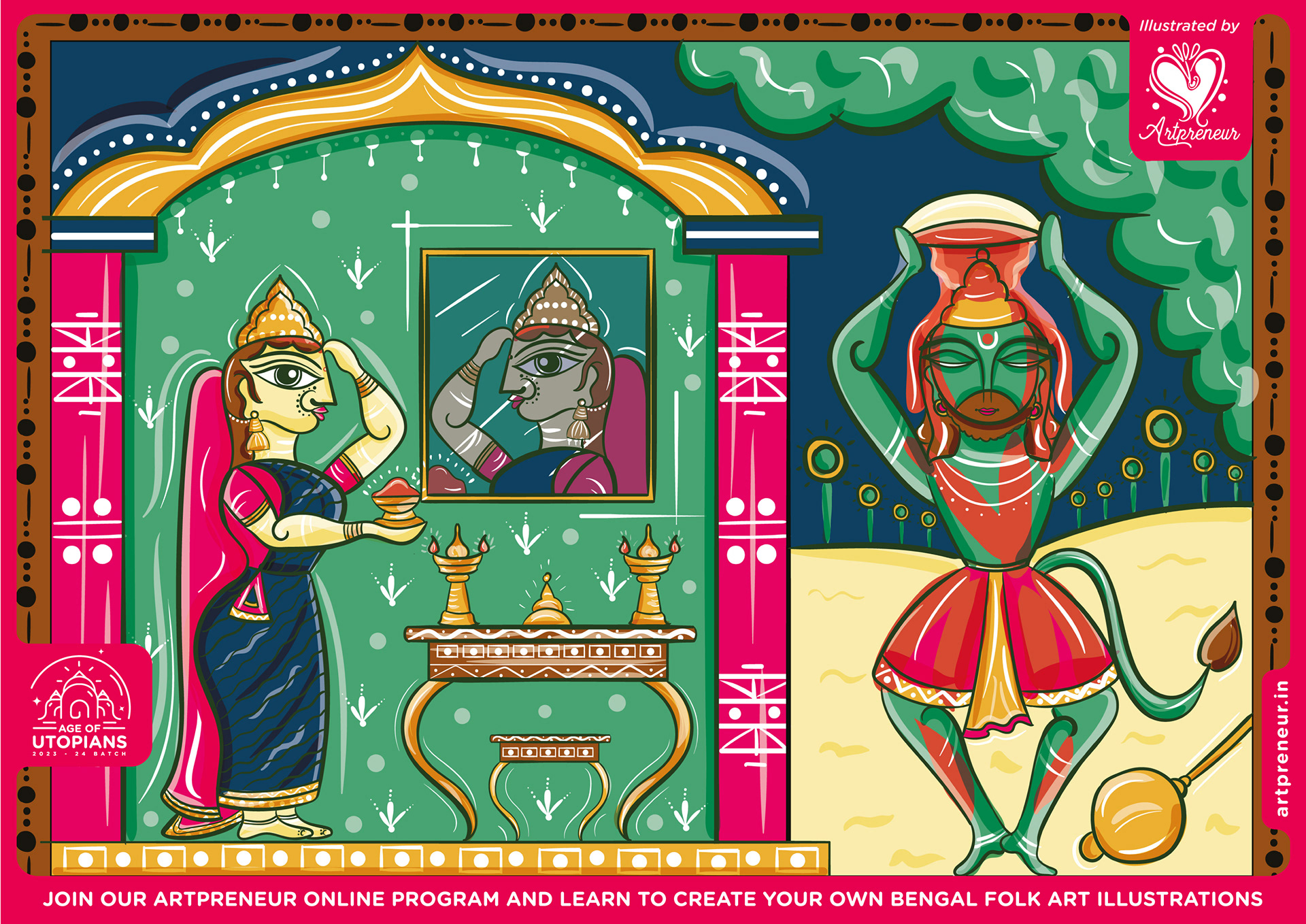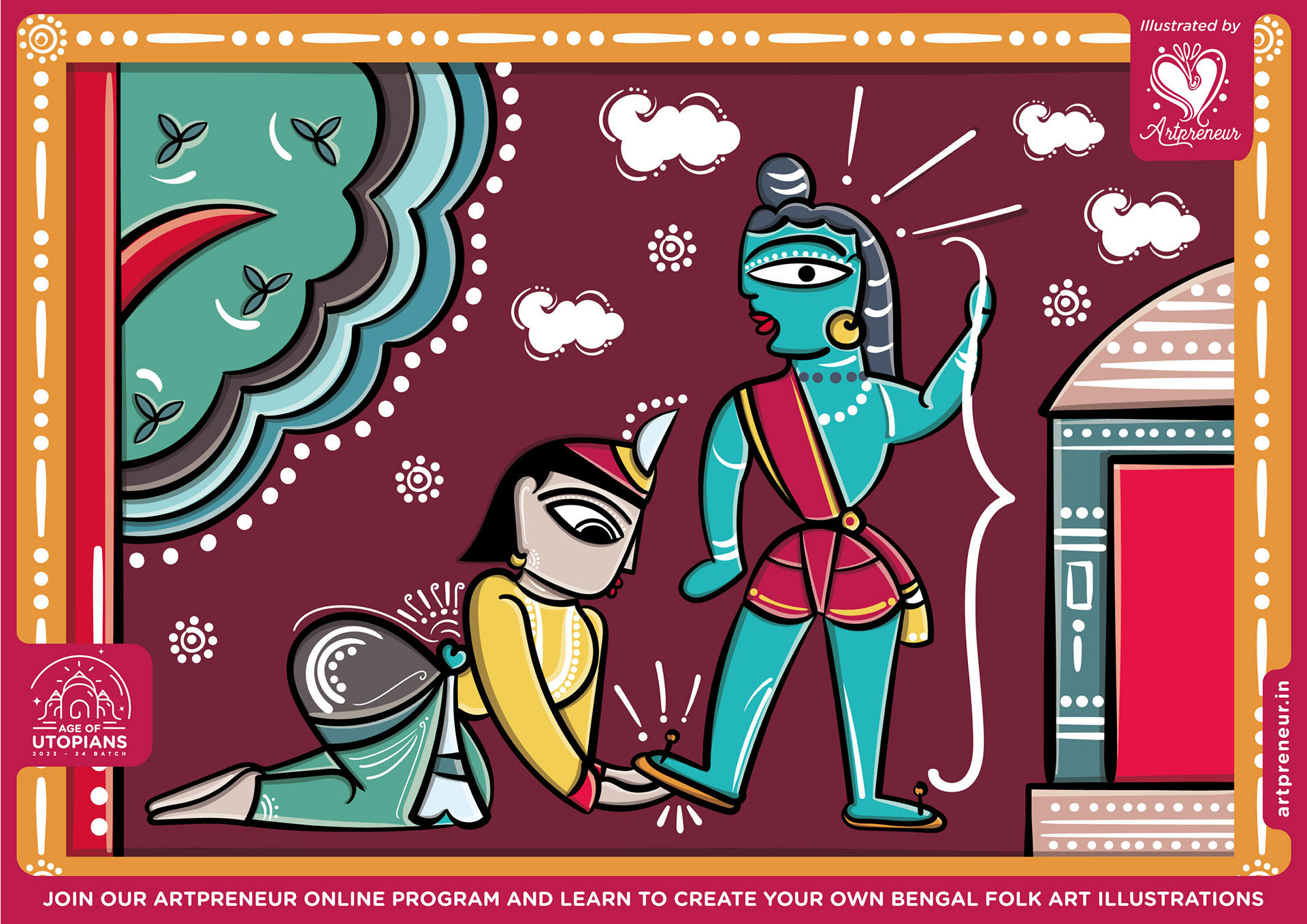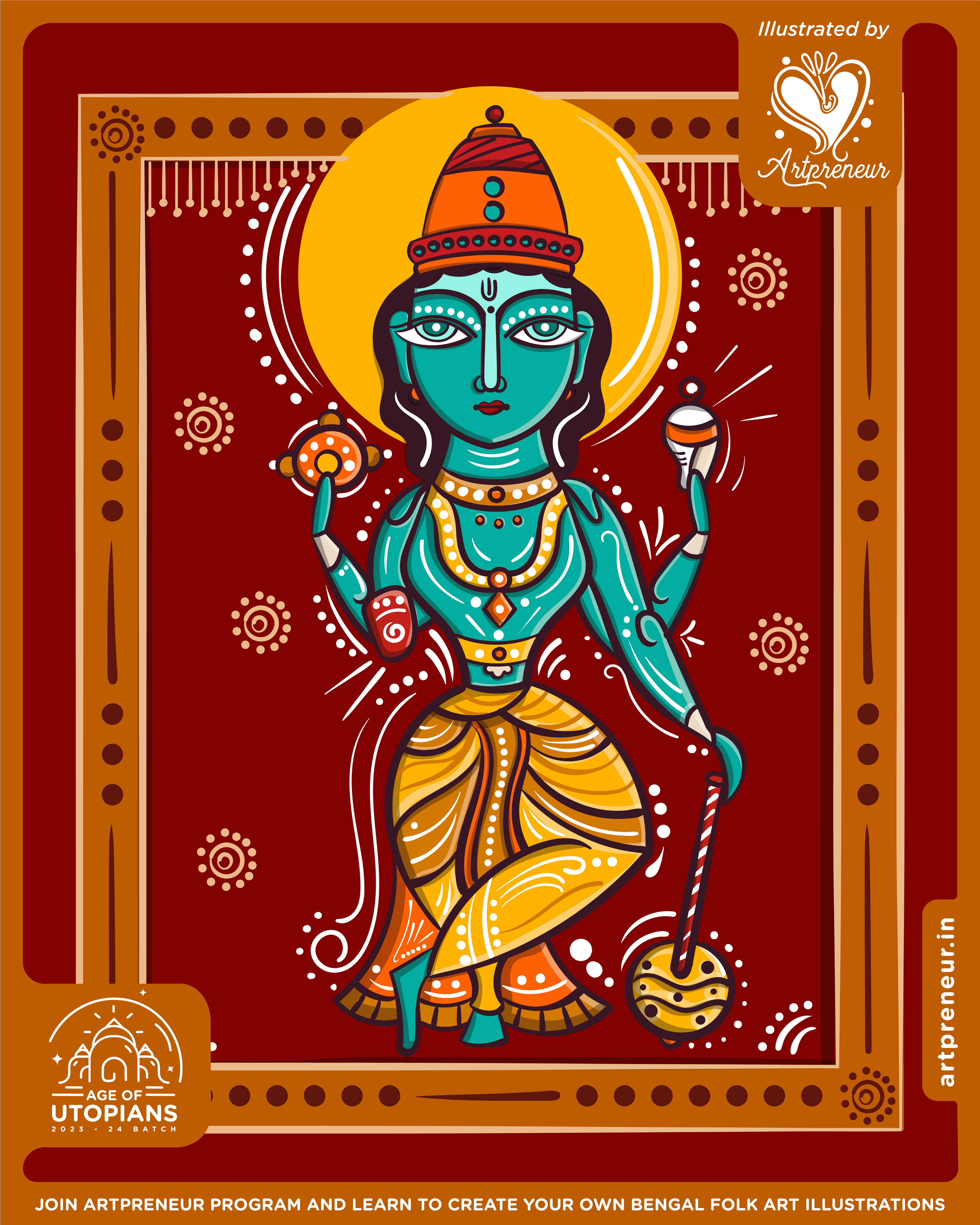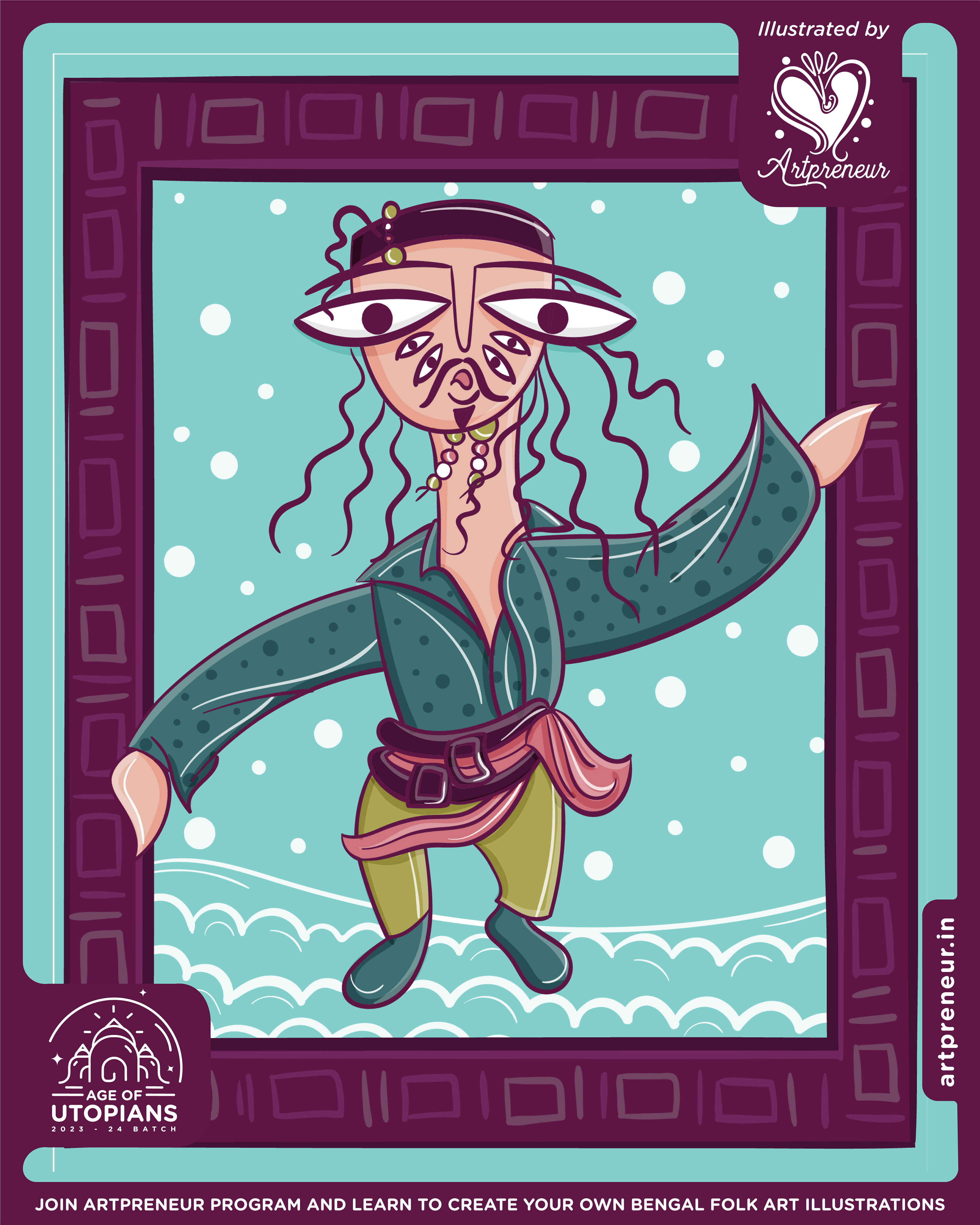 Step into the enchanting realm of Bengal Folk Art with these mesmerizing illustrations, a modern interpretation of the Bengal Pattachitra Art form from West Bengal. These stunning pieces have been created by the Age of Utopians Batch Students for the year 2023-24, who had no prior experience or knowledge in creating their own illustrations in Indian folk art forms.