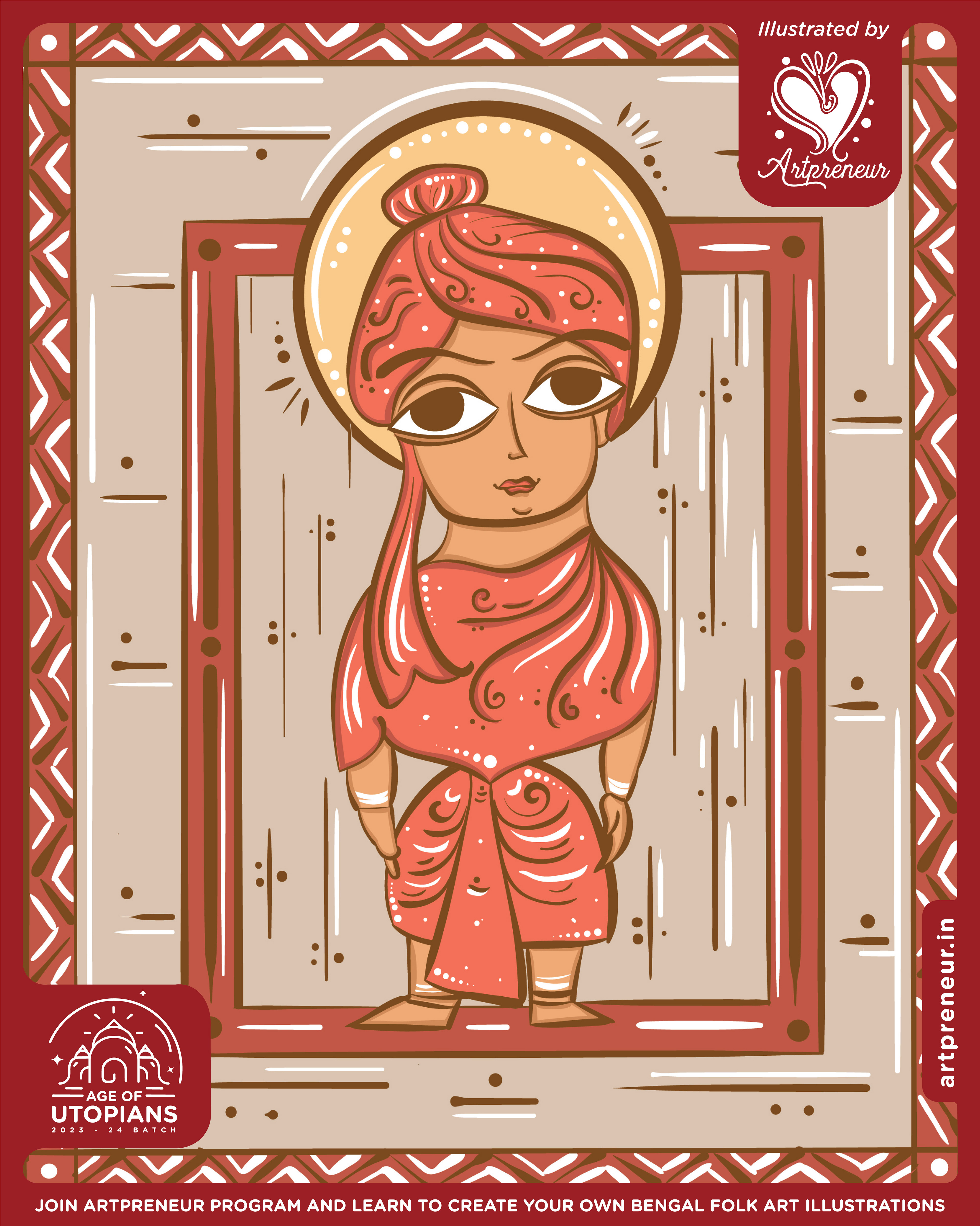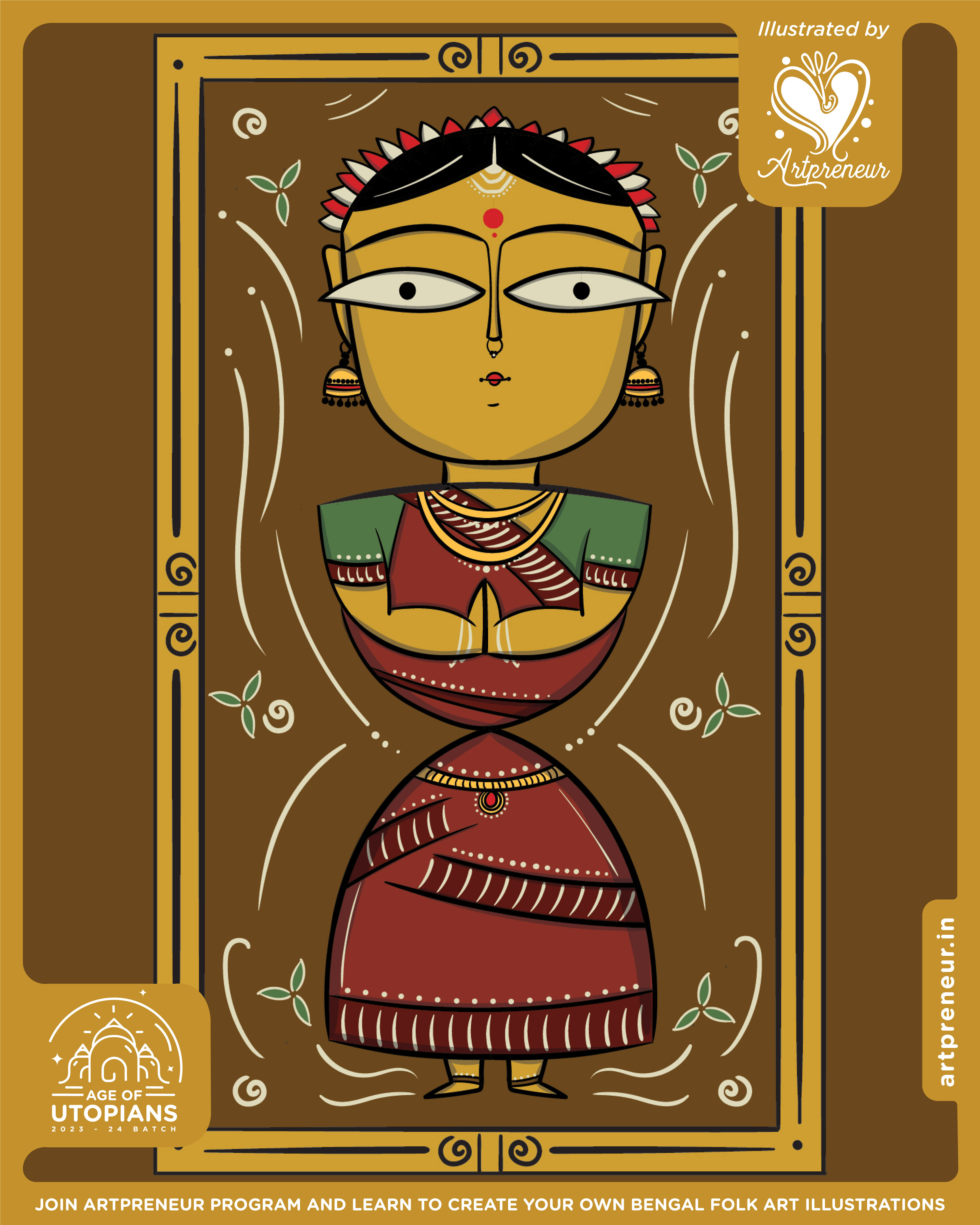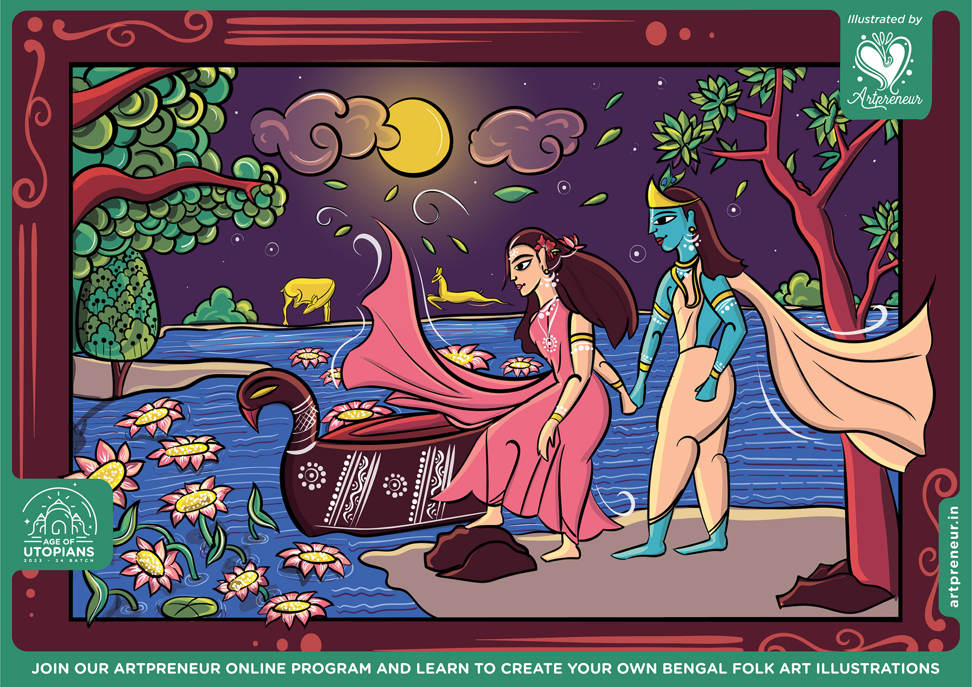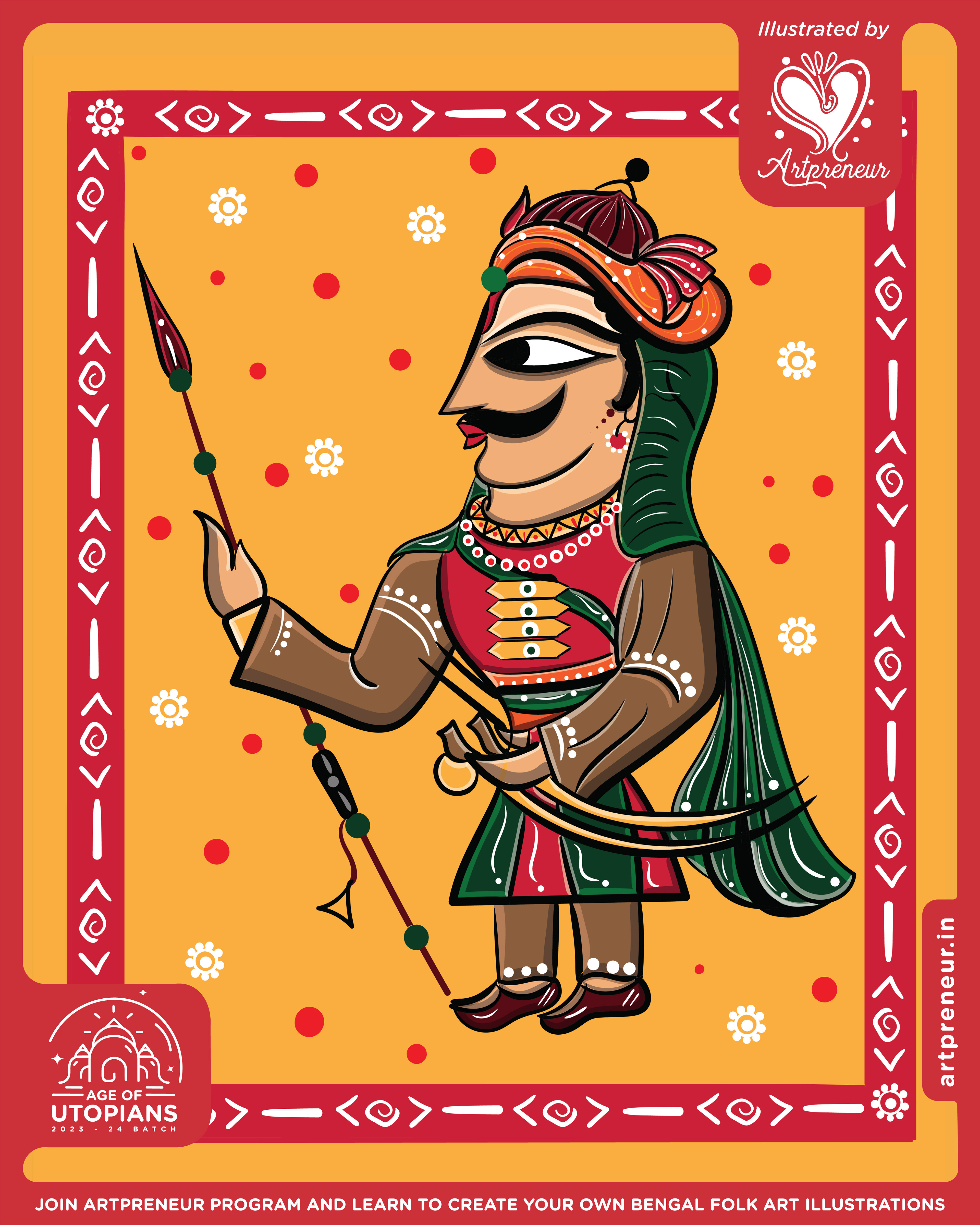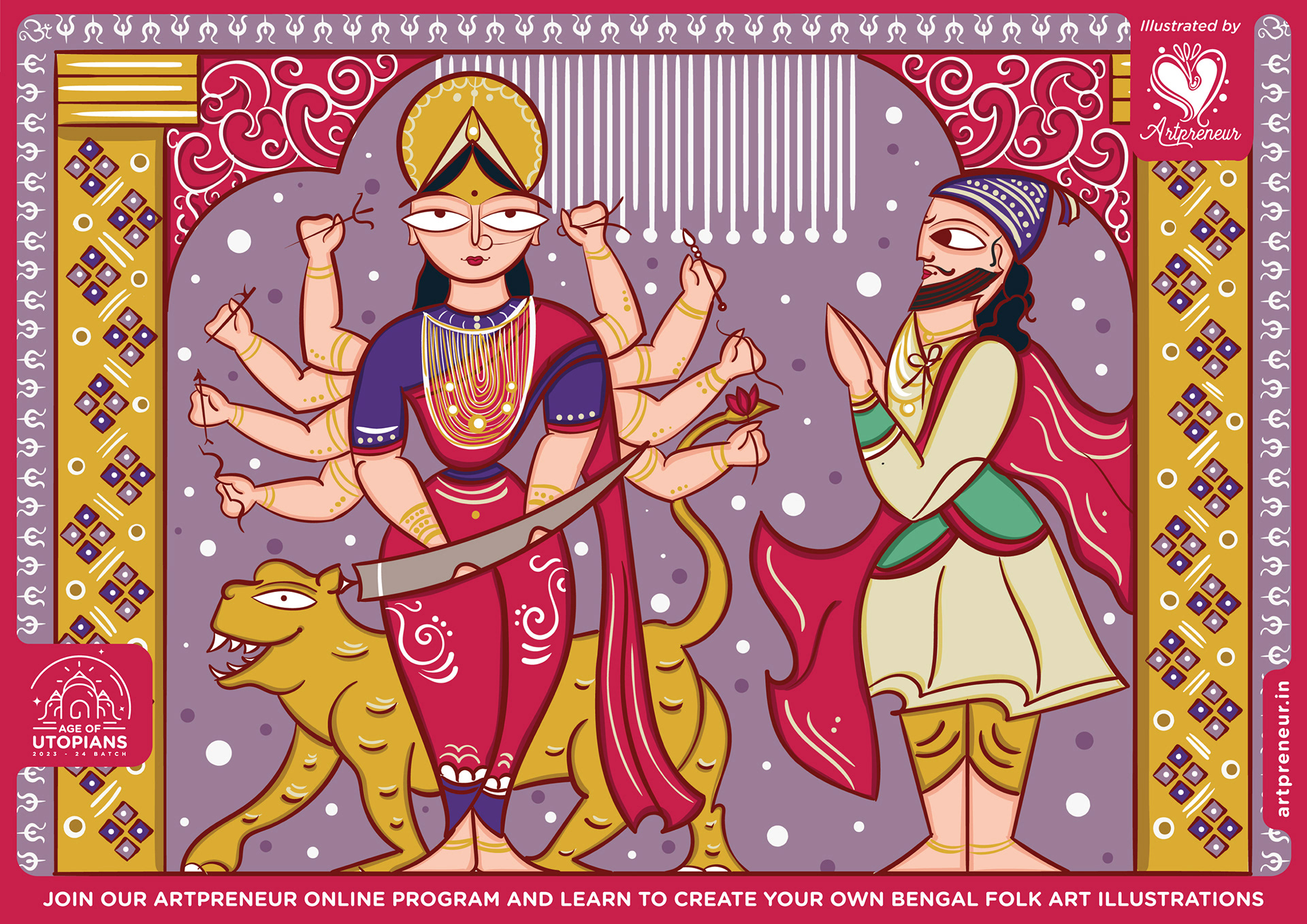 Step into the enchanting realm of Bengal Folk Art with these mesmerizing illustrations, a modern interpretation of the Bengal Pattachitra Art form from West Bengal. These stunning pieces have been created by the Age of Utopians Batch Students for the year 2023-24, who had no prior experience or knowledge in creating their own illustrations in Indian folk art forms.