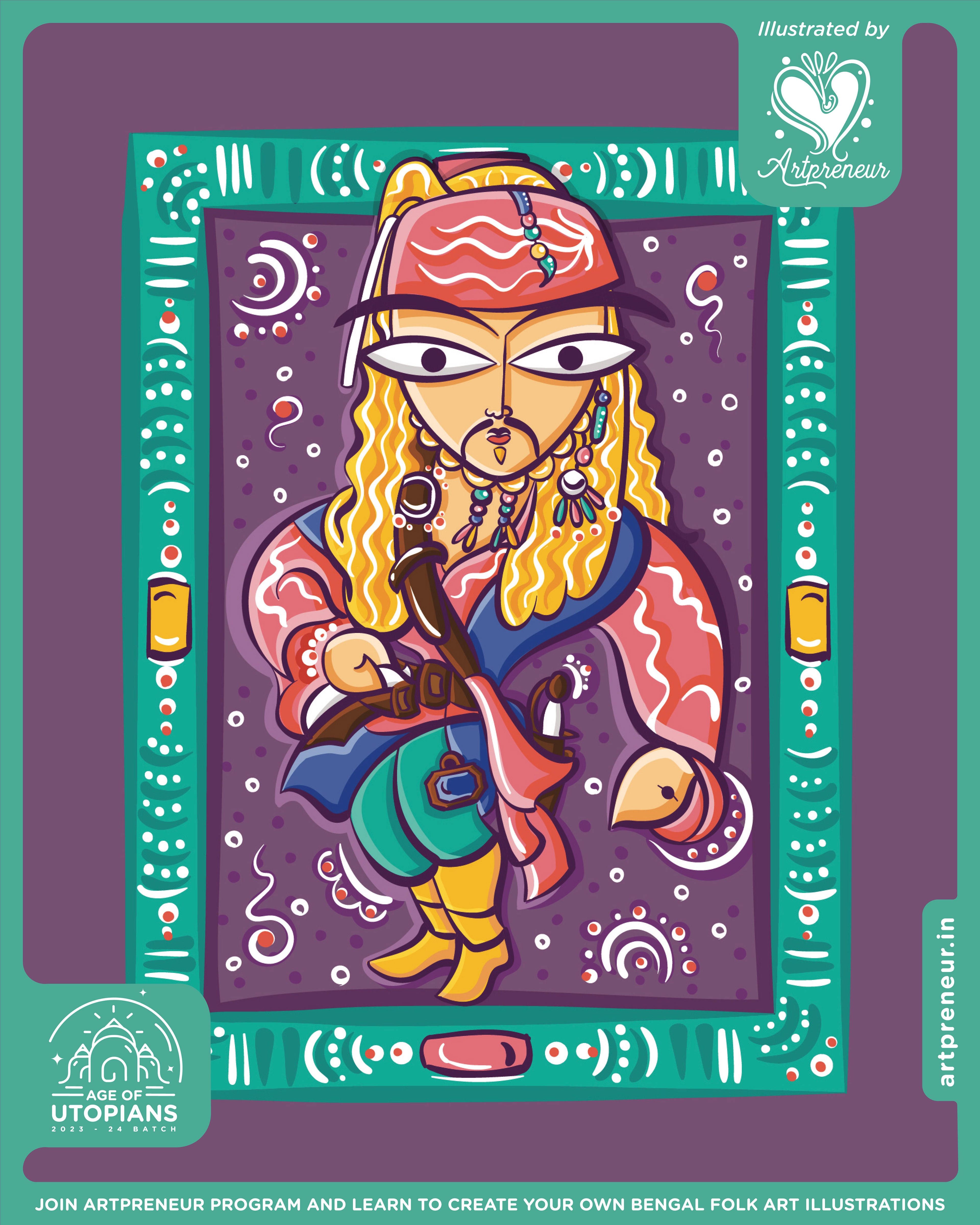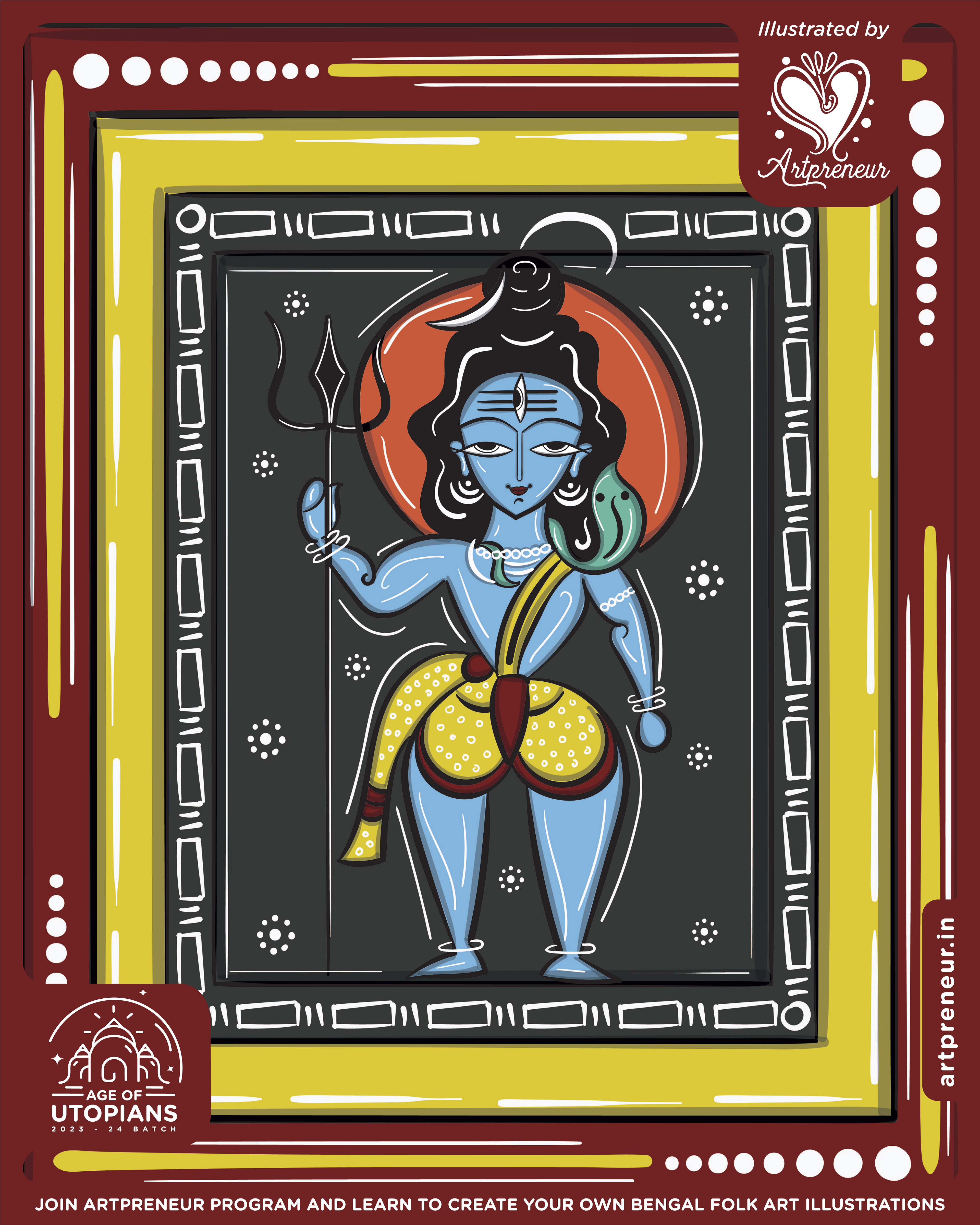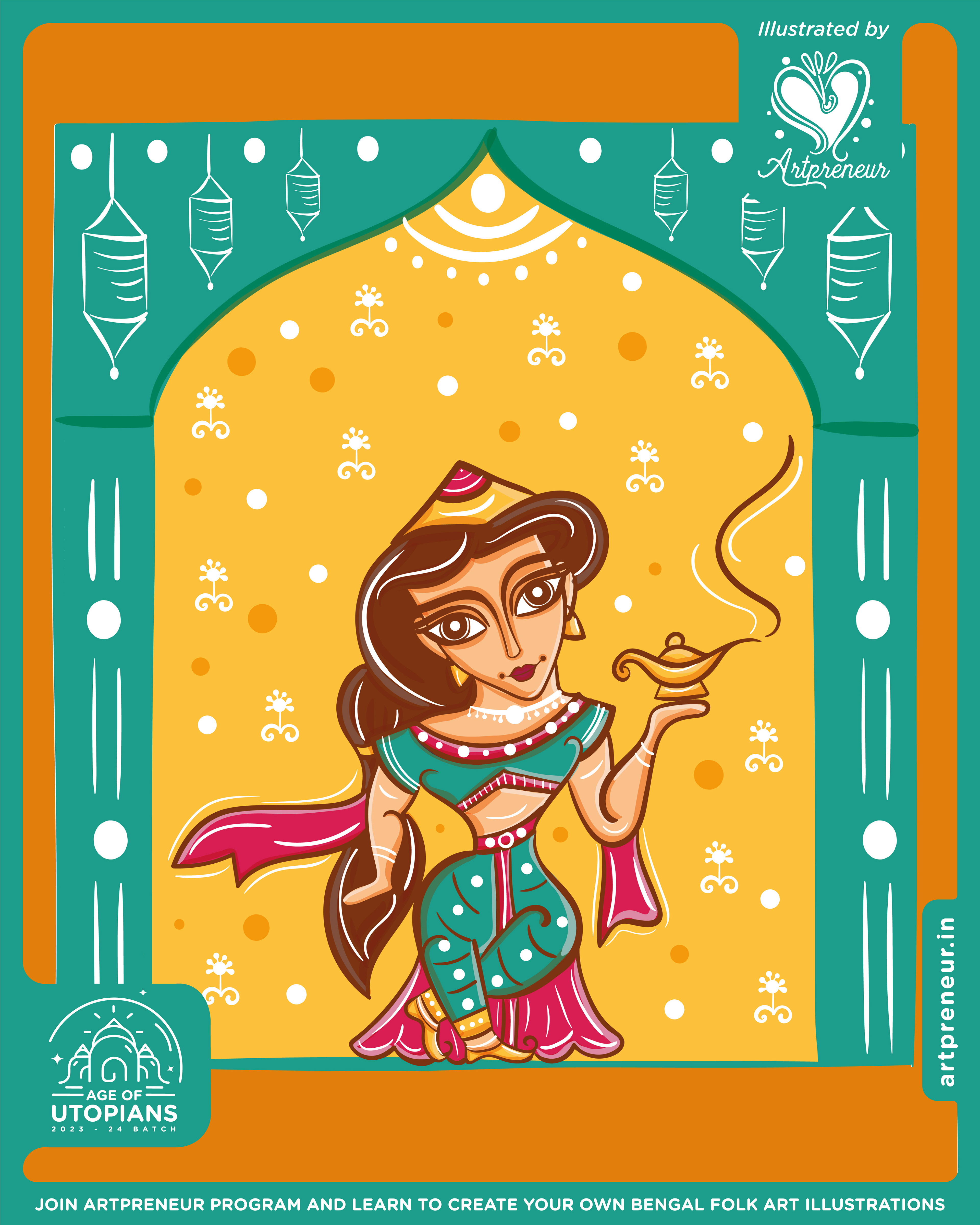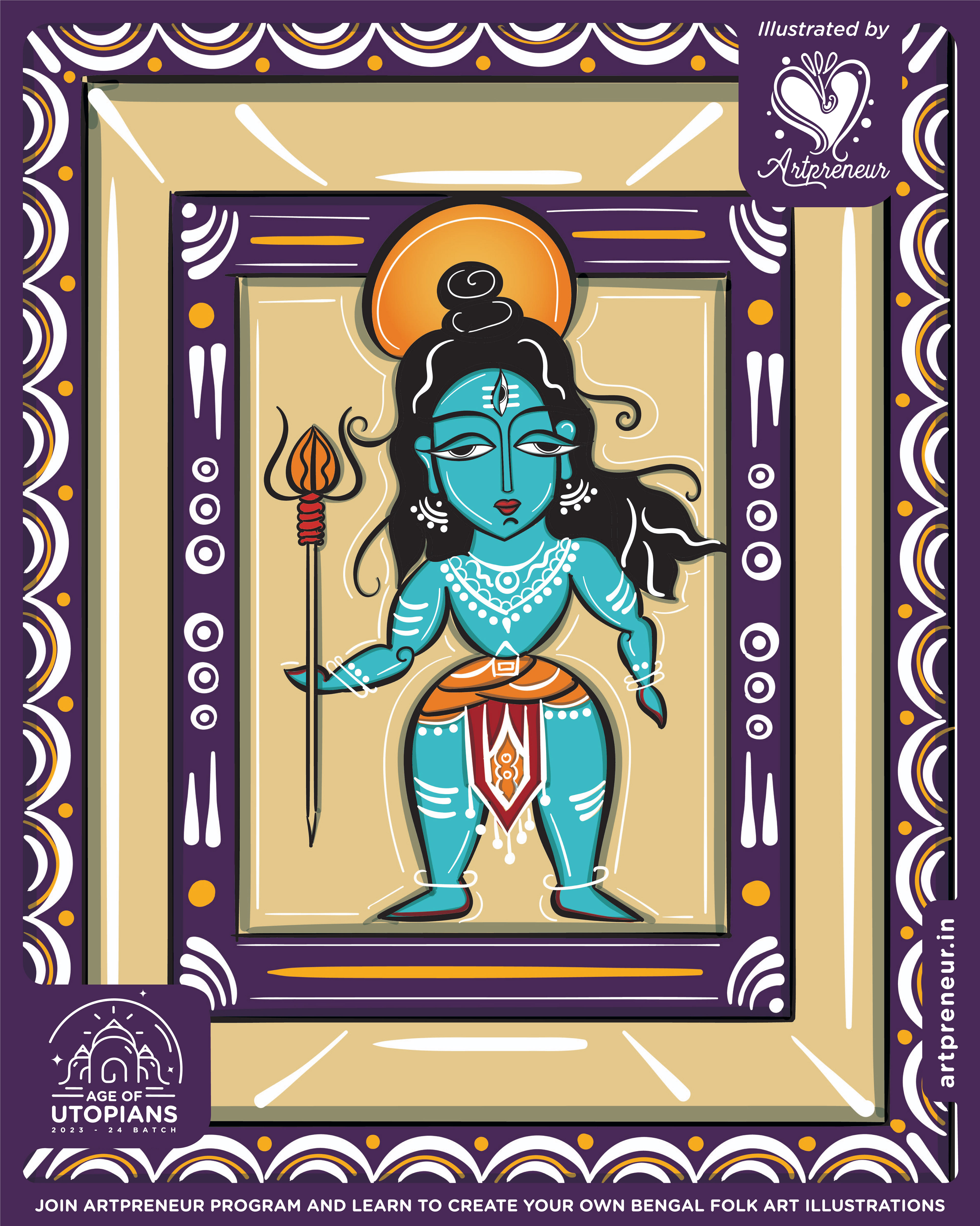 Step into the enchanting realm of Bengal Folk Art with these mesmerizing illustrations, a modern interpretation of the Bengal Pattachitra Art form from West Bengal. These stunning pieces have been created by the Age of Utopians Batch Students for the year 2023-24, who had no prior experience or knowledge in creating their own illustrations in Indian folk art forms.