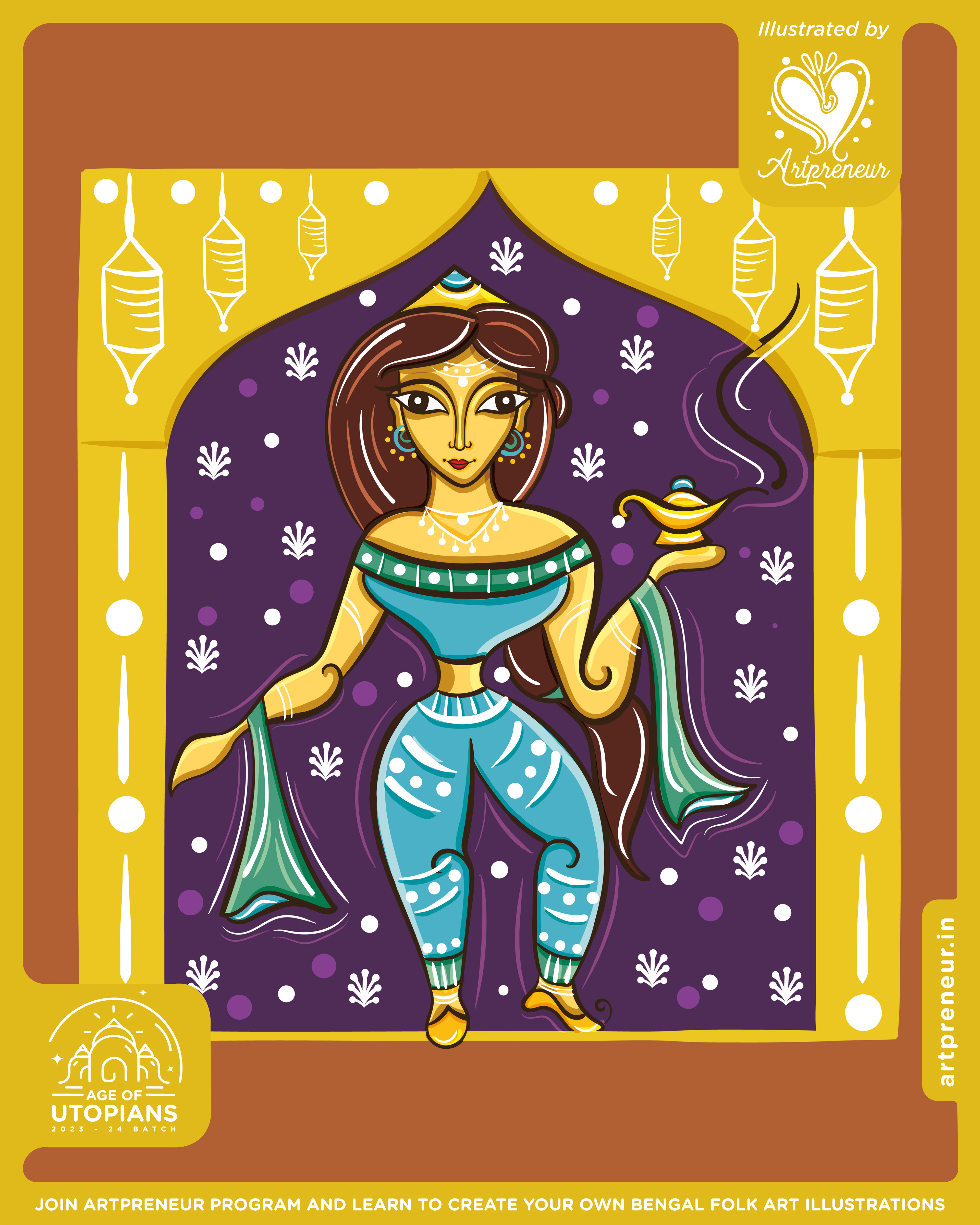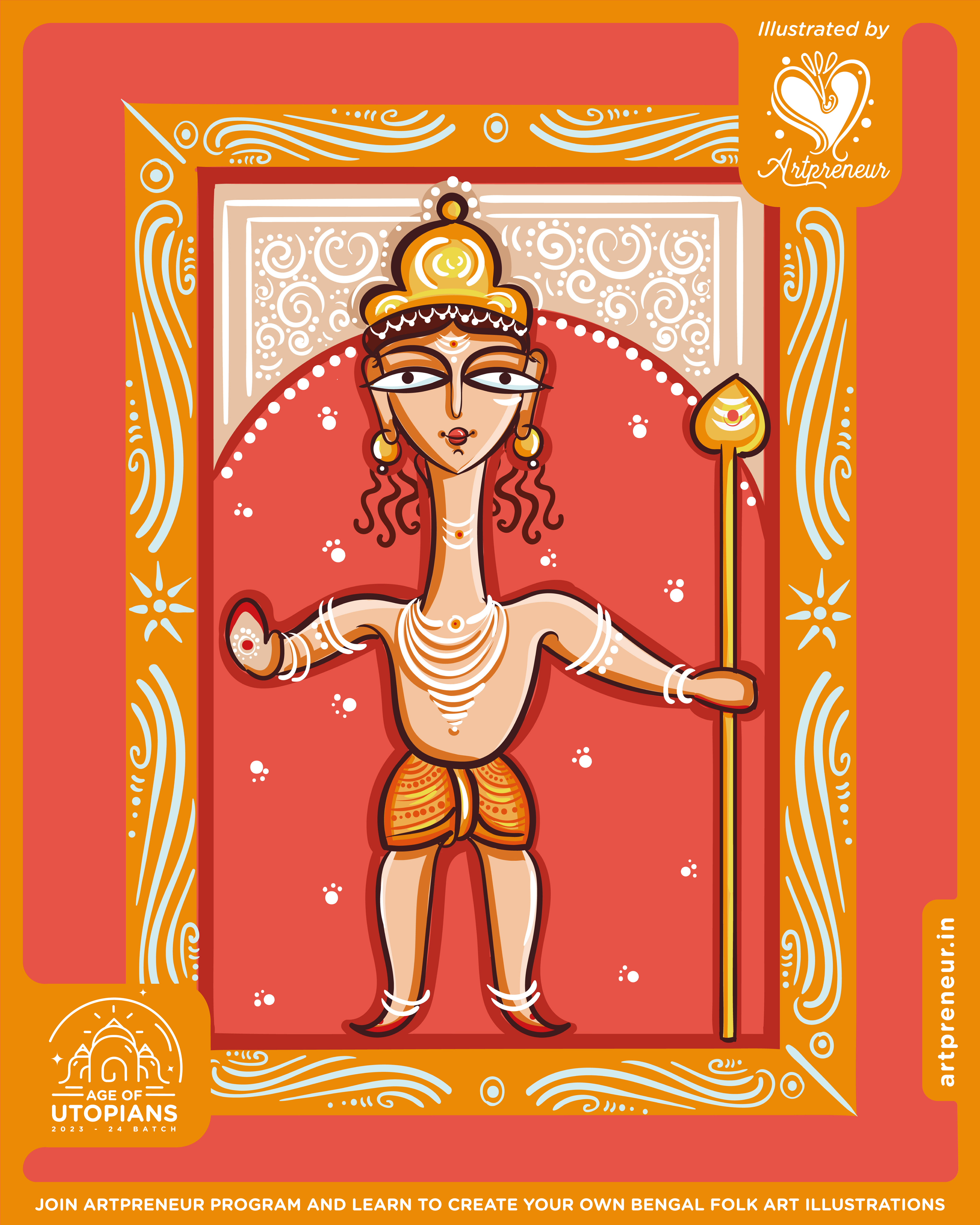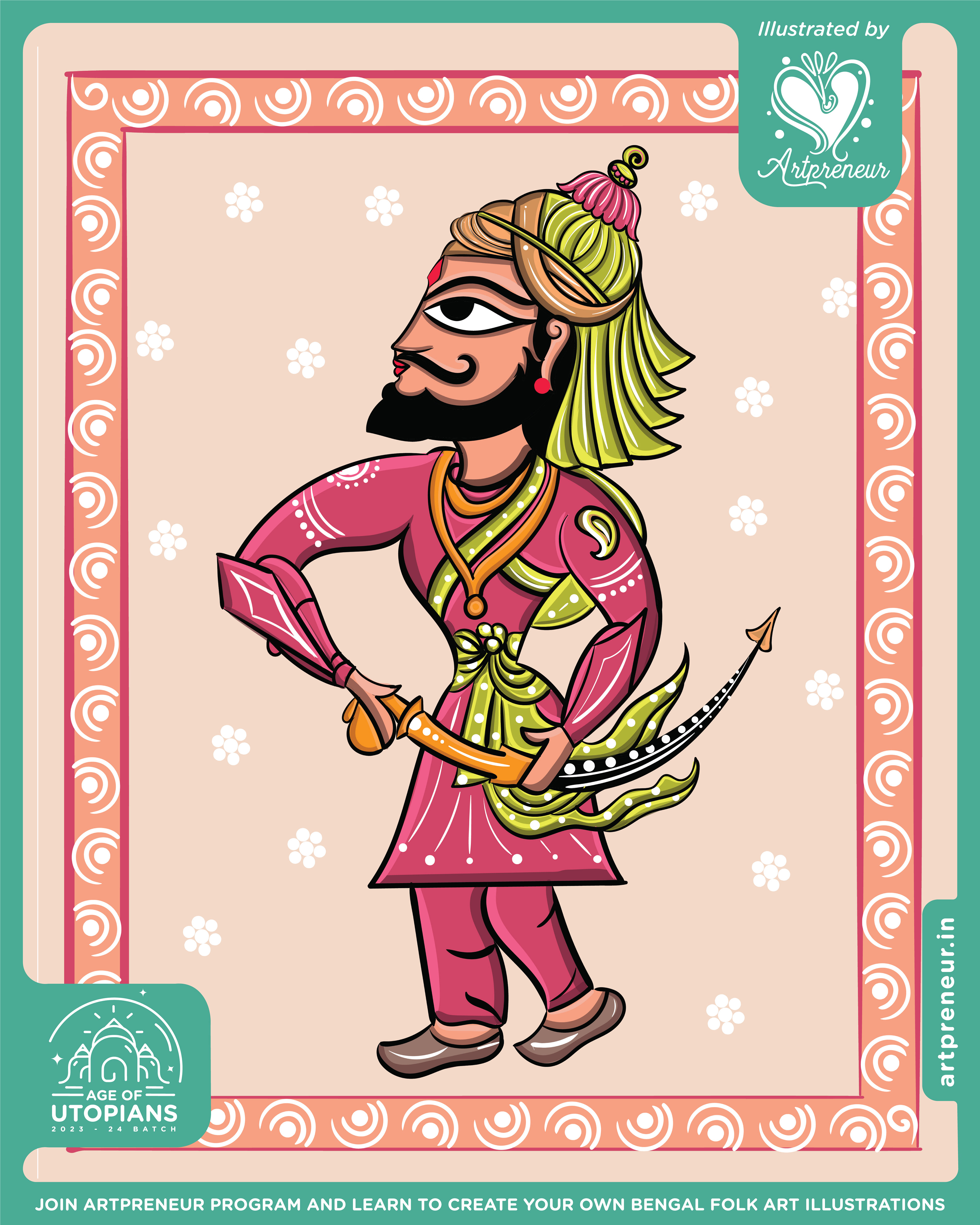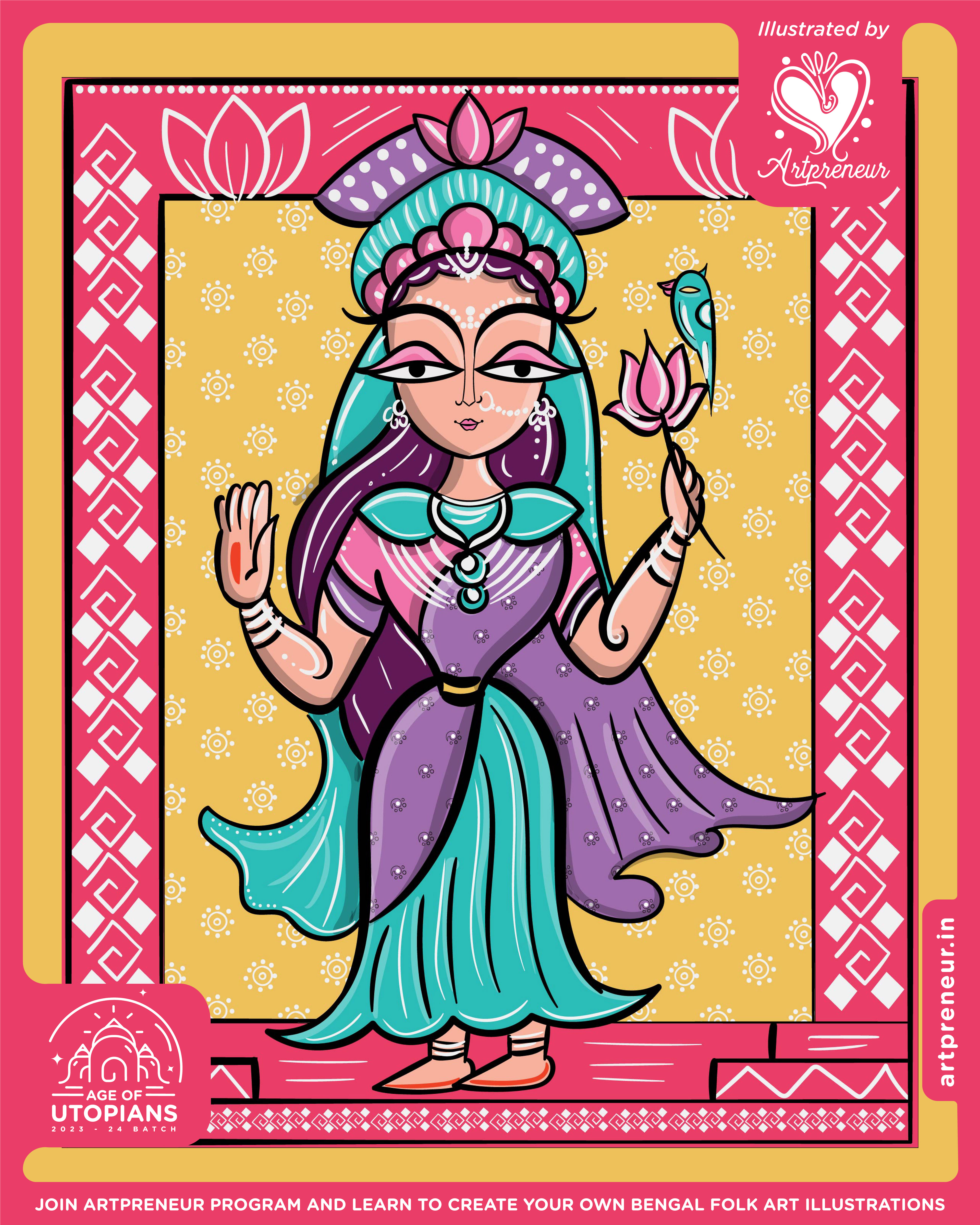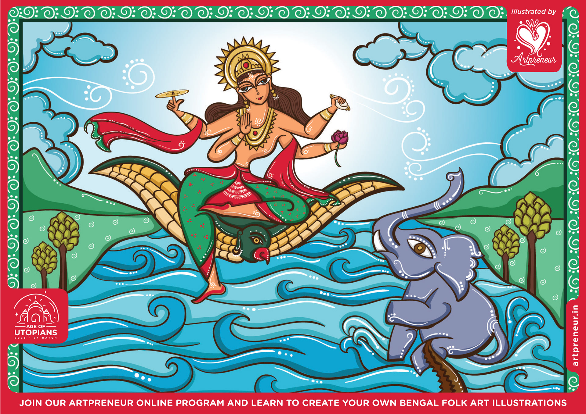 Step into the enchanting realm of Bengal Folk Art with these mesmerizing illustrations, a modern interpretation of the Bengal Pattachitra Art form from West Bengal. These stunning pieces have been created by the Age of Utopians Batch Students for the year 2023-24, who had no prior experience or knowledge in creating their own illustrations in Indian folk art forms.