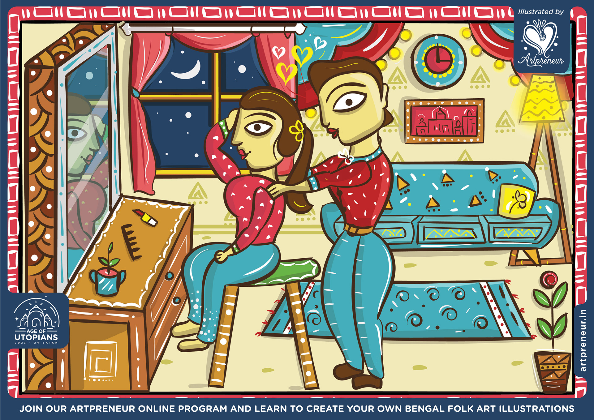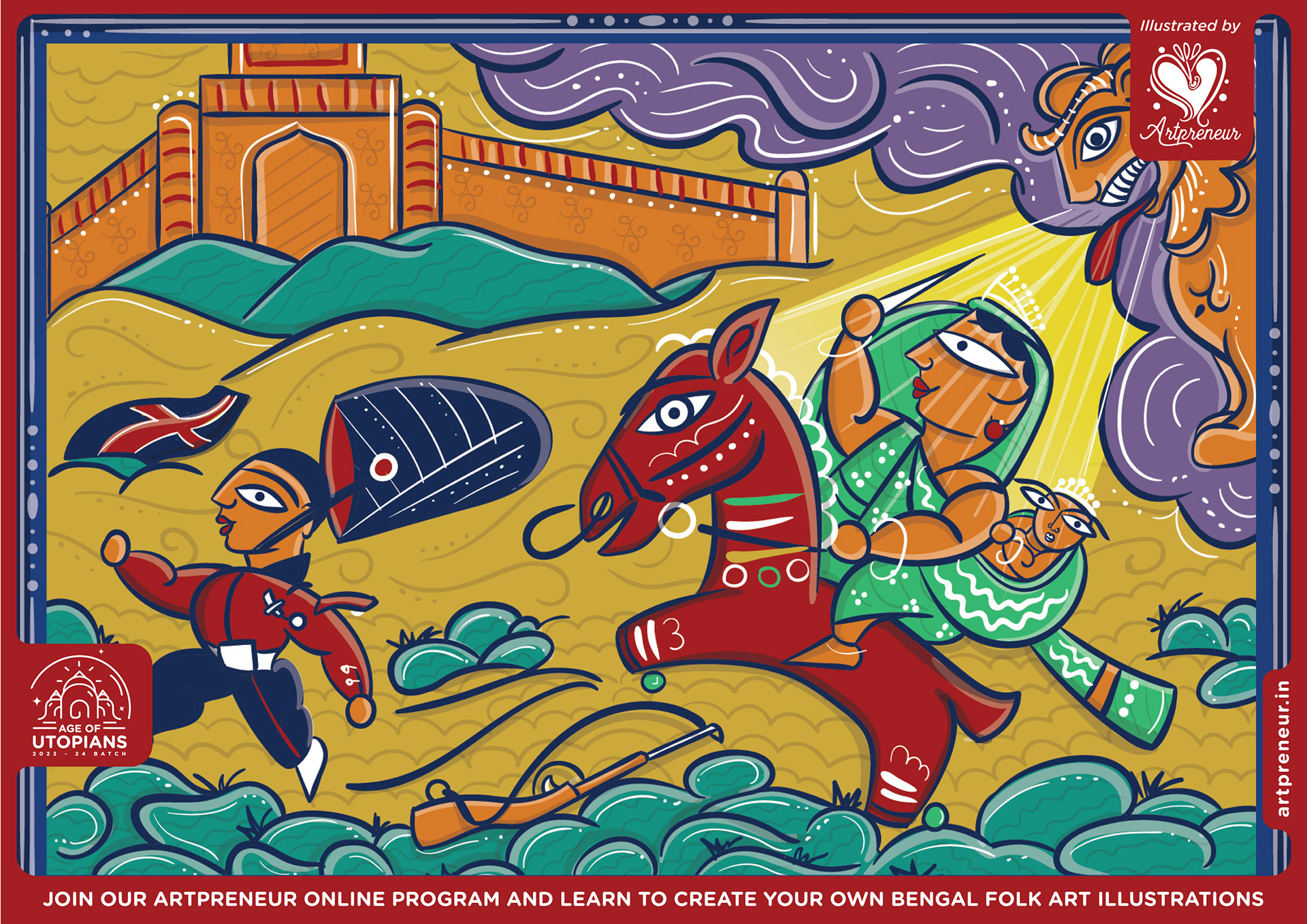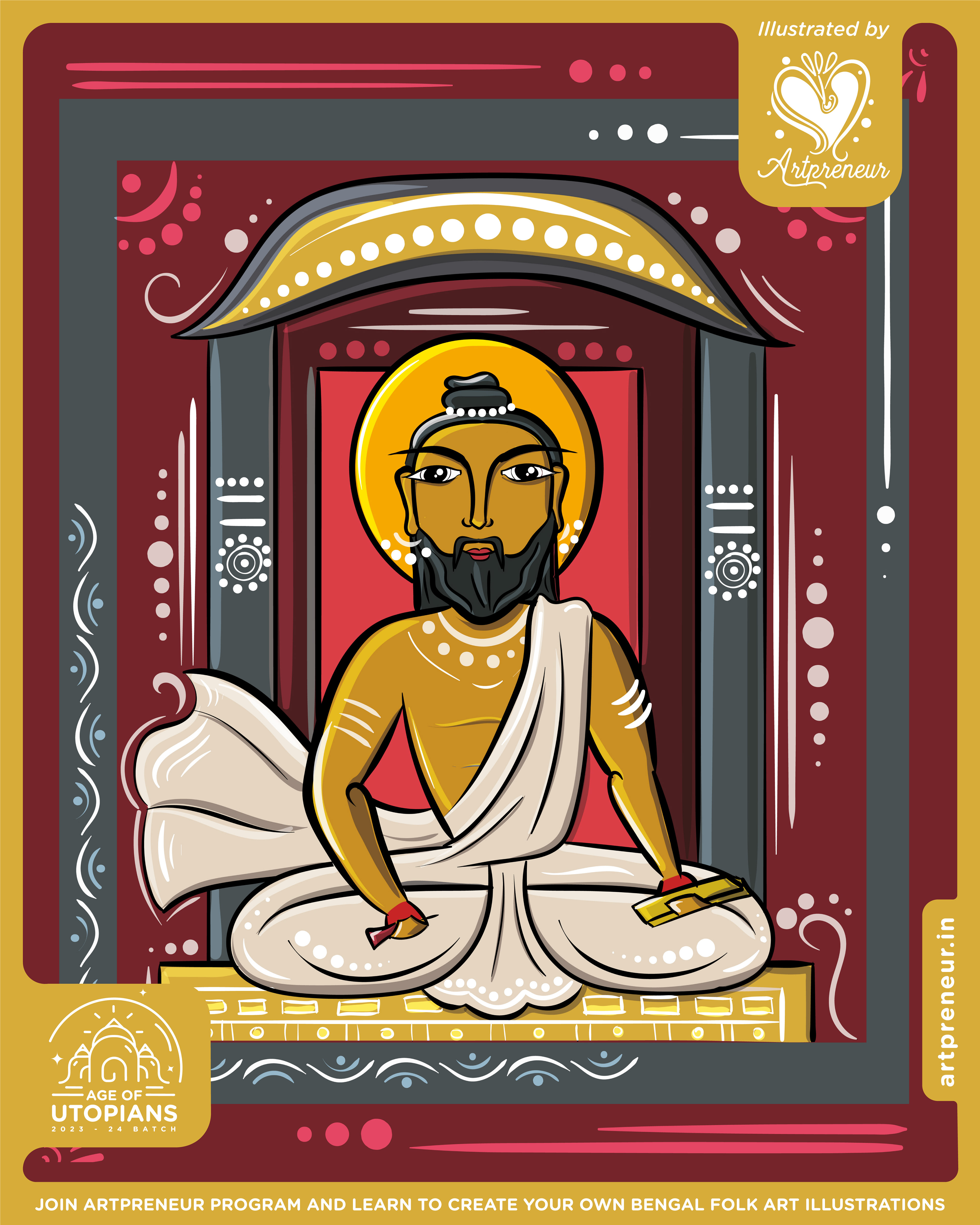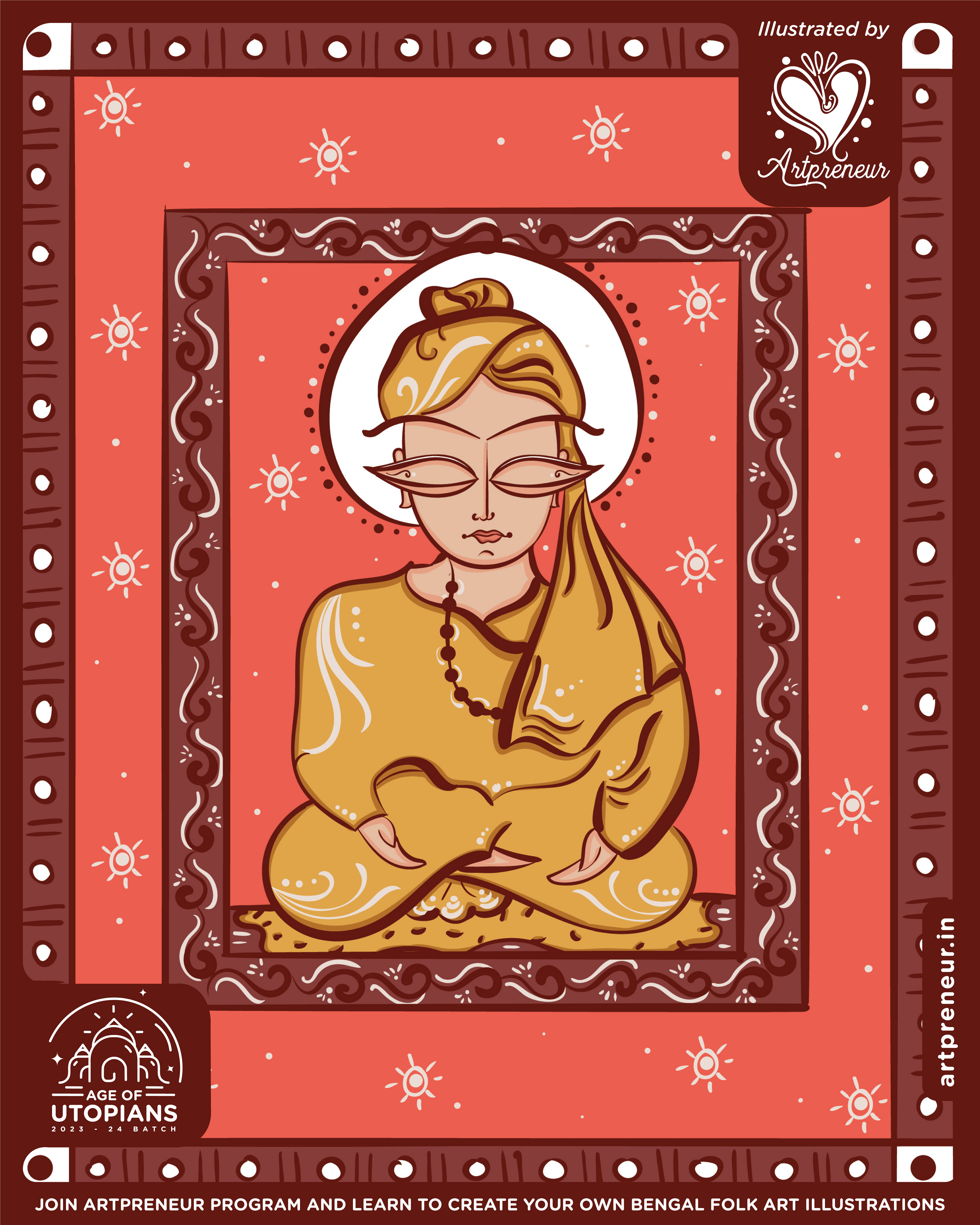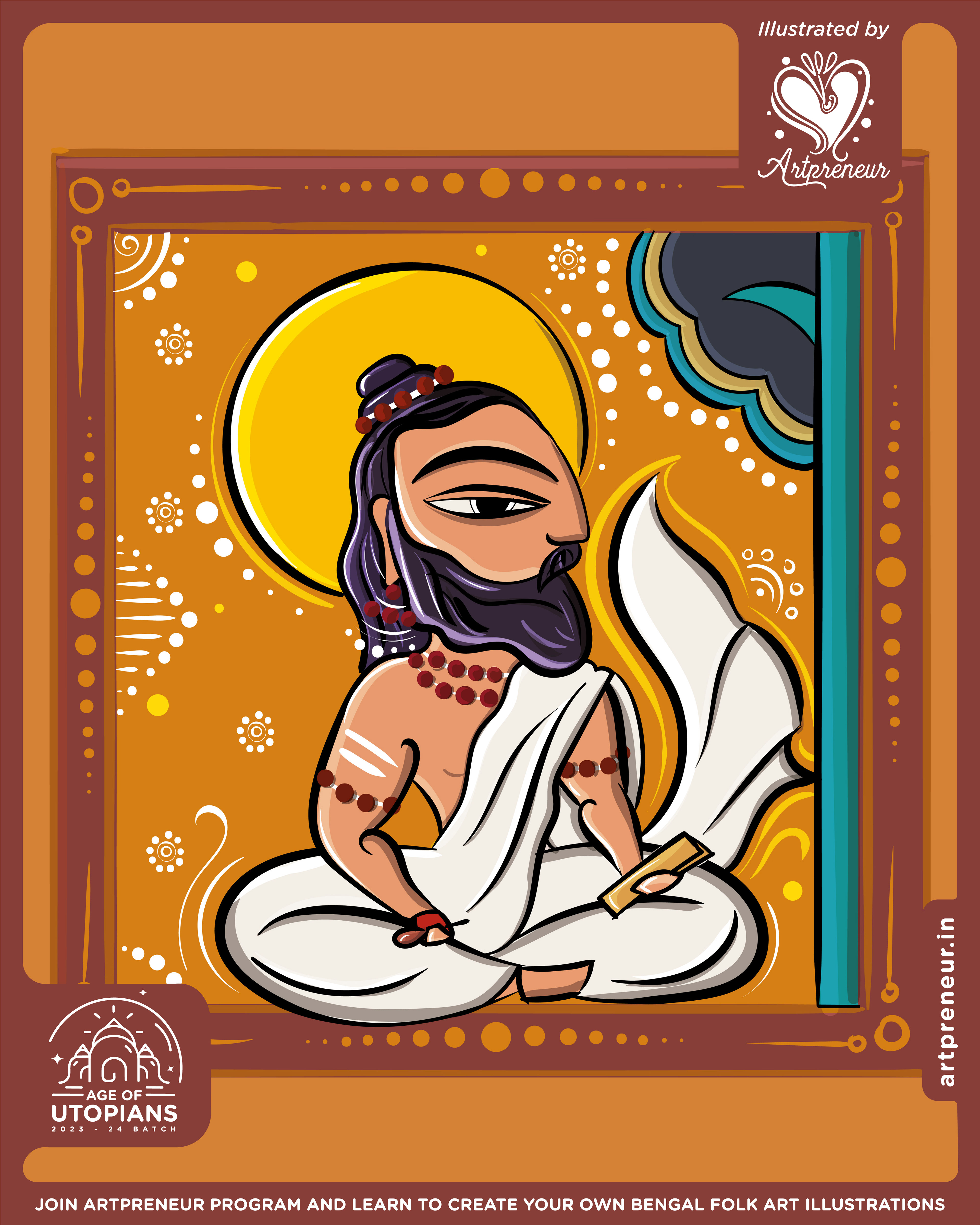 Step into the enchanting realm of Bengal Folk Art with these mesmerizing illustrations, a modern interpretation of the Bengal Pattachitra Art form from West Bengal. These stunning pieces have been created by the Age of Utopians Batch Students for the year 2023-24, who had no prior experience or knowledge in creating their own illustrations in Indian folk art forms.