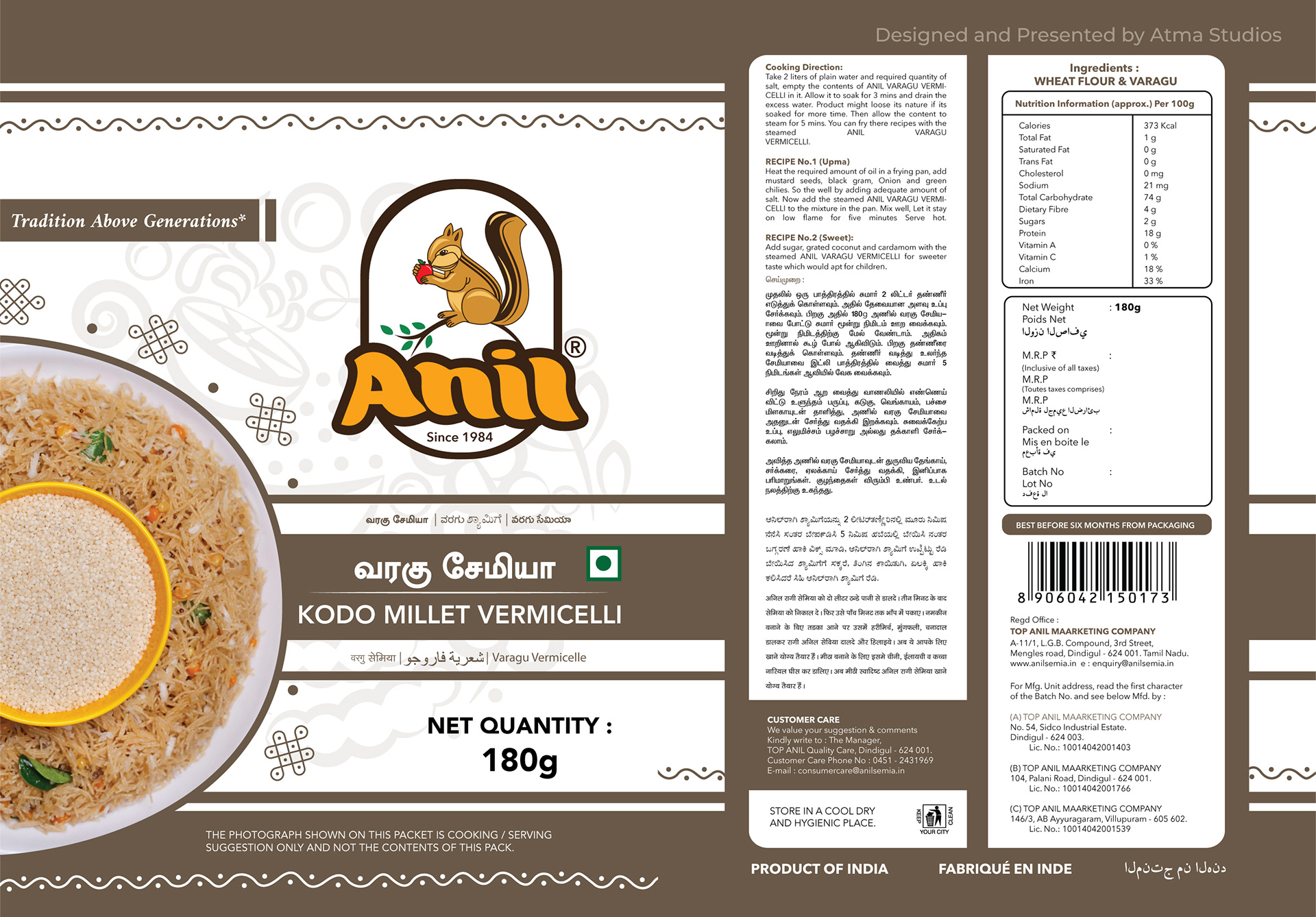 Anil Group is a beloved Indian FMCG brand rooted in tradition but thriving in modern kitchens since 1984. With a rich legacy of crafting wholesome, affordable and delicious food staples from vermicelli, rava and flour to noodles, appalam, salt and more, Anil has become a staple in households across South India and beyond, earning the trust of families and food lovers alike. For decades, Anil’s packaging has stood on shelves as a symbol of quality and reliability. In this project, we had the opportunity to reimagine the brand’s visual identity and overhaul 23 product packaging designs to better reflect the brand’s heritage while making it fresh, vibrant and contemporary for today’s consumers. Our redesign bridges tradition and modernity, celebrating Anil’s legacy while amplifying shelf presence and consumer appeal, bringing a timeless brand into a bold new era of FMCG design.