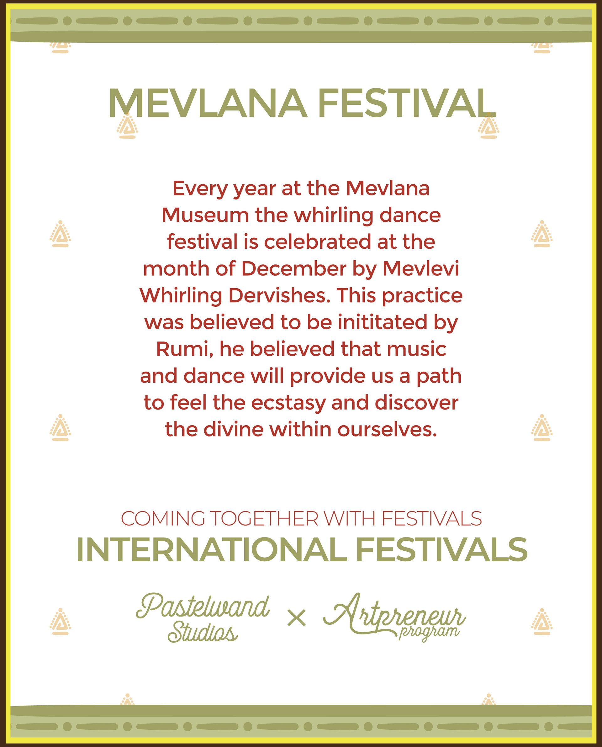 Every year at the Mevlana Museum the whirling dance festival is celebrated at the month of December by Mevlevi Whirling Dervishes. This practice was believed to be inititated by Rumi, he believed that music and dance will provide us a path to feel the ecstasy and discover the divine within ourselves.