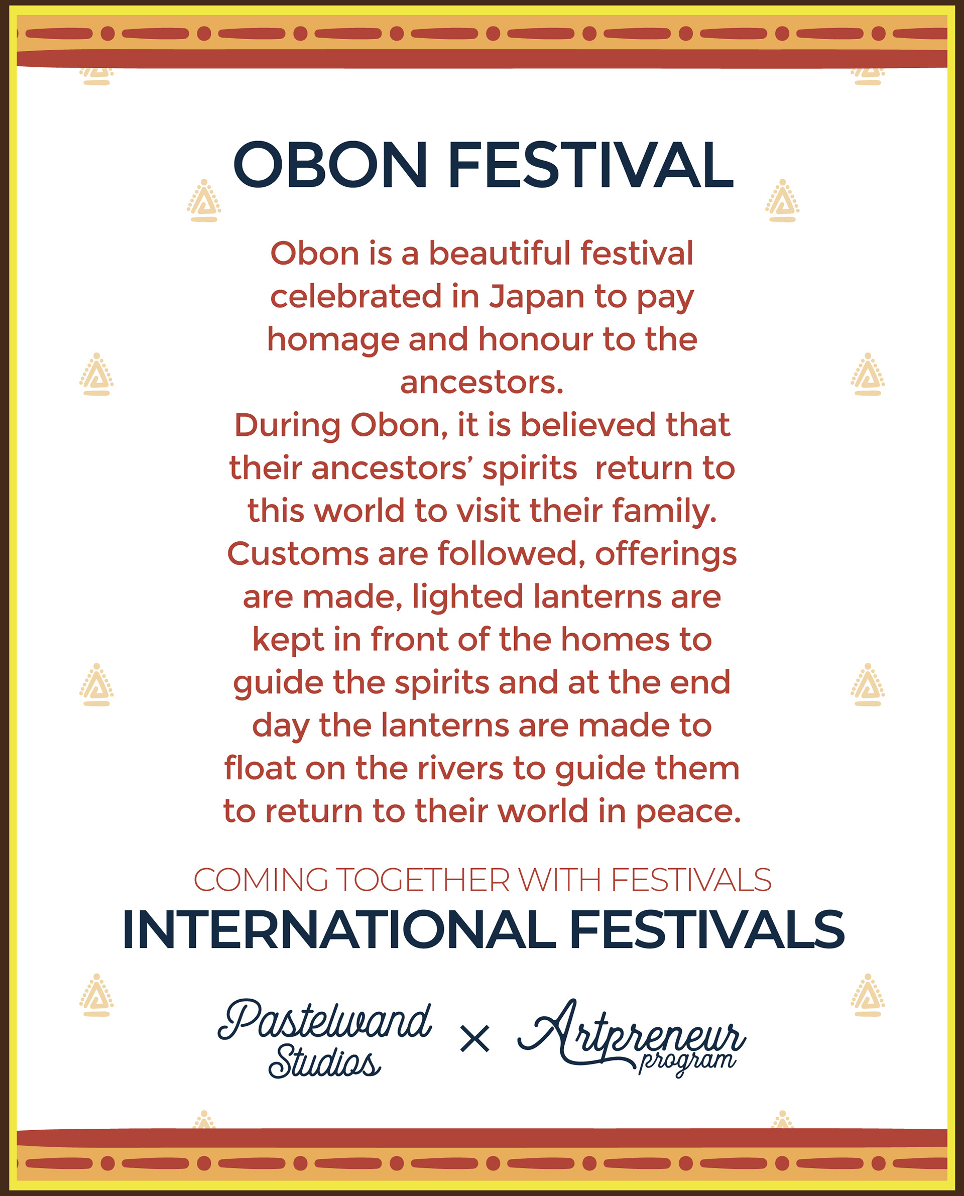Obon is a beautiful festival celebrated in Japan to pay homage and honour to the ancestors.During Obon, it is believed that their ancestors spirit will return to this world to visit their family. A custom is followed, lighted lanterns a kept in front of the homes to guide the spirits and at the end day the lanterns are made to float on the rivers to guide them to return to their world in peace.
