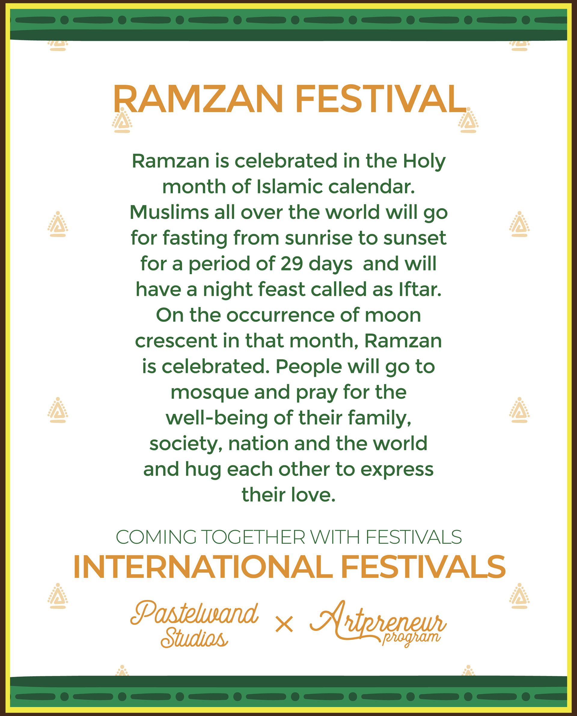 Ramzan is celebrated on the Holy month of Islamic calendar. Muslims all over the world will go for fasting from sunrise to sunset for a period of 29 days and will have a night feast called as Iftar. On the occurrence of moon crescent in that month Ramzan is celebrated, people will go to mosque and pray for the well-being their family, society, nation and the world and hug each other to express their love.