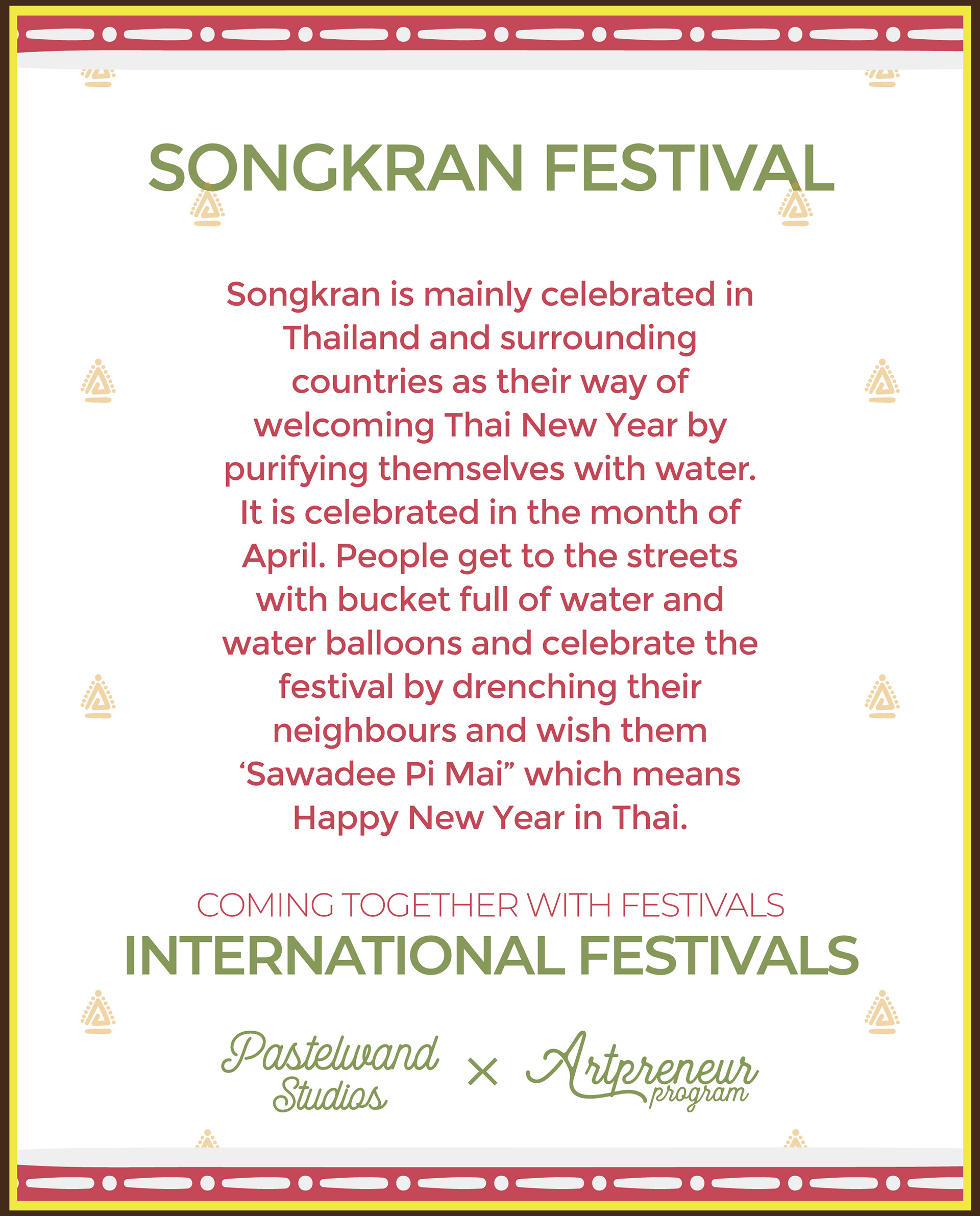 Songkran was mainly celebrated in Thailand and surrounding countries as their way of welcoming Thai New Year by purifying themselves with water. It is celebrated at the month of April. People get to the streets with bucket full of water and water balloons and celebrate the festival by drenching their neighbours and wish them ‘Sawadee Pi Mai” which means Happy New Year in Thai.
