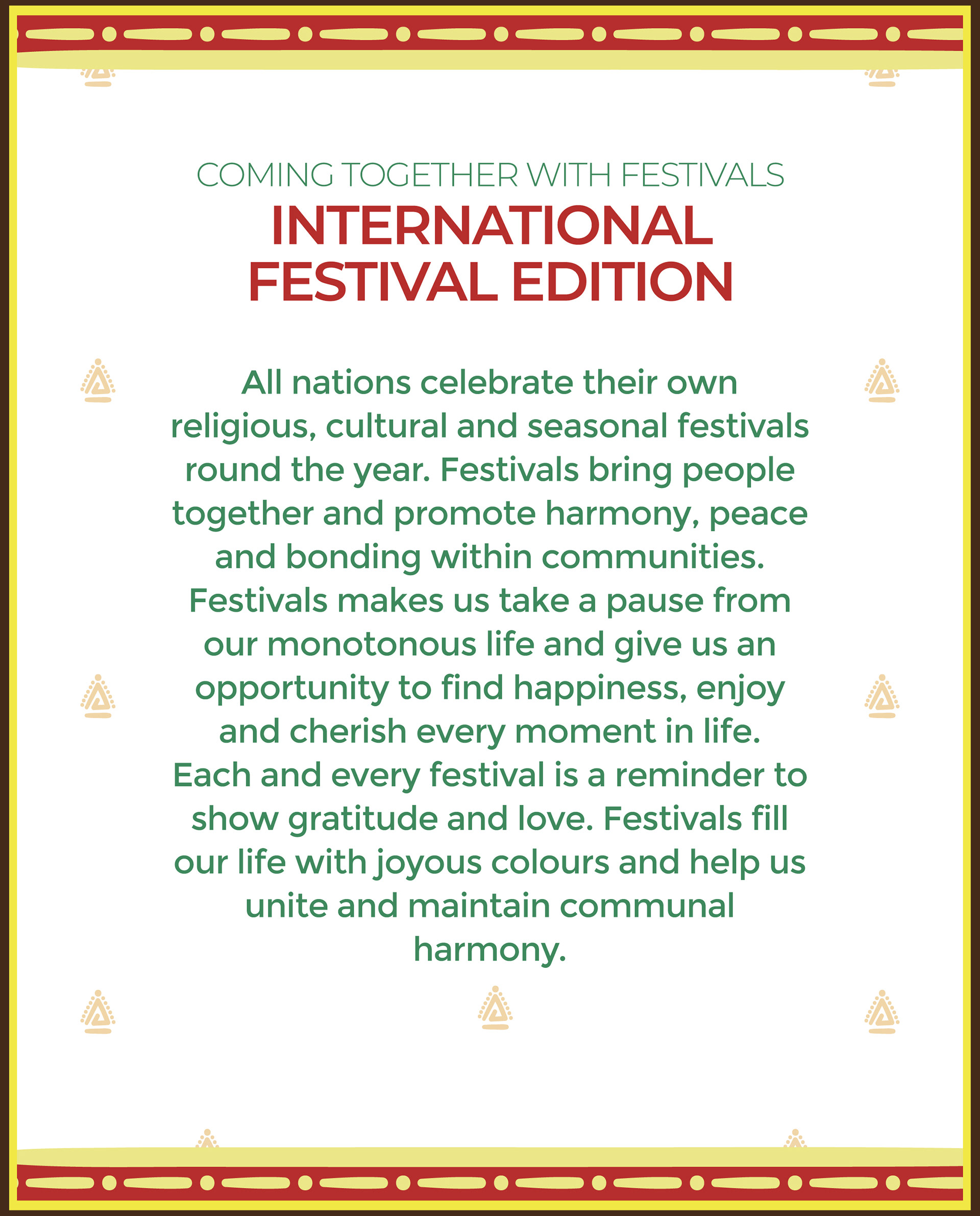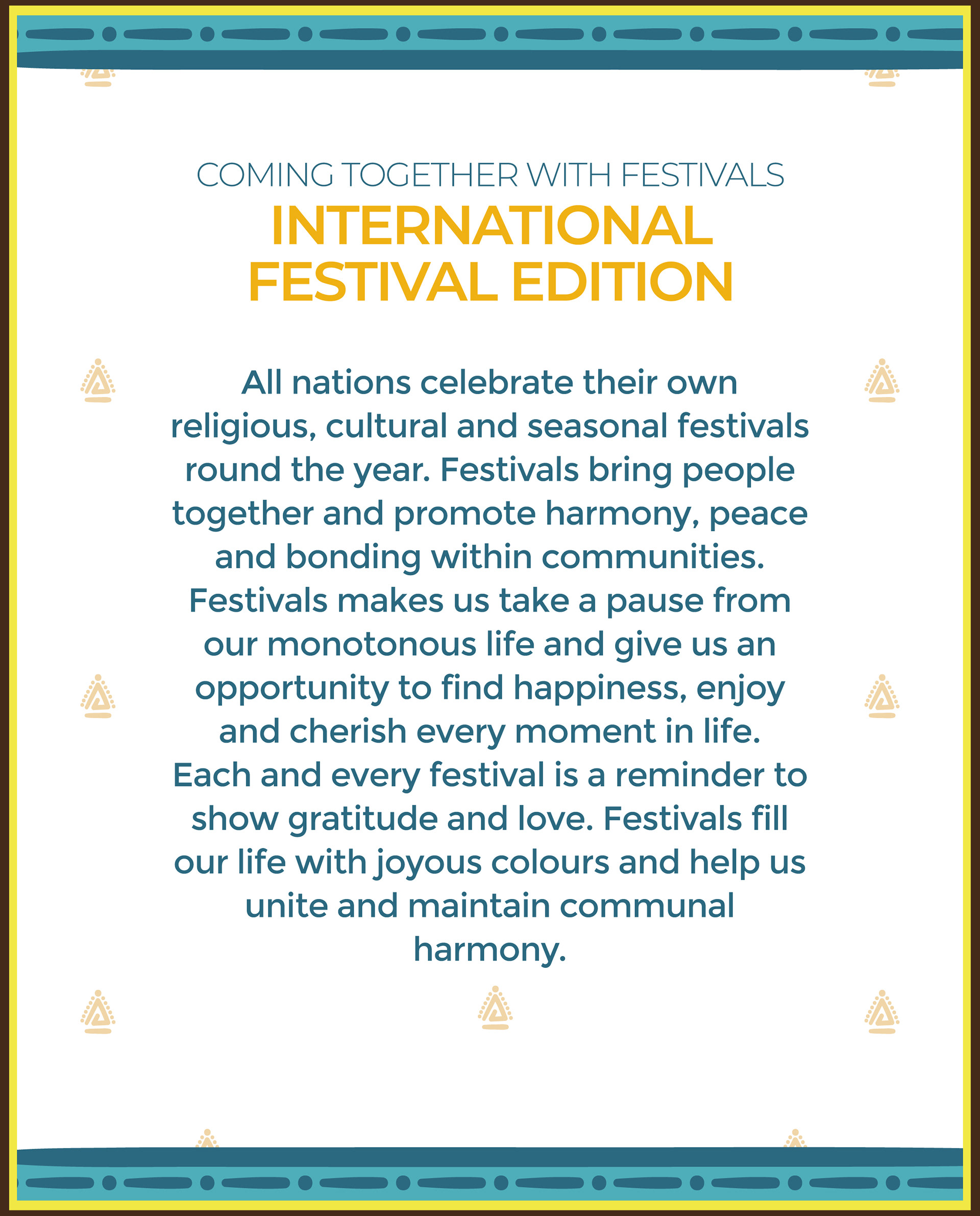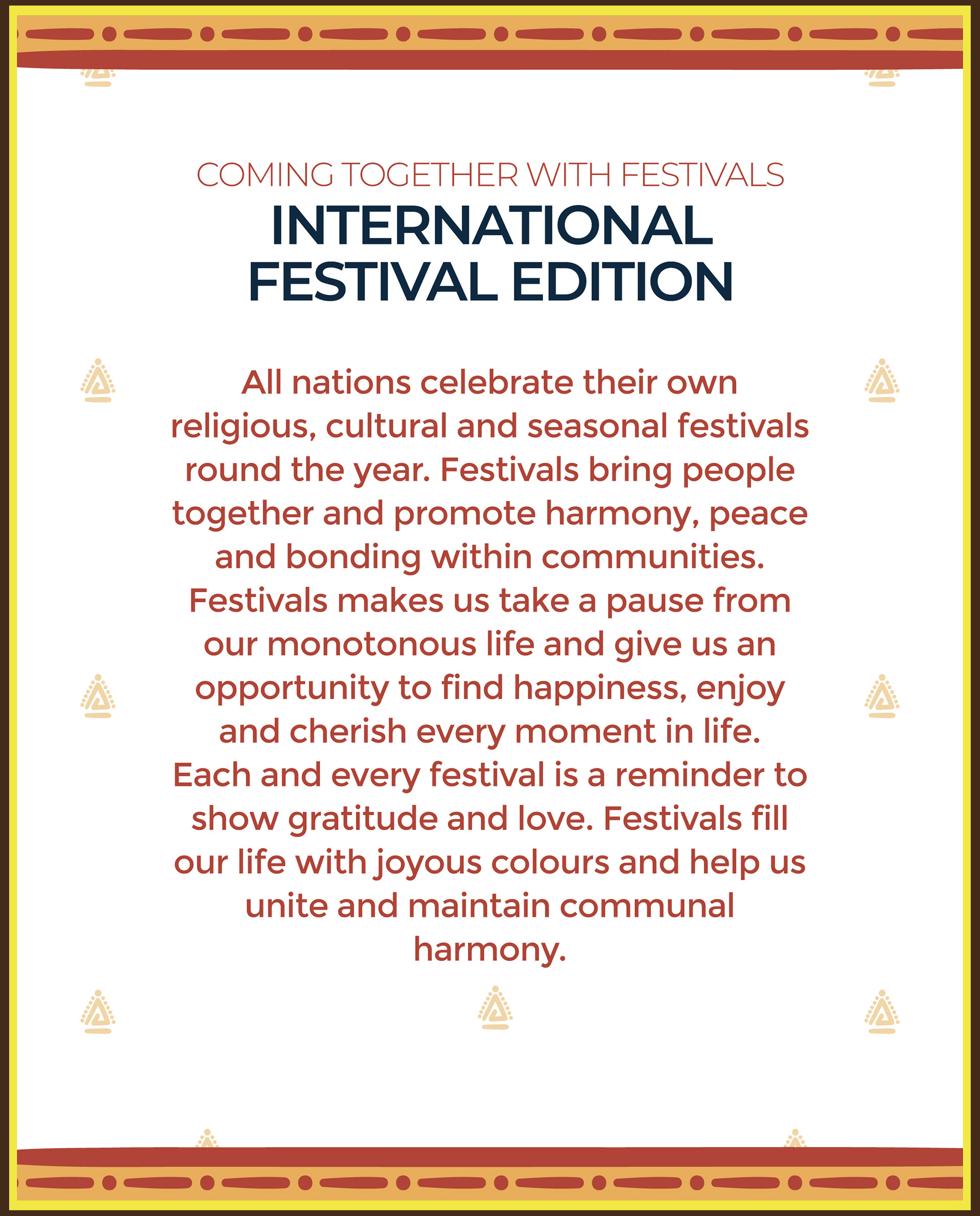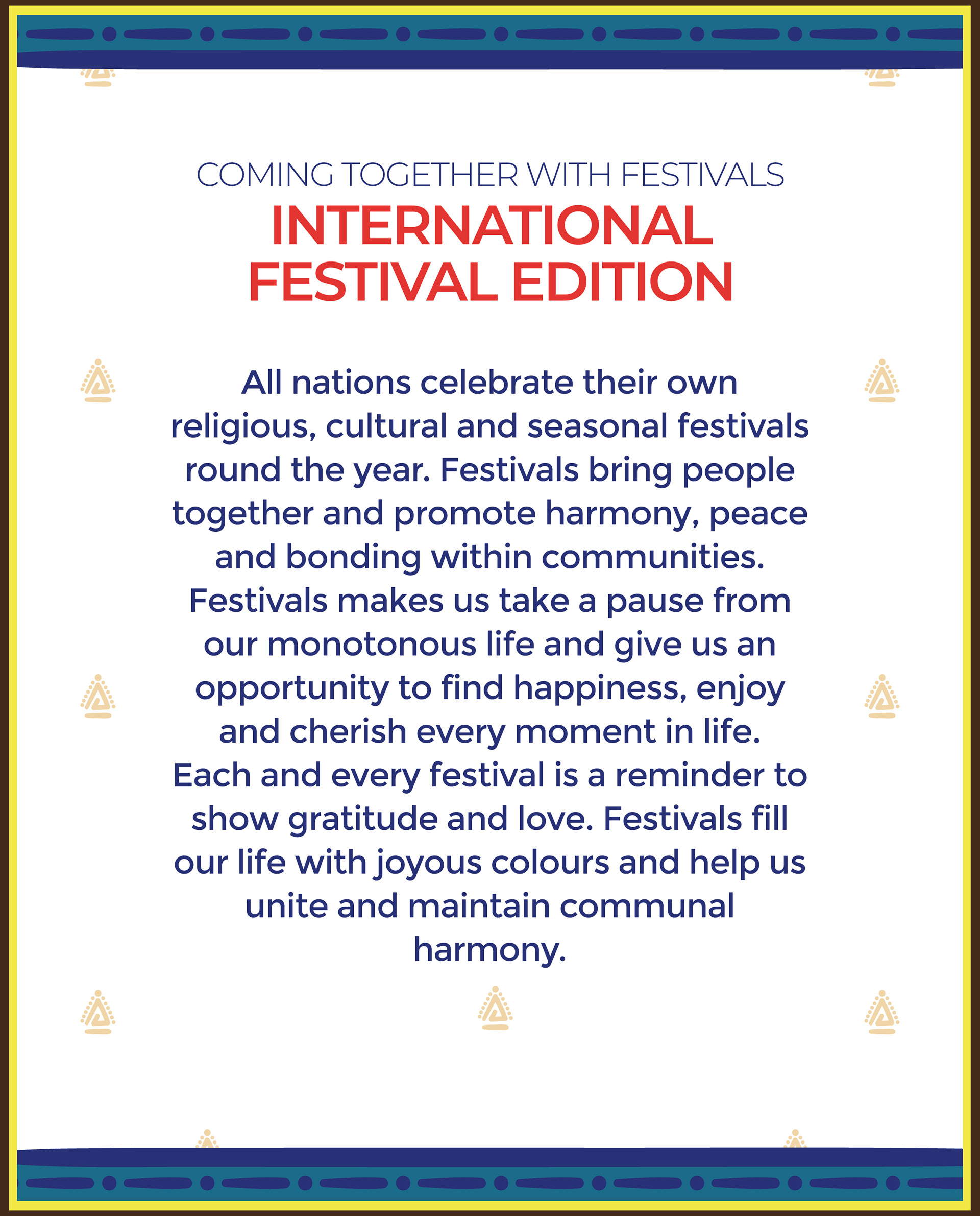 All nations celebrate their own religious, cultural and seasonal festivals round the year. Festivals bring people together and promote harmony, peace and bonding within communities.