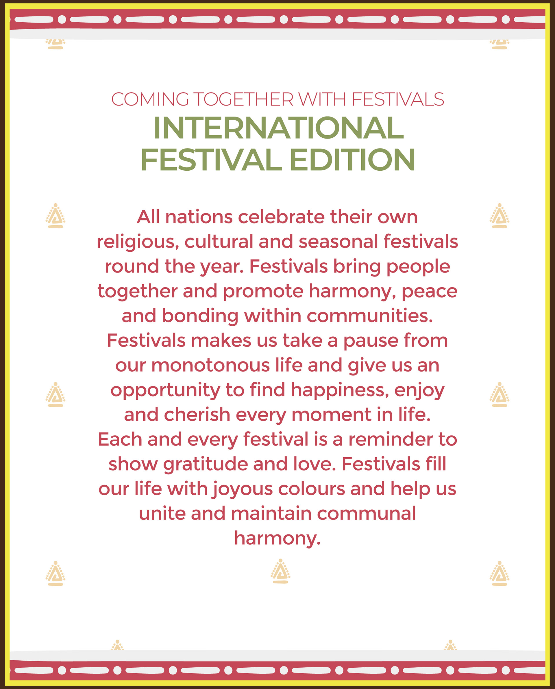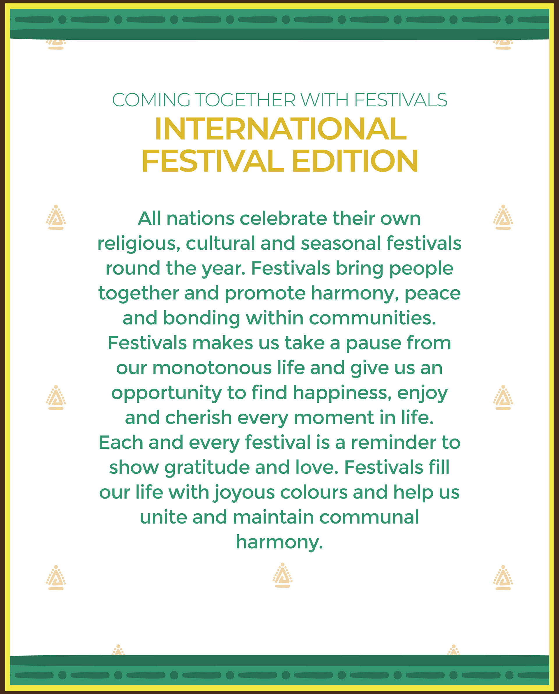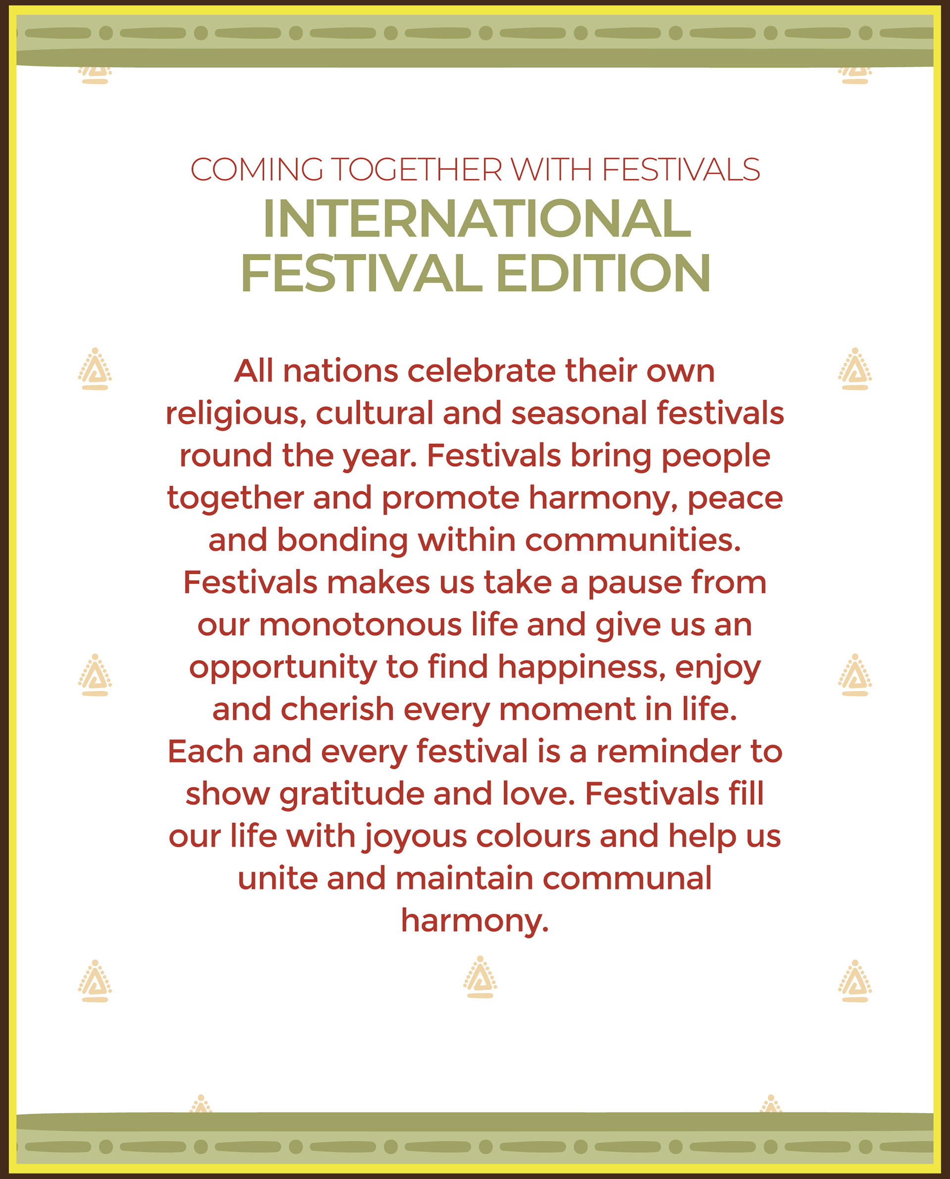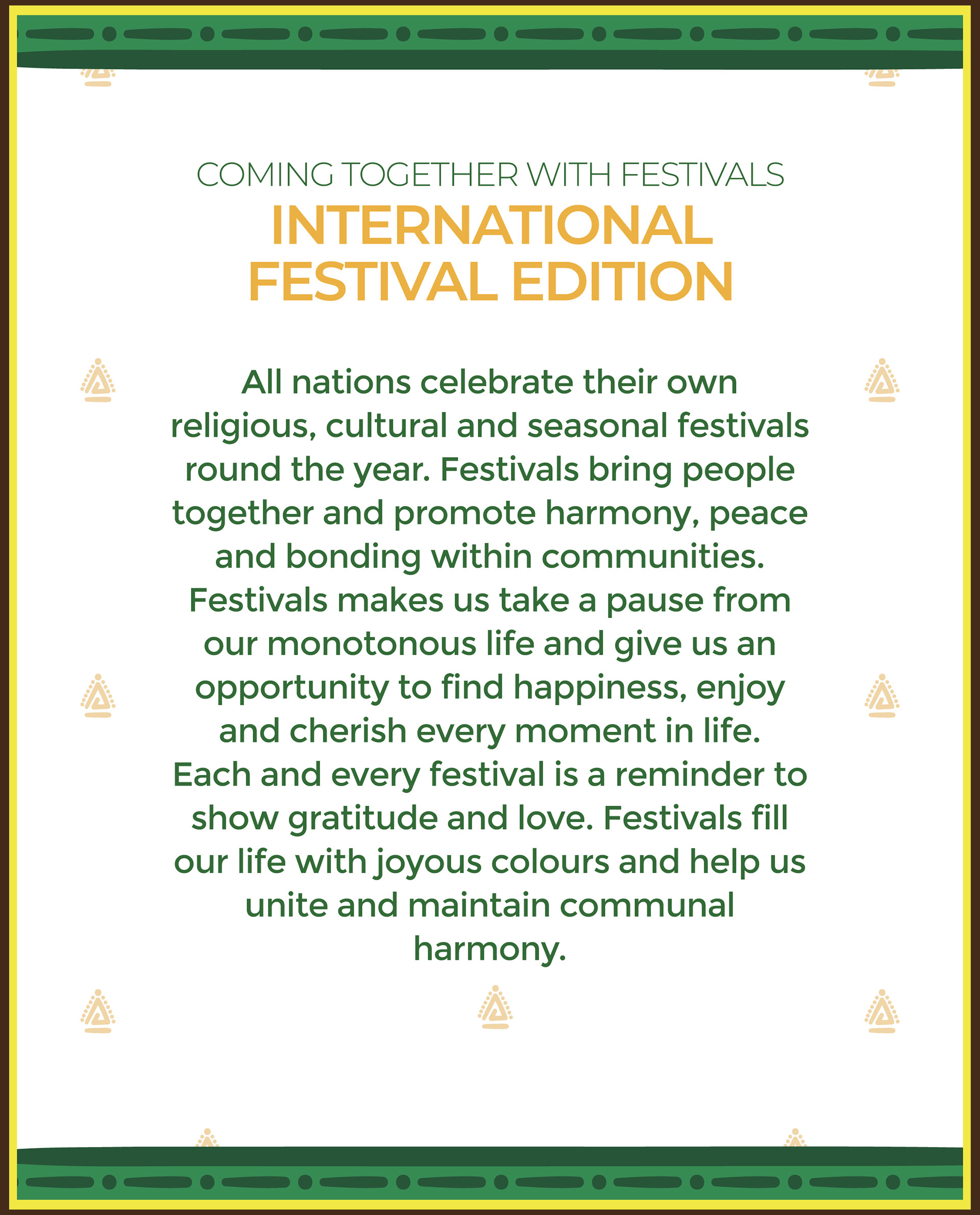 All nations celebrate their own religious, cultural and seasonal festivals round the year. Festivals bring people together and promote harmony, peace and bonding within communities.
