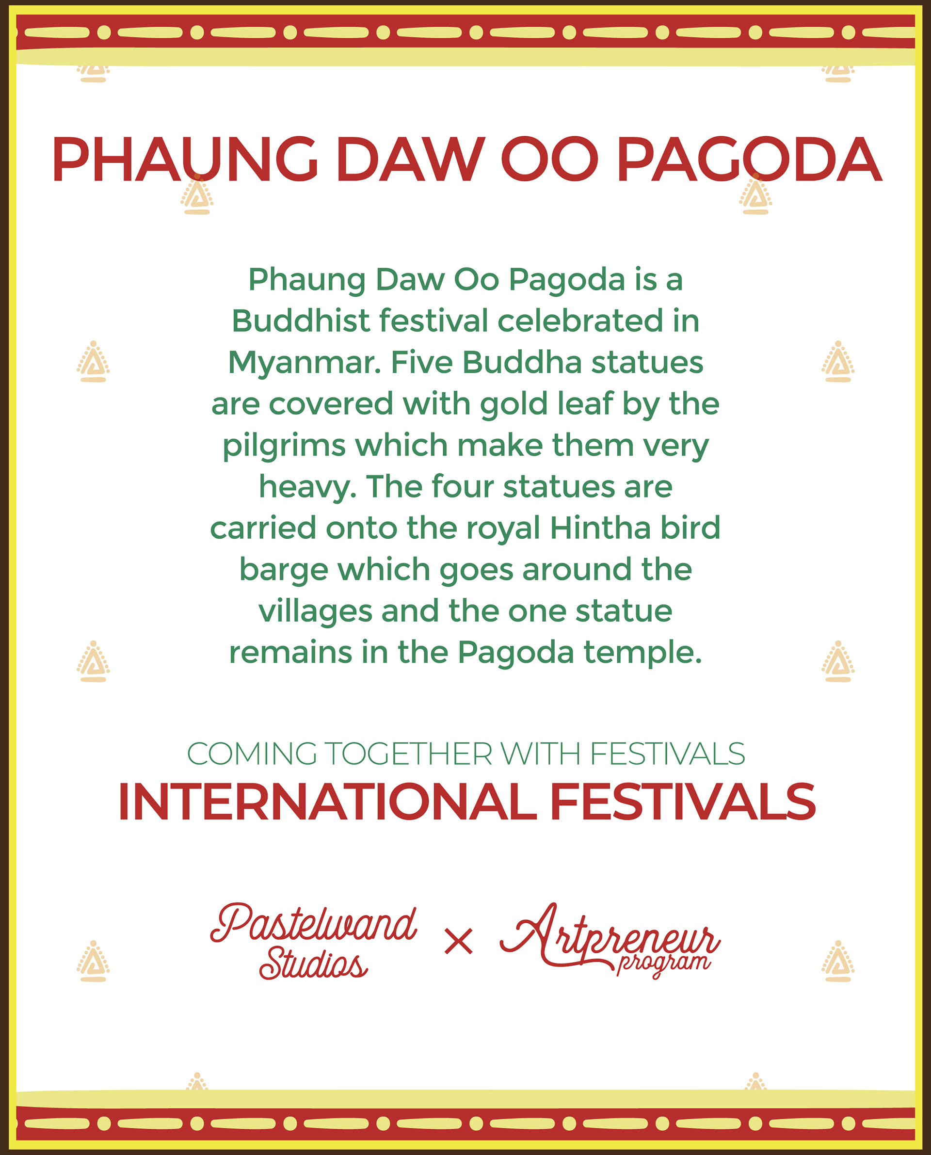 Phaung Daw Oo Pagoda is a Buddhist festival celebrated in Myanmar. Five Buddha statues are covered with gold leaf by the pilgrims which make the very heavy and four statues are carried onto the royal Hintha bird barge which goes around the villages and the one statues remains at the Pagoda temple.