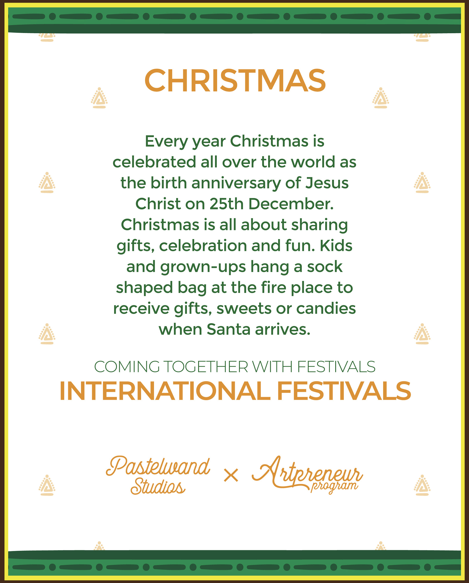 Every year Christmas is celebrated all over the world as the birth anniversary of Jesus Christ on 25th December. Christmas is all about sharing gifts, celebration and fun.Kids and grown-ups hang a sock shaped bag at the fire place to receive gifts, sweets or candies when Santa arrives.