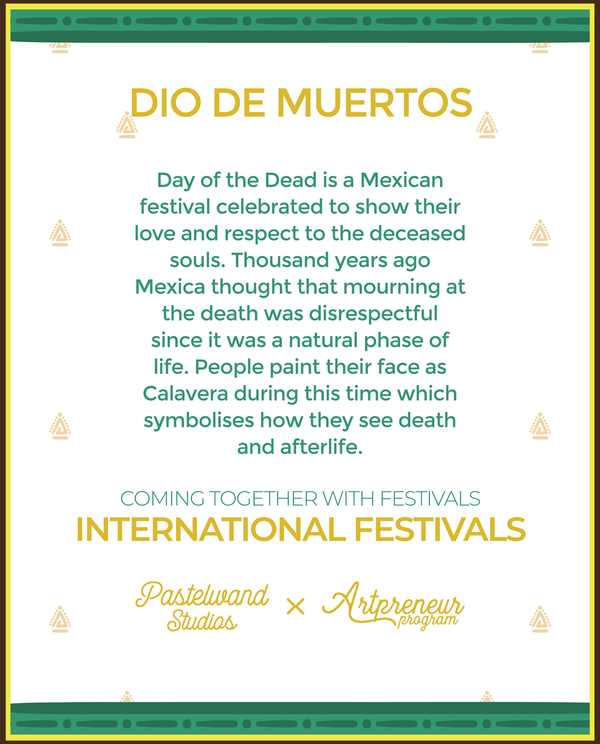 Day of the Dead is a Mexican festival celebrated to show their love and respect to the deceased souls. Thousand years ago Mexica thought that mourning at the death was disrespectful since it was a natural phase of life. People paint their face as Calavera during this time which symbolises how they see death and afterlife.
