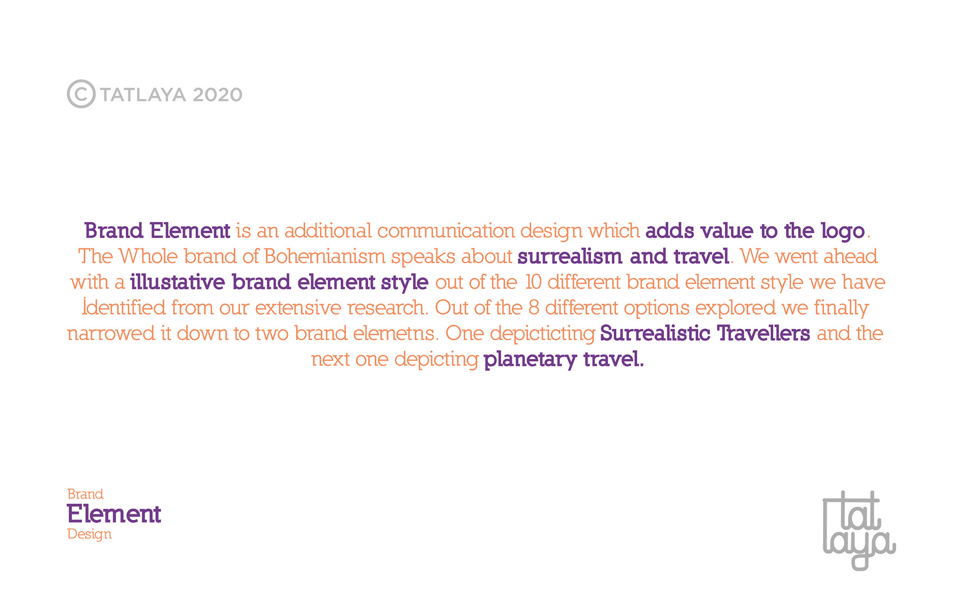 Brand Element is an additional communication design which adds value to the logo.The Whole brand of Bohemianism speaks about surrealism and travel. We went ahead with a illustrative brand element style out of the 10 different brand element style we have Identified from our extensive research. Out of the 8 different options explored we finally narrowed it down to two brand elements. One depicting Surrealistic Travelers and the next one depicting planetary travel.