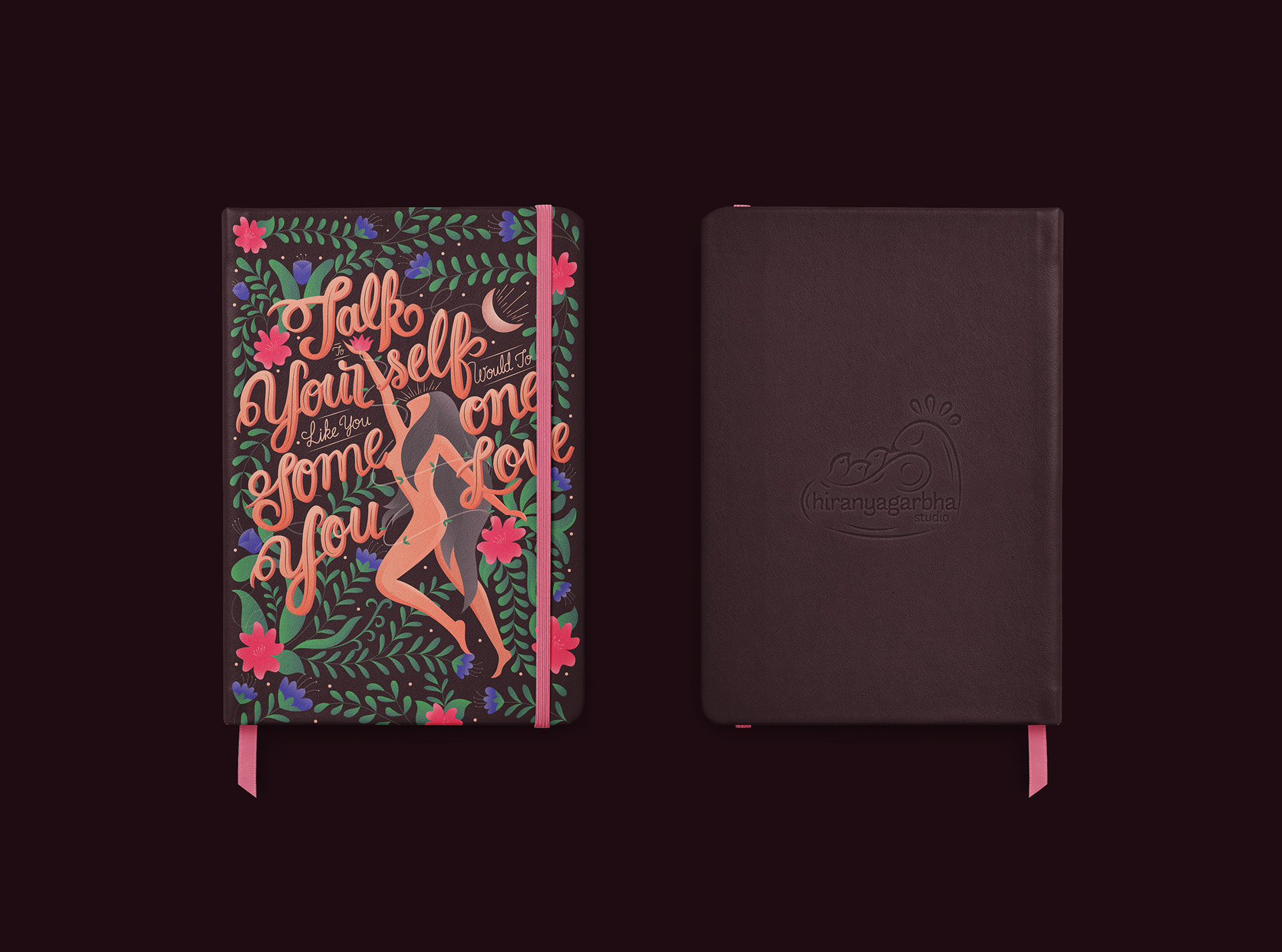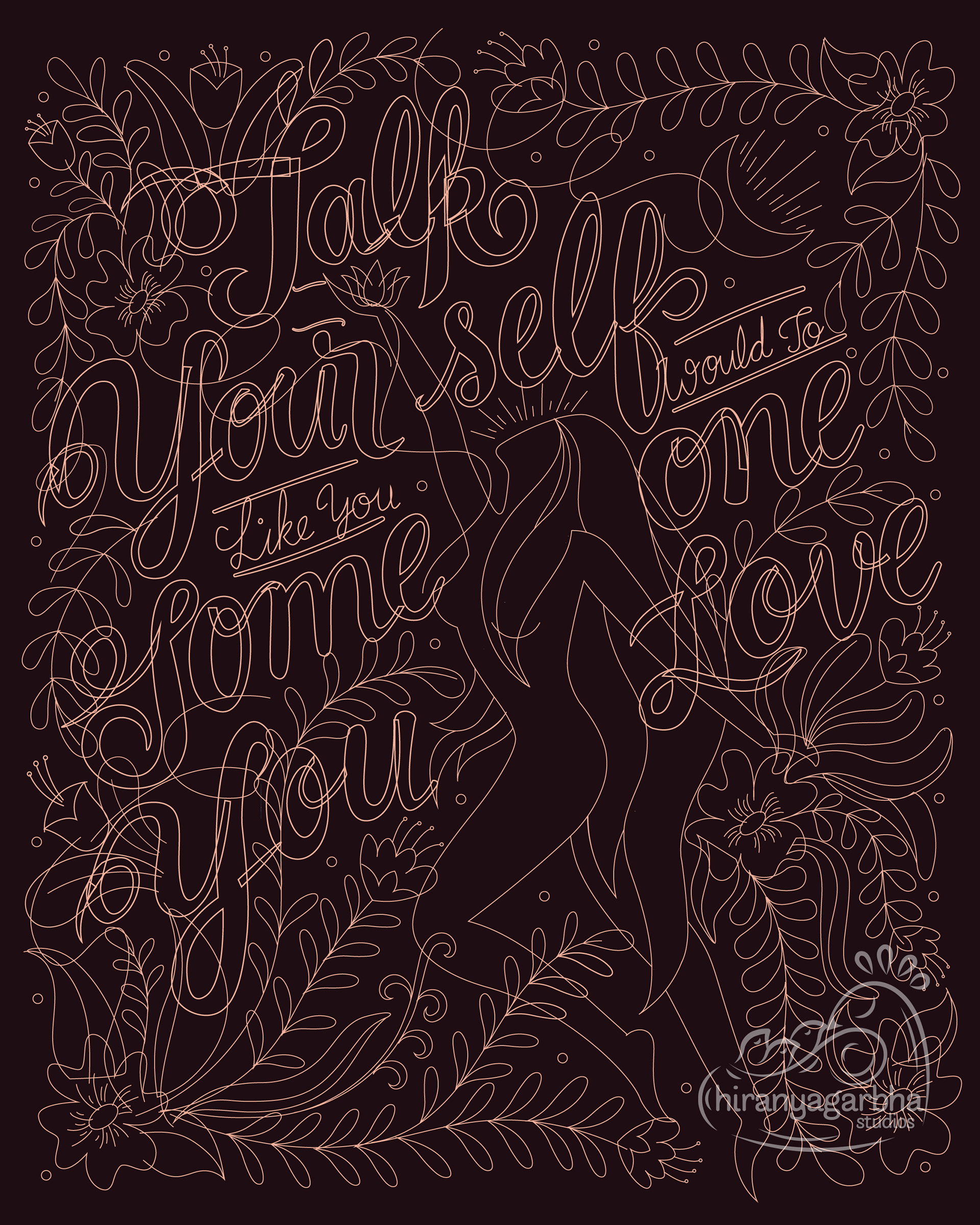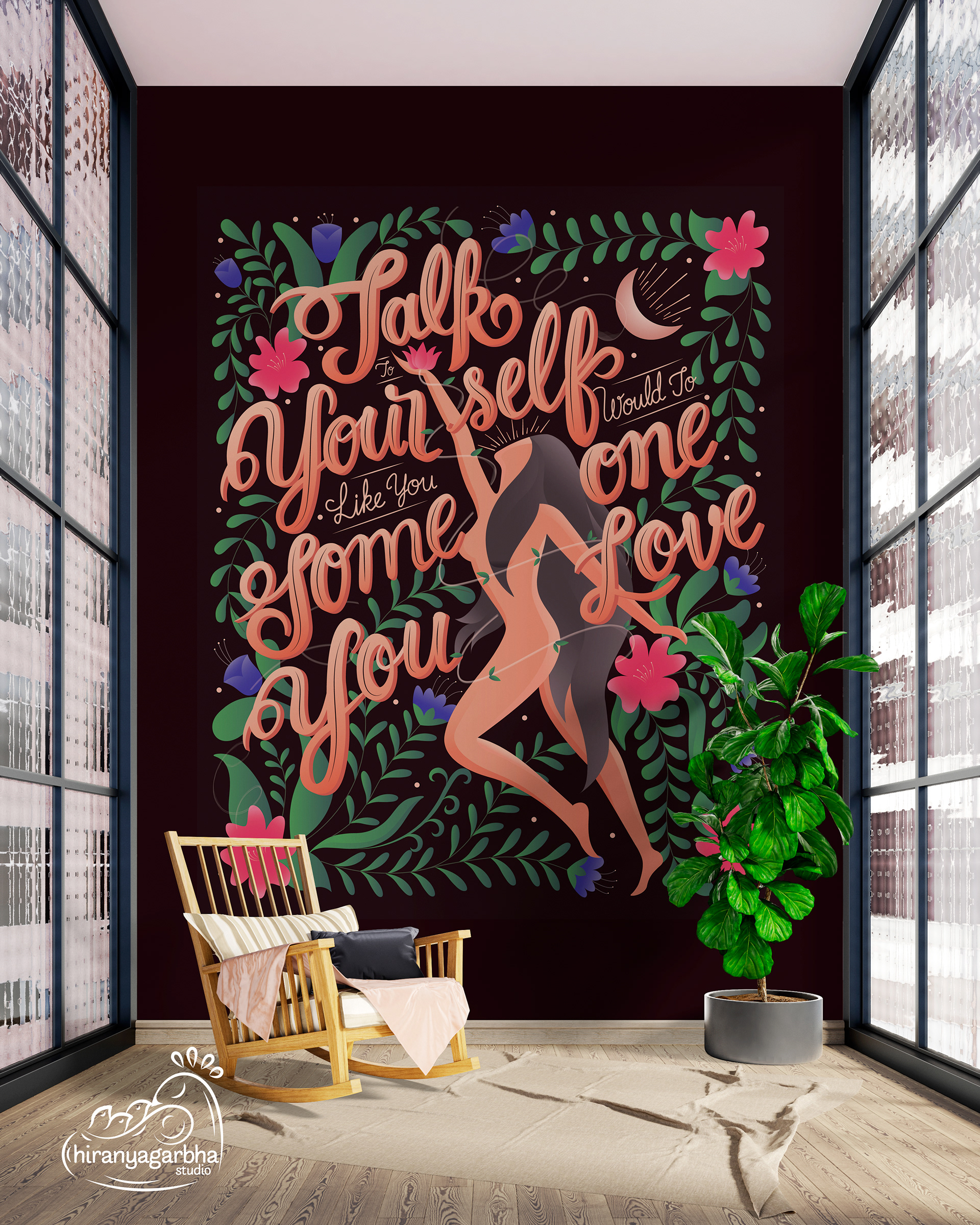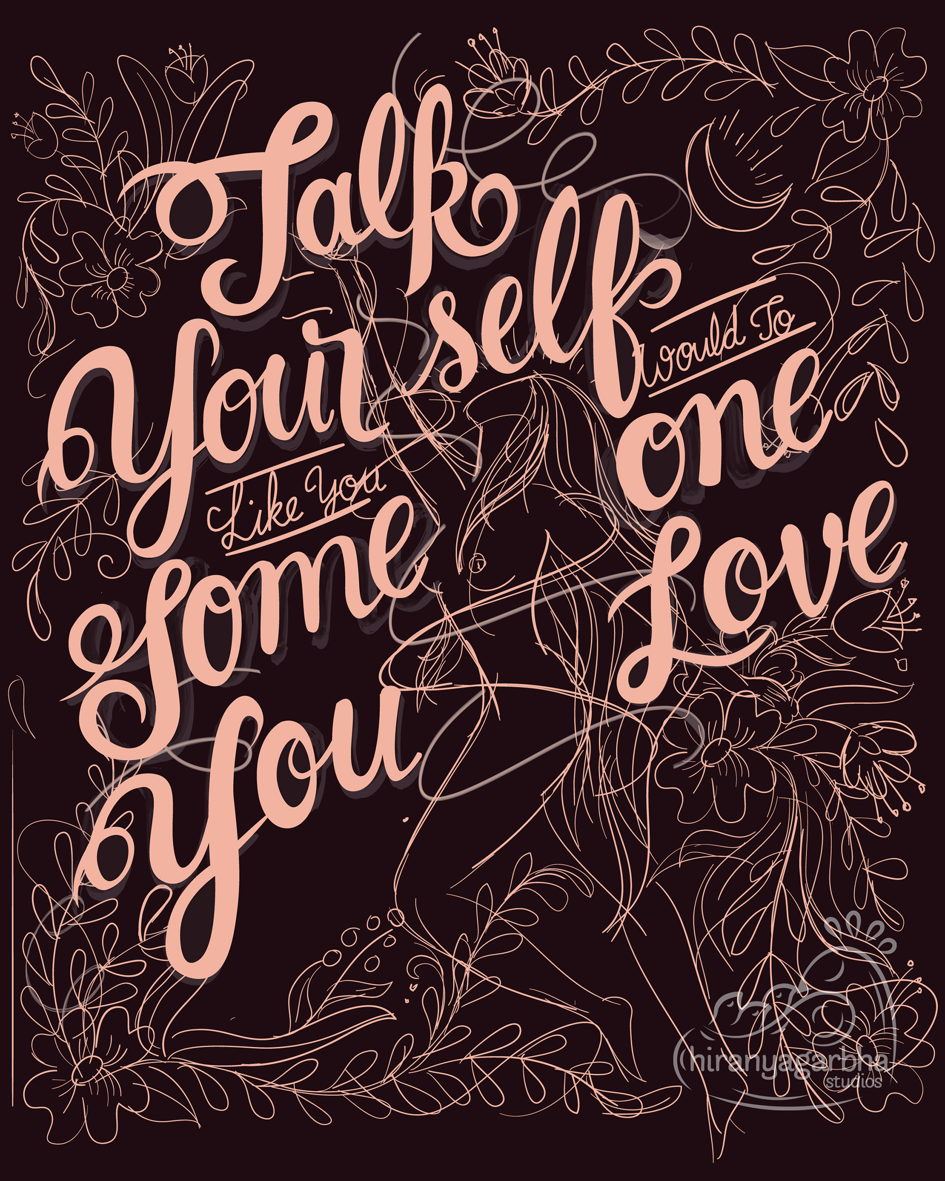 The quote “Talk to yourself like you would to someone you love” by Brené Brown speaks of self love. How often have you found yourself to be that person who adores everything and everyone around you & more importantly, you? Your energy and sparkle from within you are frequently exhilarated by the experience of falling in love with yourself. As soon as you experience it, your aura transforms and miracles begin to occur. It is this experience of self love with a deeper sense of happiness and fulfilment that I tried to encapsulate through the illustrative lettering in the flowing script style.