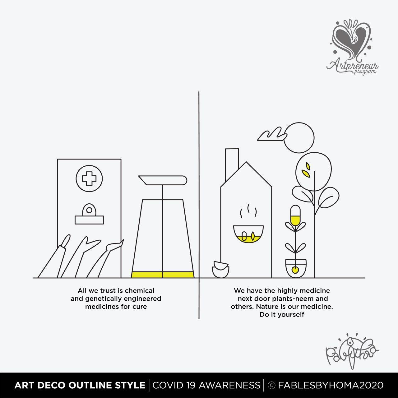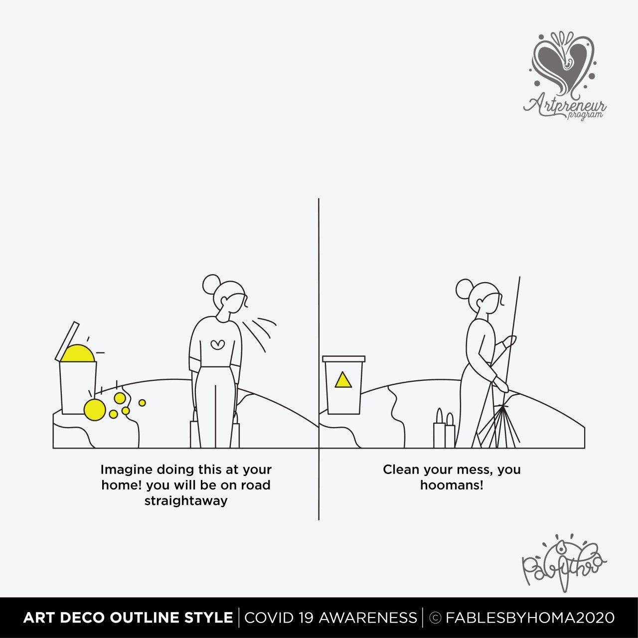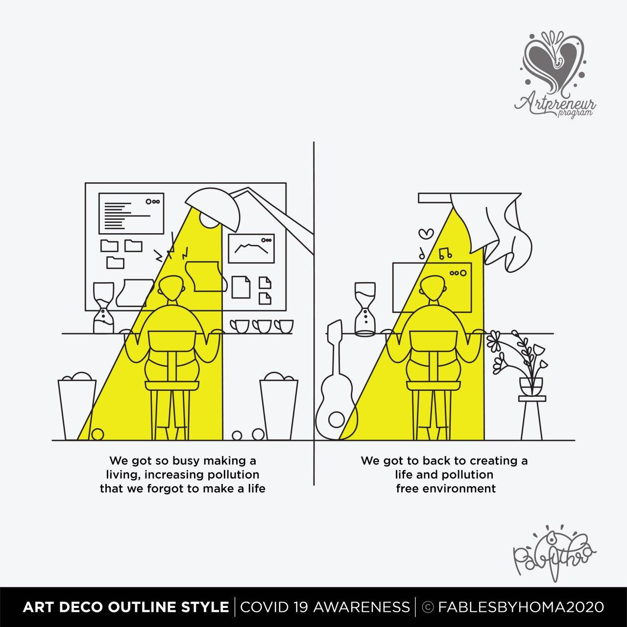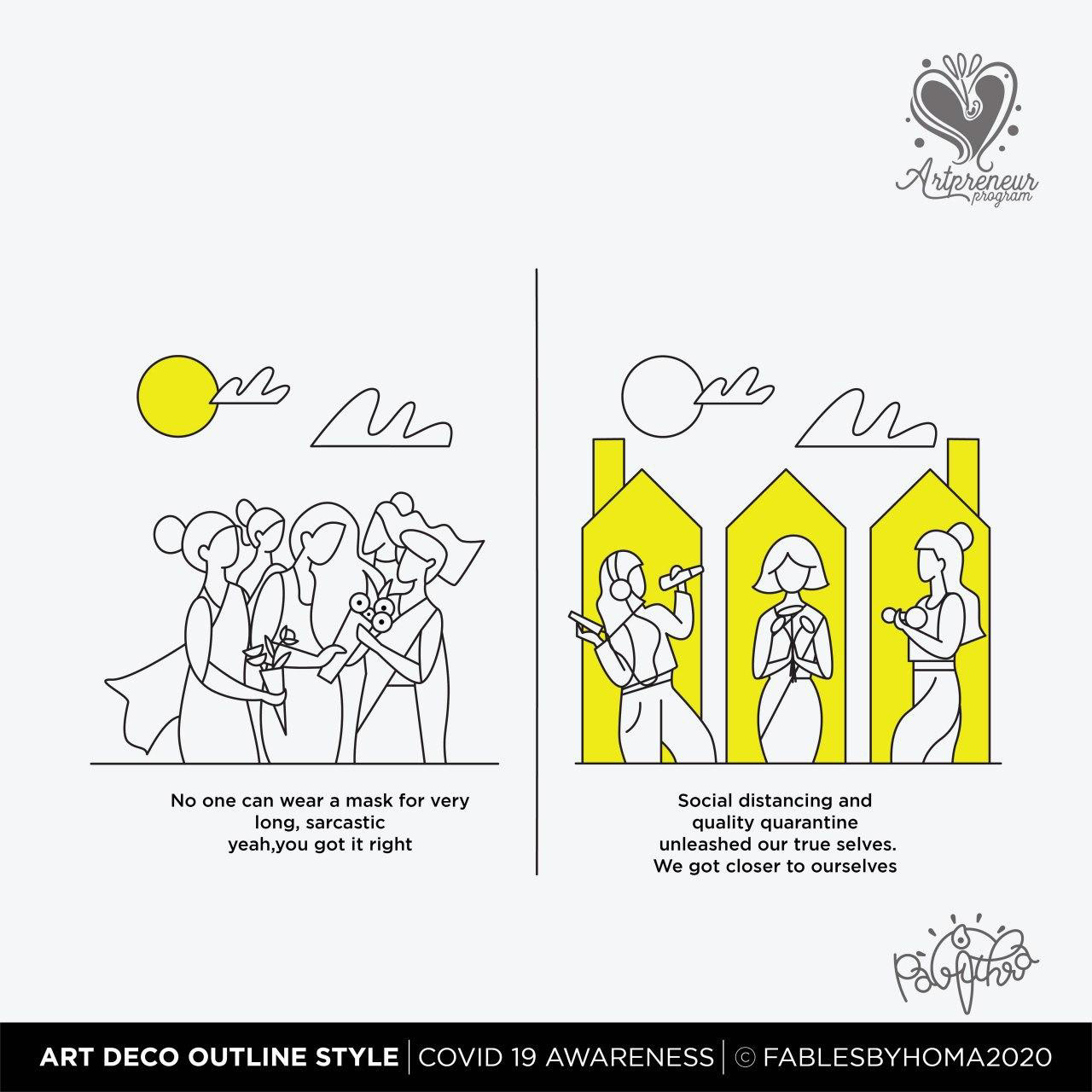 COVID 19 Awareness Illustrations in Art Deco Outline Illustration Style by Pavithra | Explore and learn new Art styles with Artpreneur Program - Interactive Live Online Program! Artpreneurs are learning and experimenting with a new style of illustrations called "Art Deco - Outline. Here is the output of just 2 hours of a hands-on session held by our educator SCD Balaji on Art deco Outline illustrations.