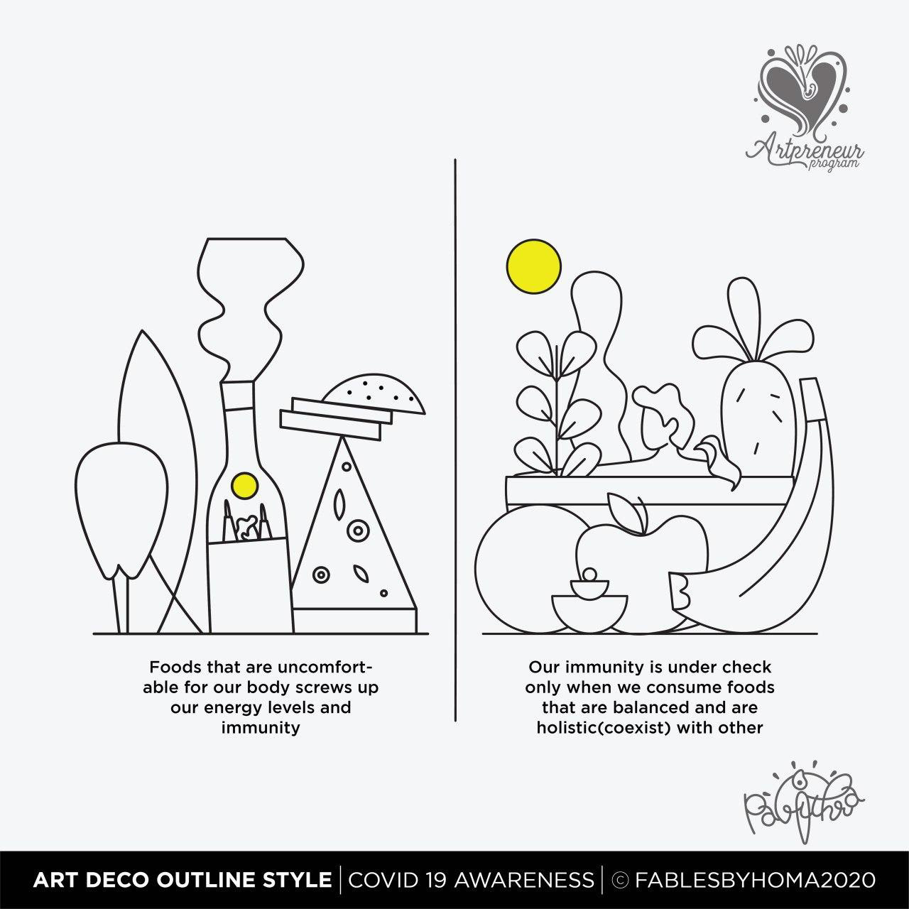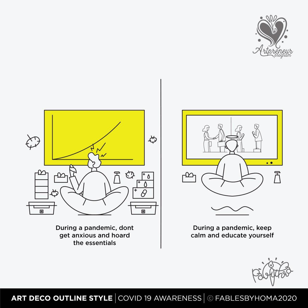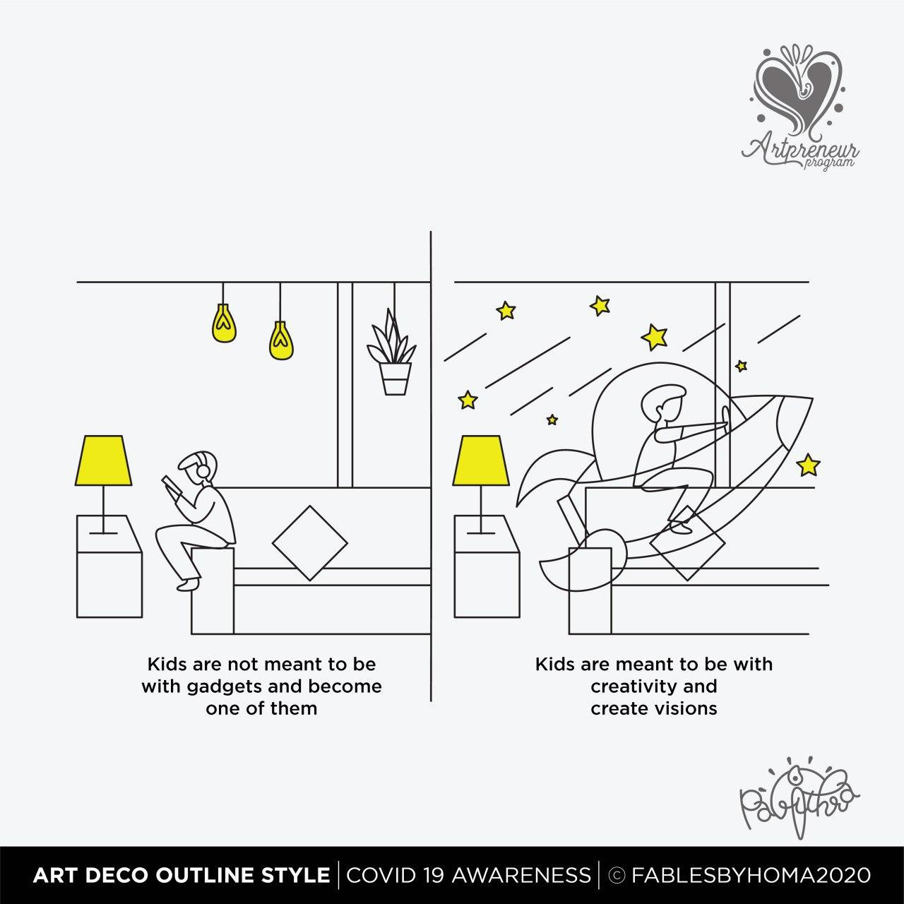 COVID 19 Awareness Illustrations in Art Deco Outline Illustration Style by Pavithra | Explore and learn new Art styles with Artpreneur Program - Interactive Live Online Program! Artpreneurs are learning and experimenting with a new style of illustrations called "Art Deco - Outline. Here is the output of just 2 hours of a hands-on session held by our educator SCD Balaji on Art deco Outline illustrations.