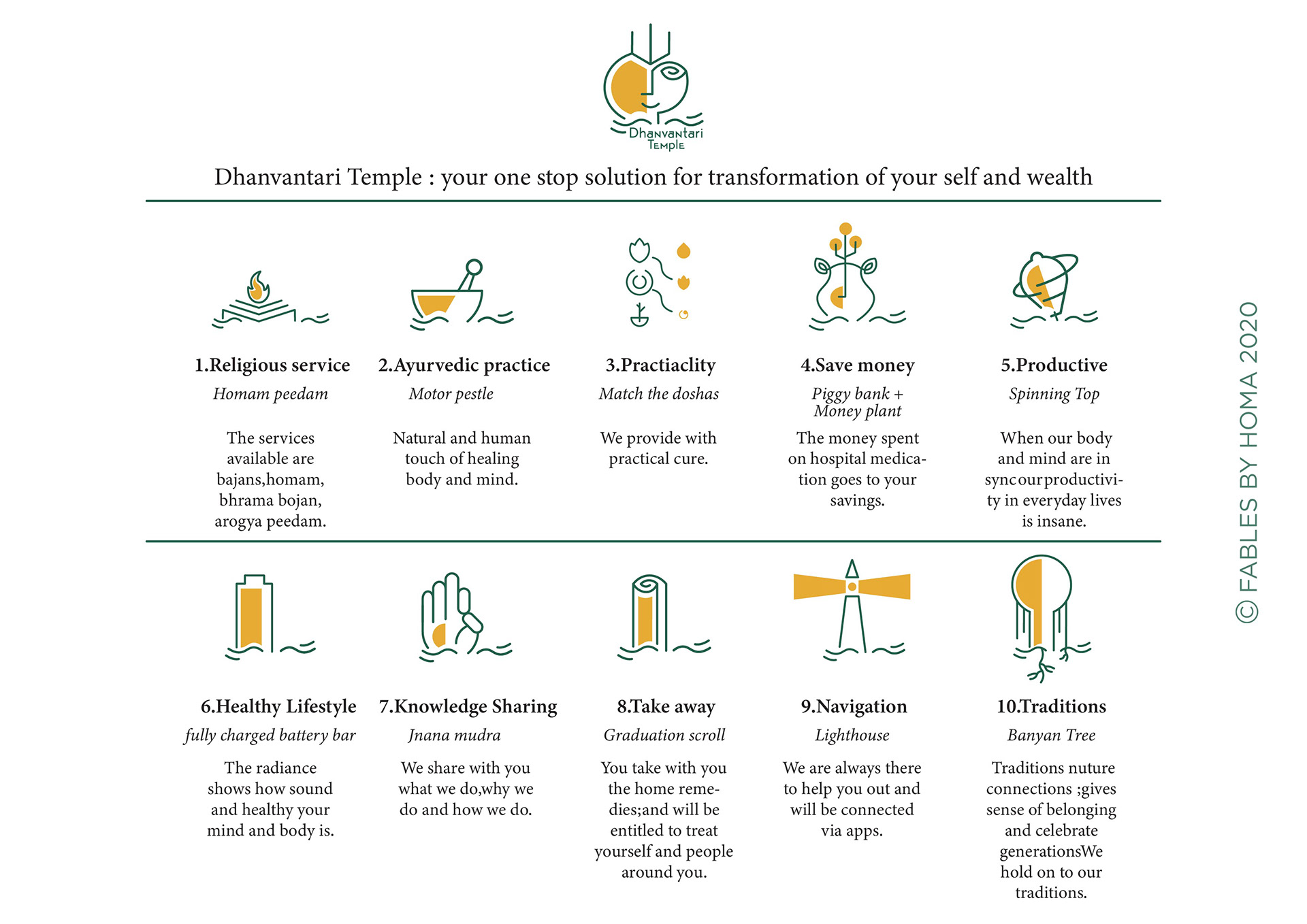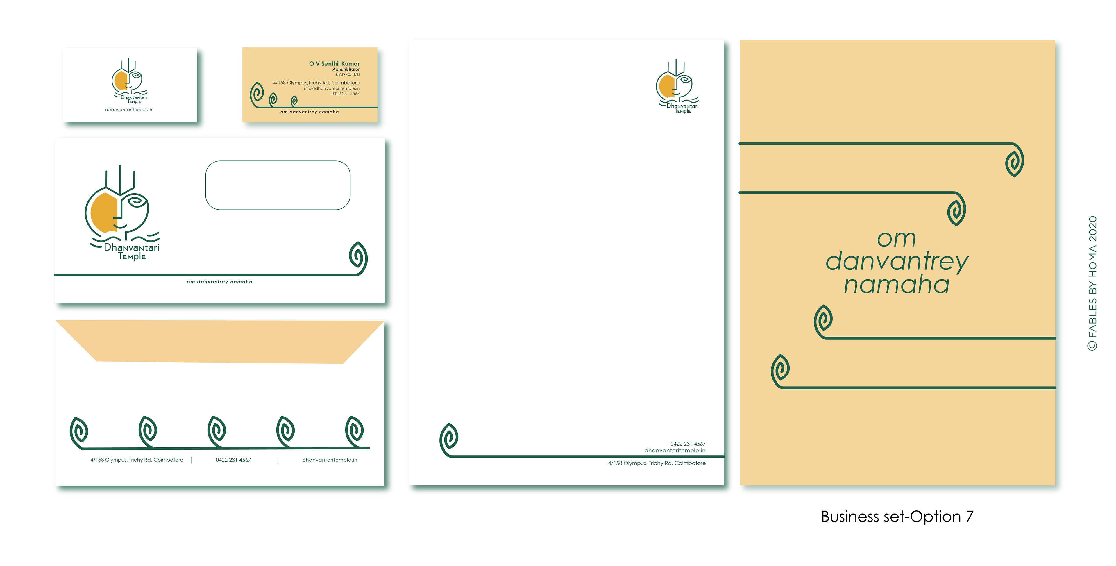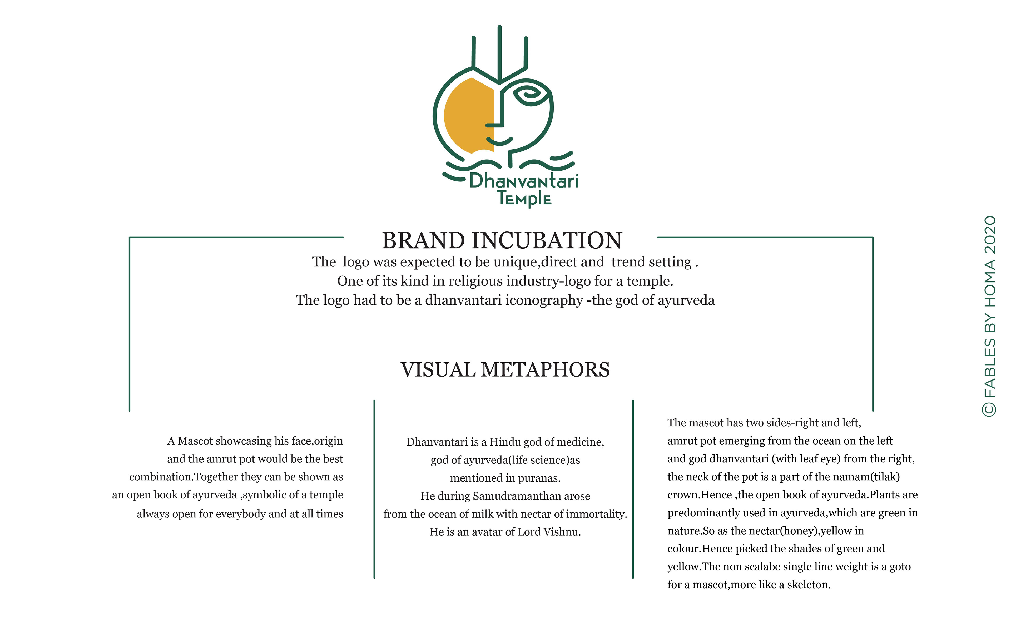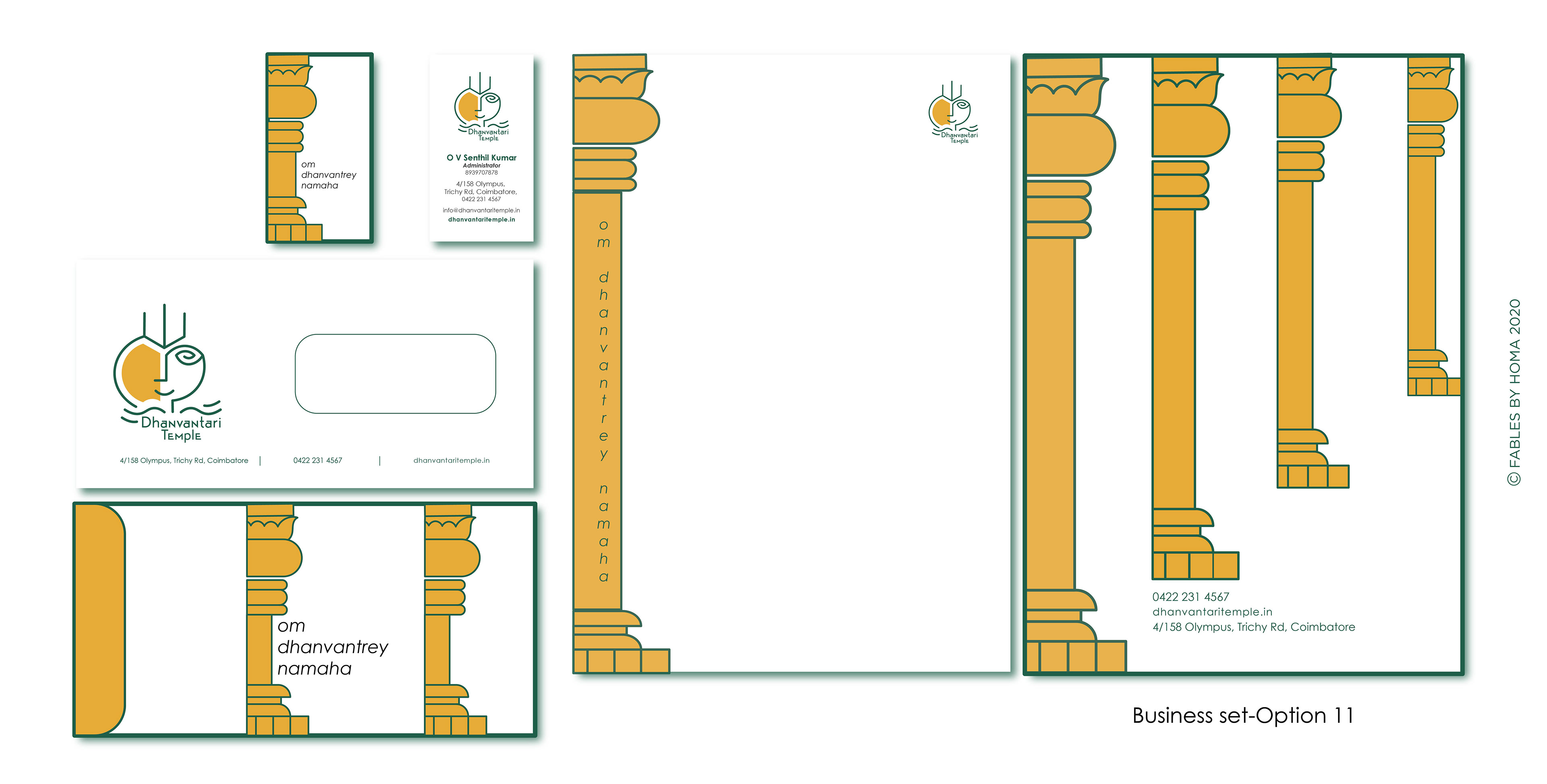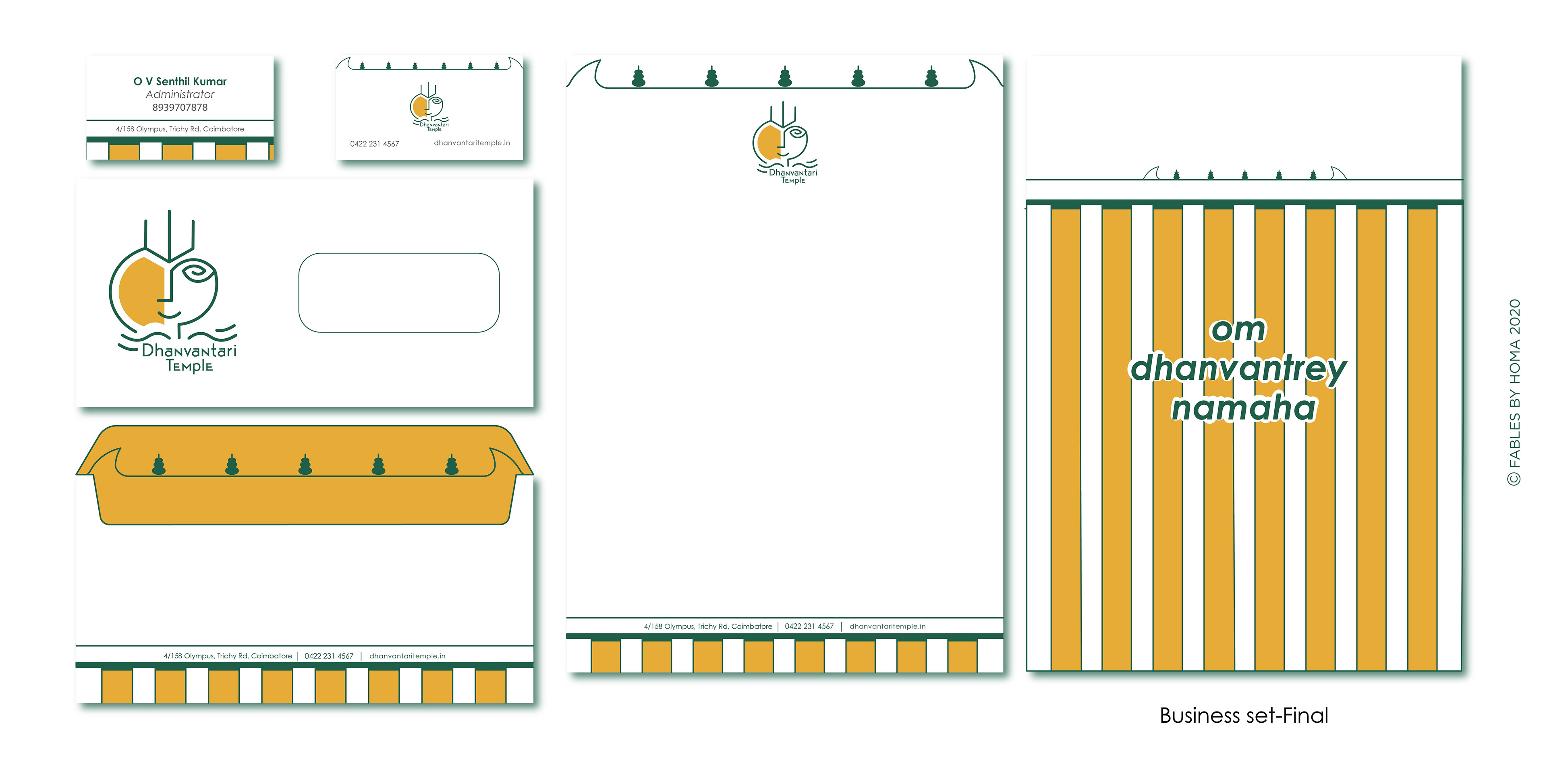 Dhanvantari Temple is all about Dhanvantari, he is a Hindu god of medicine, god of ayurveda (life science)as mentioned in puranas. He during Samudramanthan arose from the ocean of milk with nectar of immortality.He is an avatar of Lord Vishnu. We thoroughly enjoyed the process of bringing a corporate feeling in a Temple branding. Branding of Dhanvantari Temple is one of its kind involving Logo, Brand elements, Business sets, a Brand deck ( benefits offered by the Dhanvantari Temple) and Brand illustrations.
