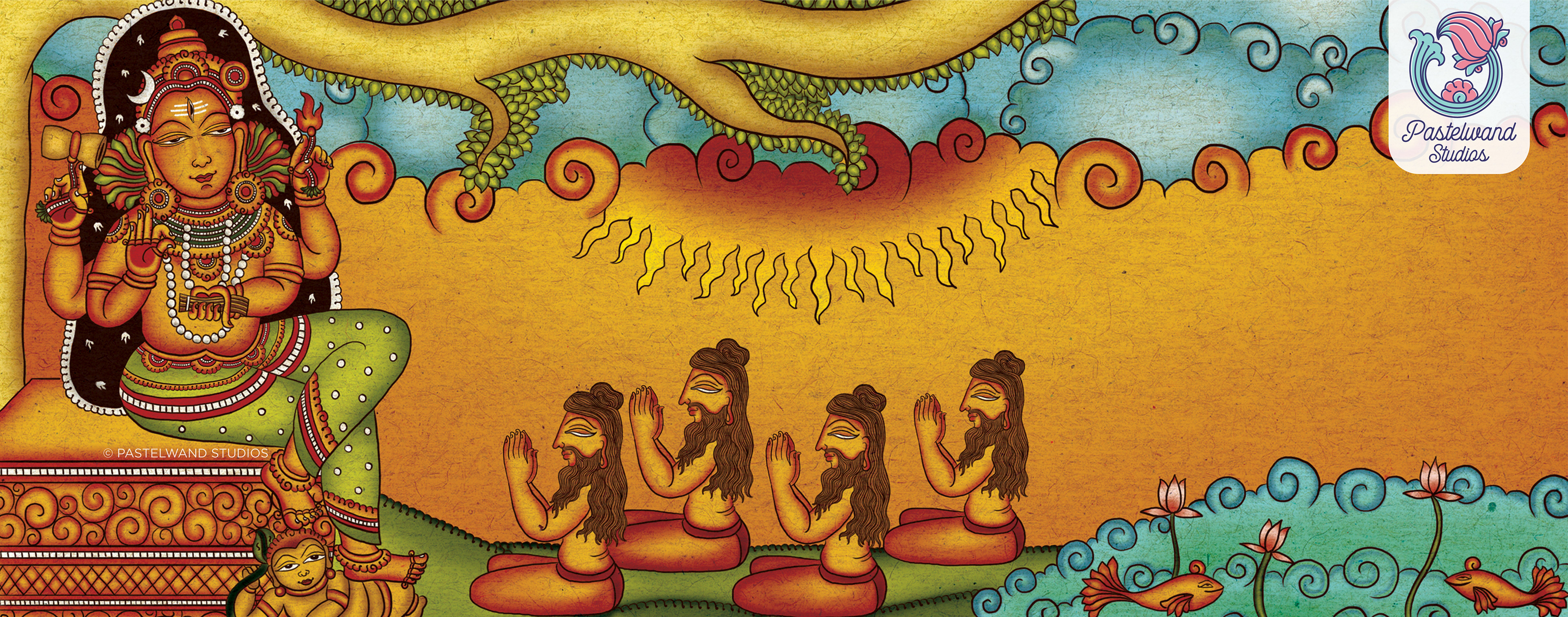 Kerala Mural, one of the traditional art forms in India. Kerala Mural paintings are found on the walls of Indian temple, it is a symbol of elegance, beauty, grace and divinity. Here is the digital painting of God Dakshinamurthy, who is known as the God of all types of knowledge visualised and created in Adobe Photoshop by Pastelwand Studios.