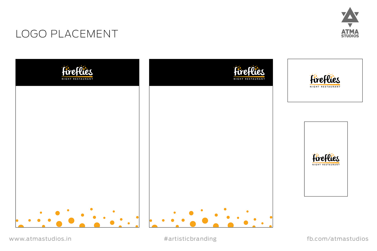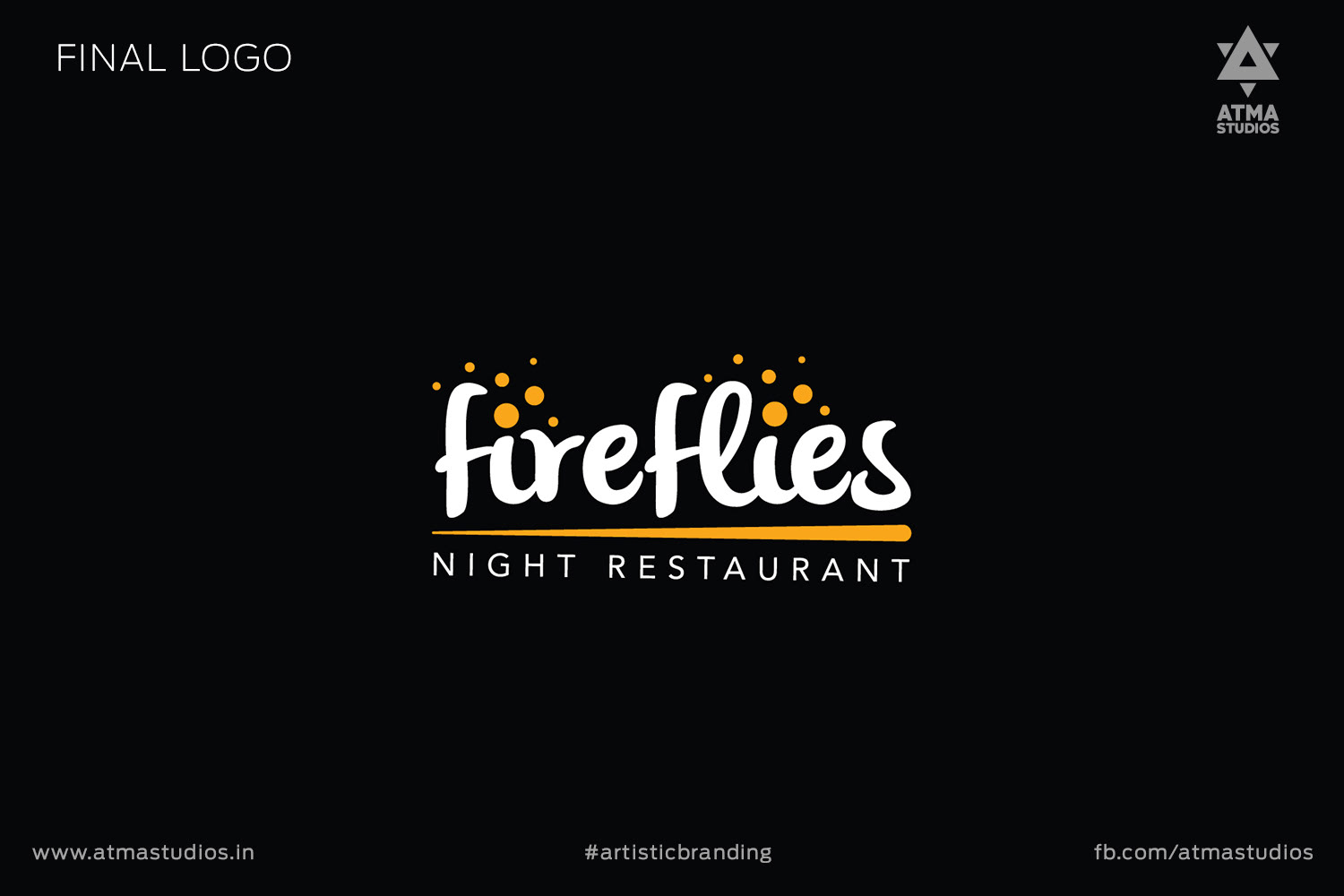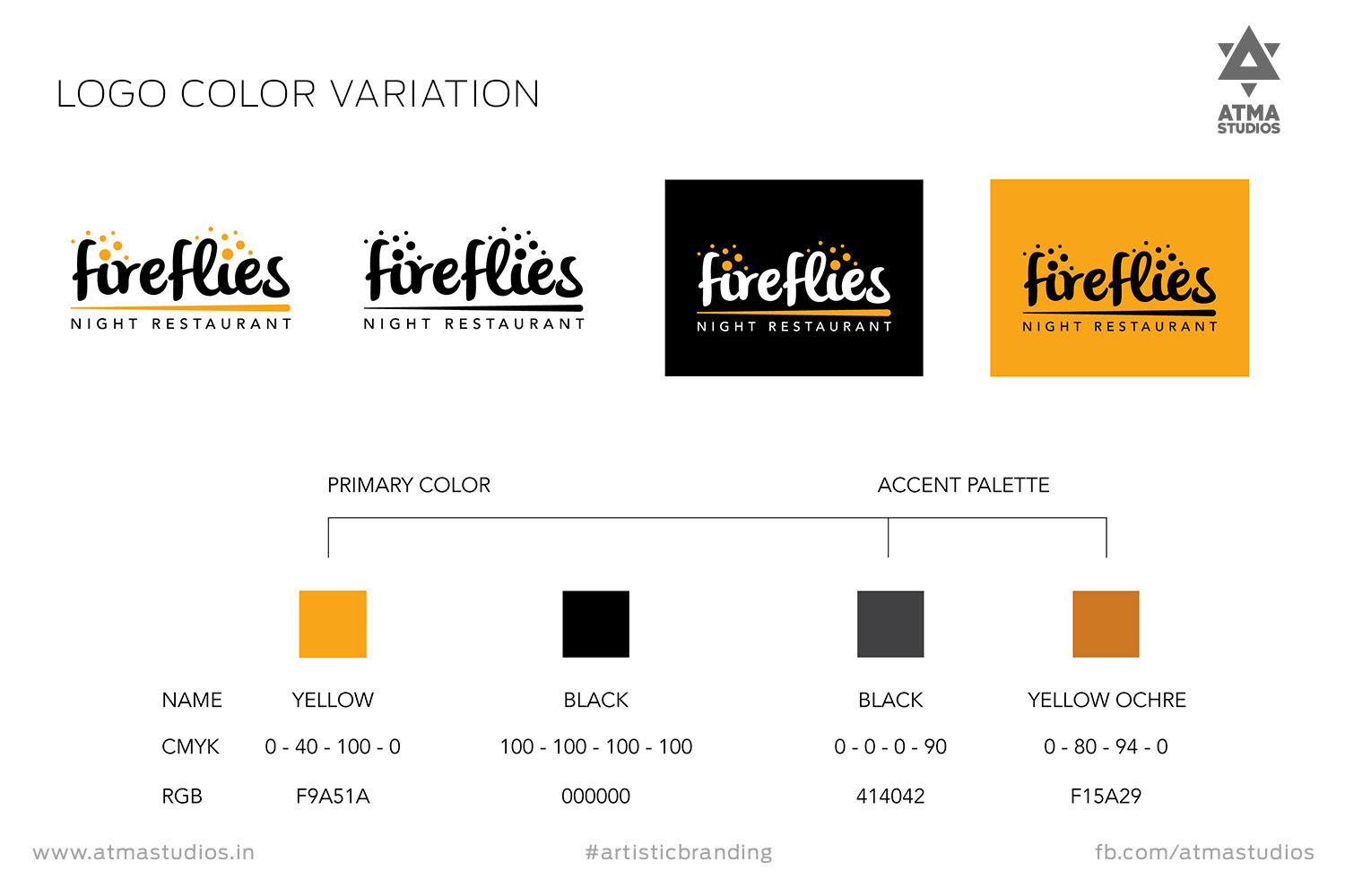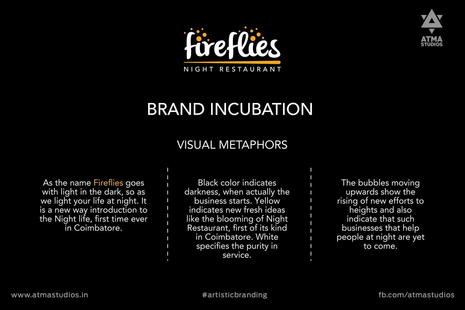 Brand Name As the name Fireflies goes with light in the dark, so as we light your life at night. It is a new way introduction to the Night life, first time ever in Coimbatore. Brand Colors Black color indicates darkness, when actually the business starts. Yellow indicates new fresh ideas like the blooming of Night Restaurant, first of its kind in Coimbatore. White specifies the purity in service. Brand Element The bubbles moving upwards show the rising of new efforts to heights and also indicate that such businesses that help people at night are yet to come.